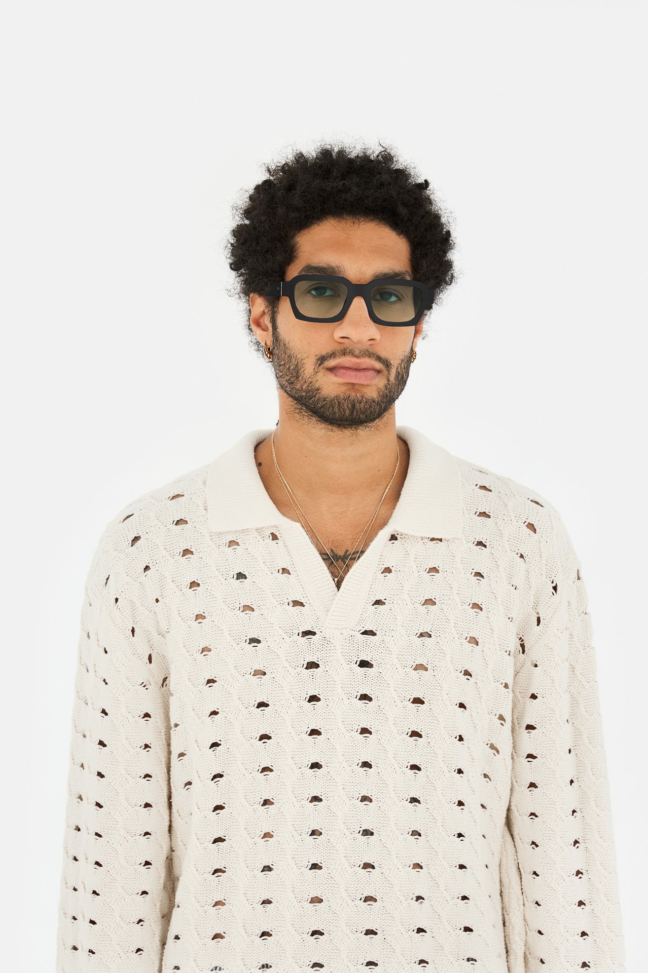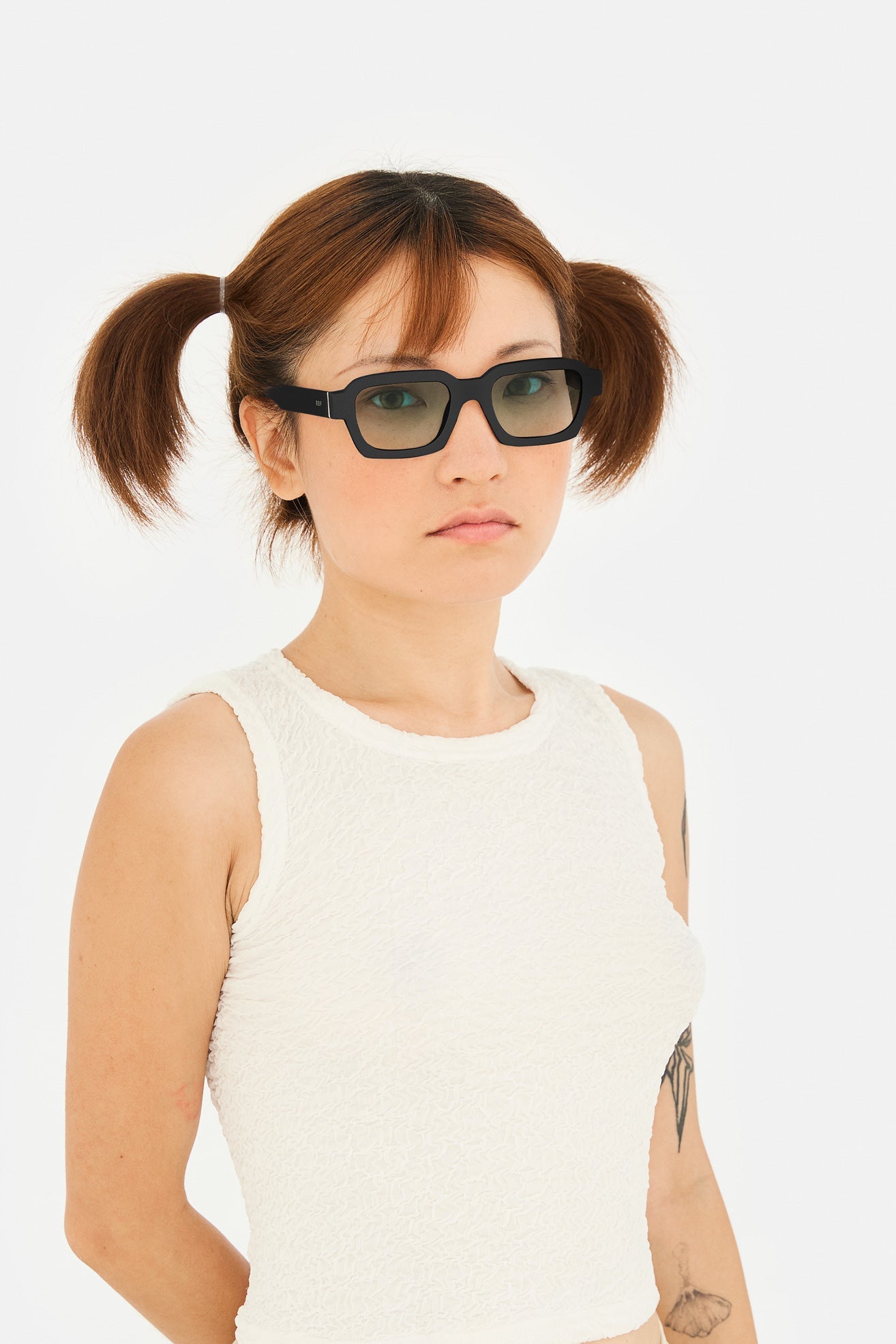 El estilo elegante y vanguardista de Caro se presenta en una nueva línea, compuesta por colores mate intensos para crear una atmósfera de puesta de sol sin fin. La clásica referencia grunge se transforma en una paleta mate suave y colorida, con su diseño icónico, marco de acetato resistente y patillas cuadradas. Esta versión de Caro está disponible en un negro mate intenso ultra suave con lentes color verde tenues.