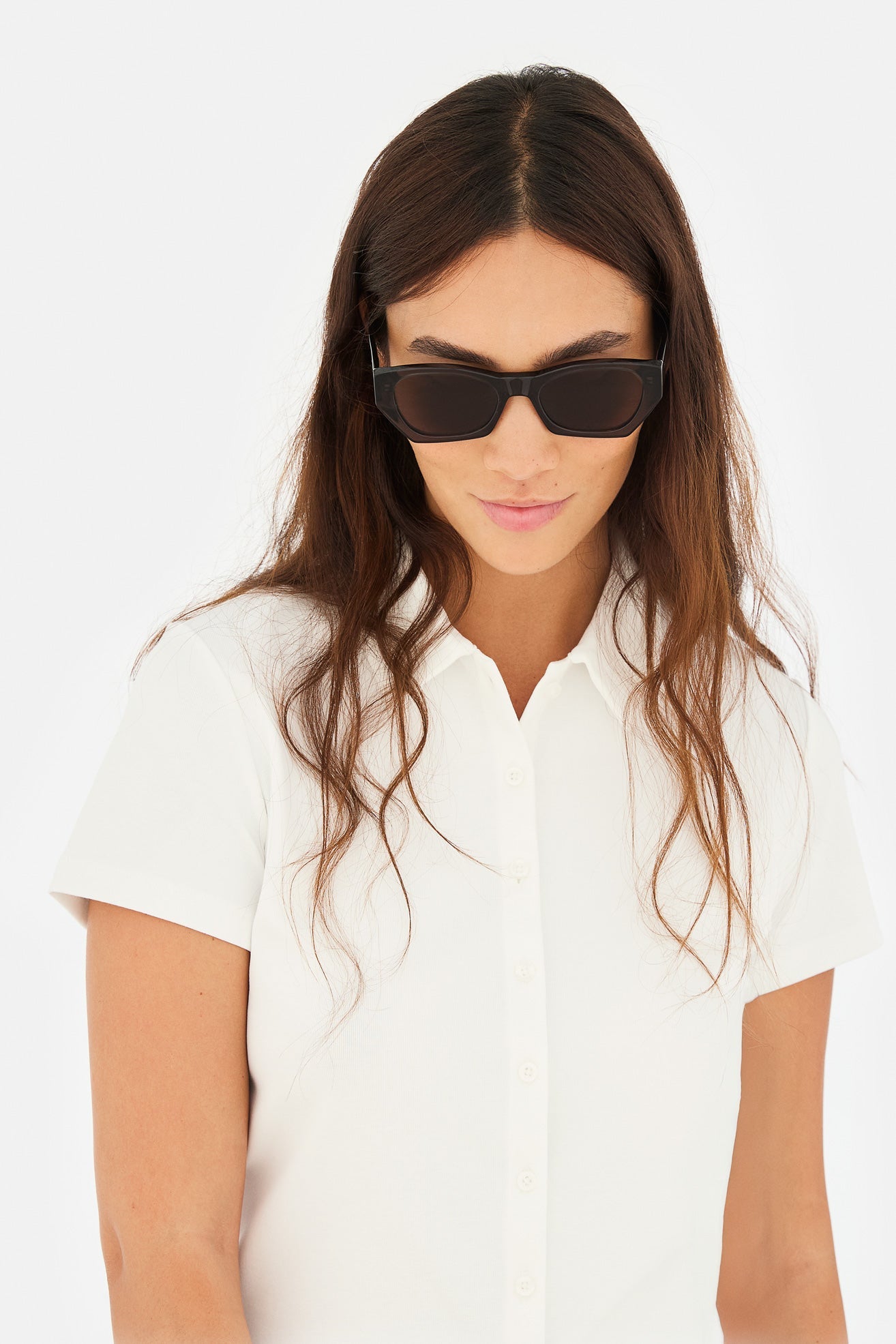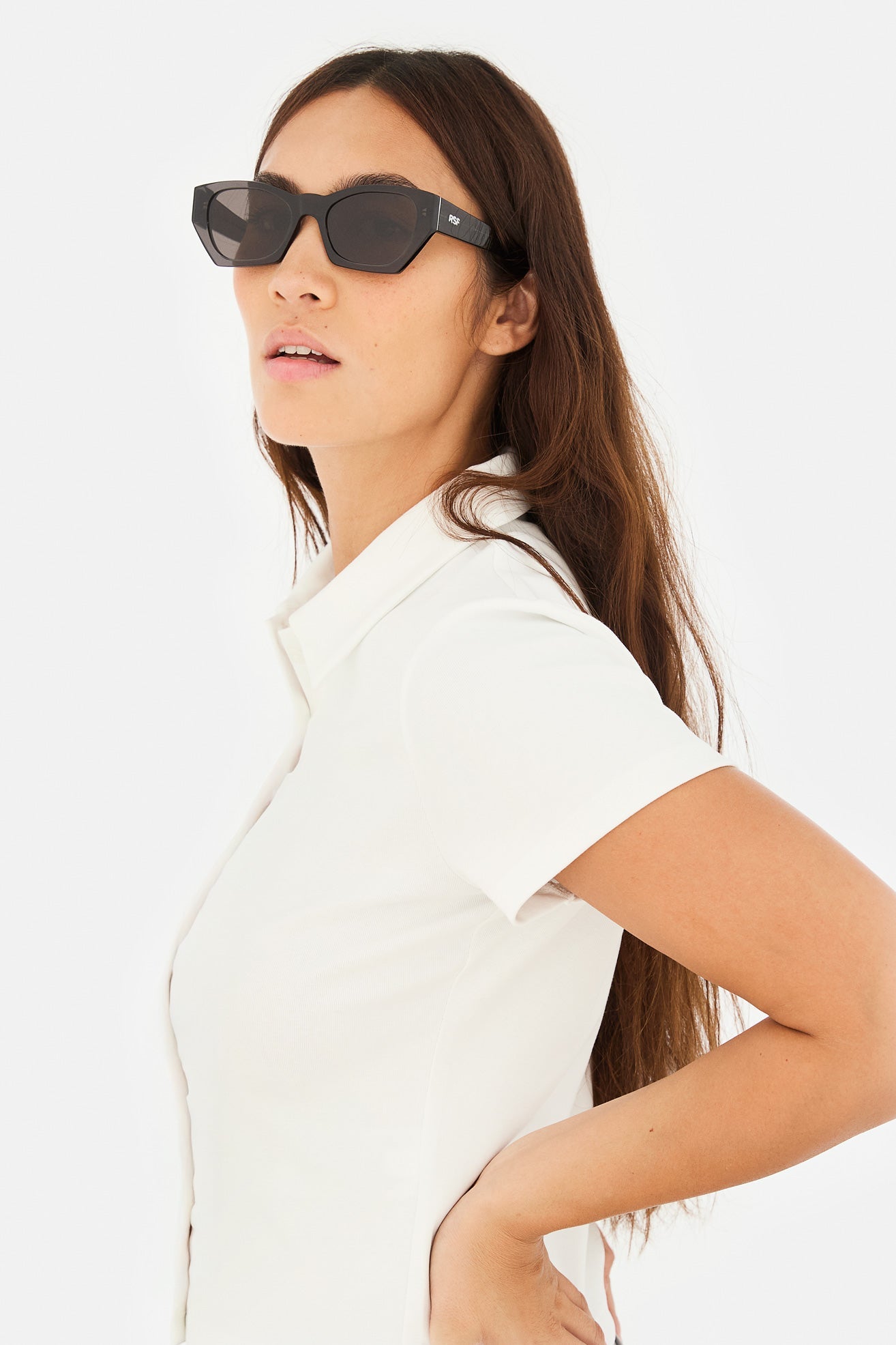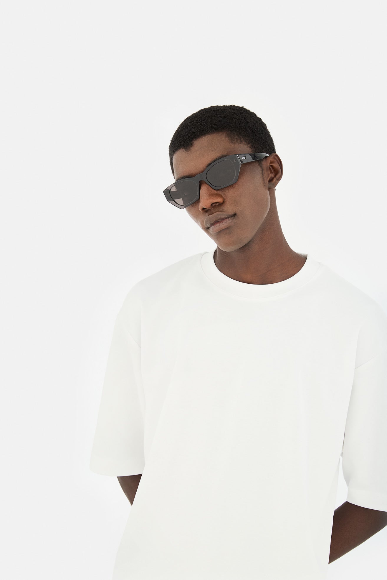 Acetato de alta calidad en acetato negro licorice translúcido. Lentes negras tono sobre tono con base 2. Gafas de alta gama diseñadas en Milán, Italia.