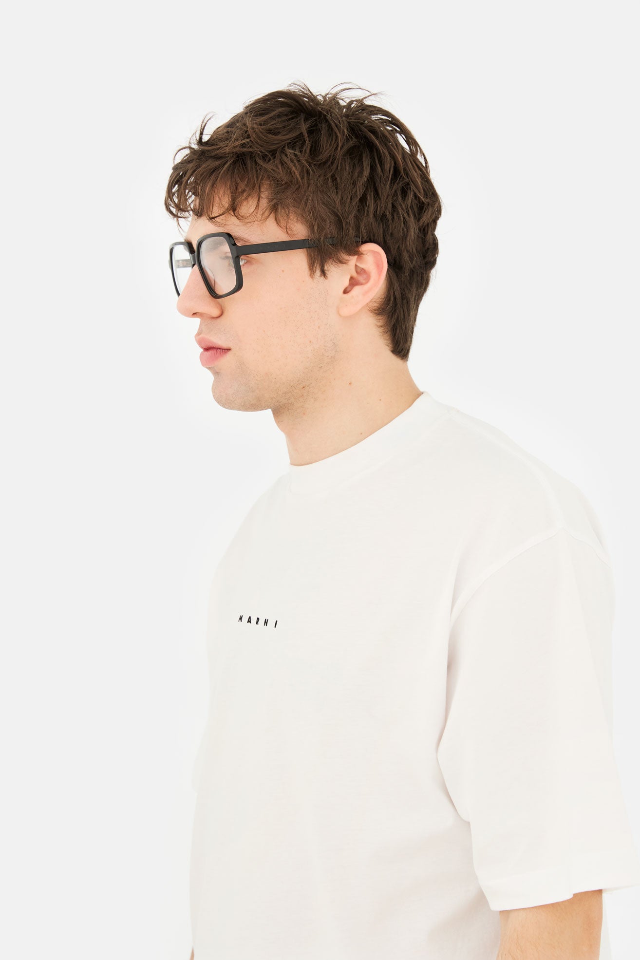 Acetato italiano de alta calidad en un negro brillante atemporal. Lentes transparentes de base 4. Lentes graduadas no incluidas. Gafas de alta gama hechas a mano en Italia.