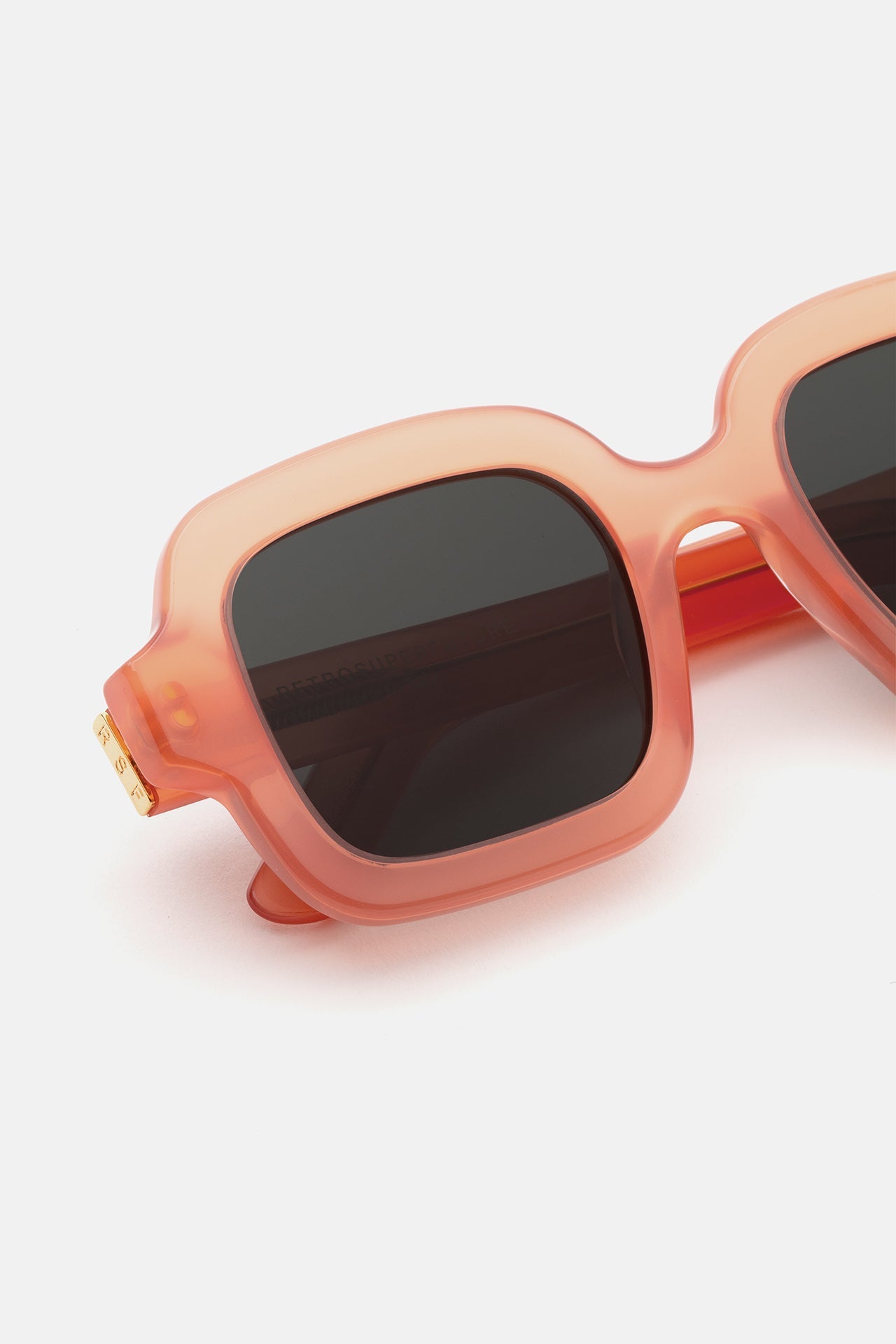 Benz es una silueta destacada que combina el estilo atemporal de los años 60 con los detalles contemporáneos. Con una montura suave y redondeada de gran tamaño, Benz captura el glamour clásico de la Riviera Mediterránea, actualizado con interiores cincelados para un diseño más ligero y moderno. La construcción del modelo parece mantecosa, suavizando sus pesados y atrevidos rasgos. Esta versión de Benz se presenta en un juguetón acetato cristalino de color melocotón con lentes tintadas en marrón.