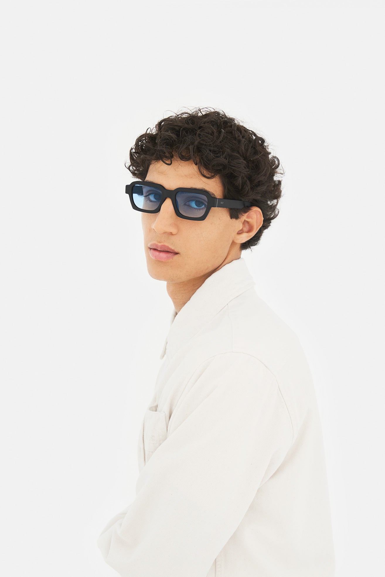 El estilo elegante y vanguardista de Caro se presenta en una nueva línea, compuesta por colores mate intensos para crear una atmósfera de puesta de sol sin fin. La clásica referencia grunge se transforma en una paleta mate suave y colorida, con su diseño icónico, marco de acetato resistente y patillas cuadradas. Esta versión de Caro está disponible en un negro mate intenso ultra suave con lentes color azul