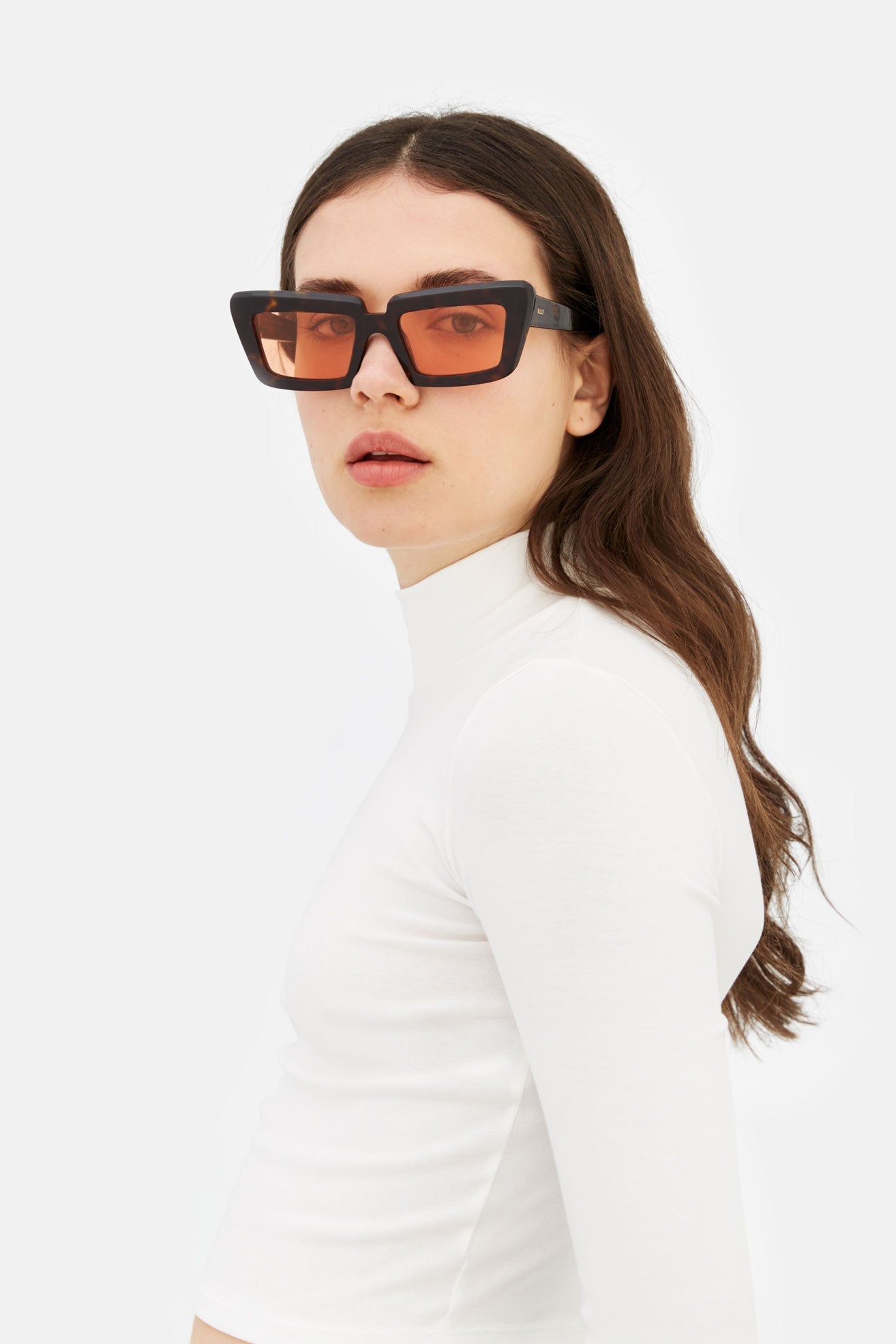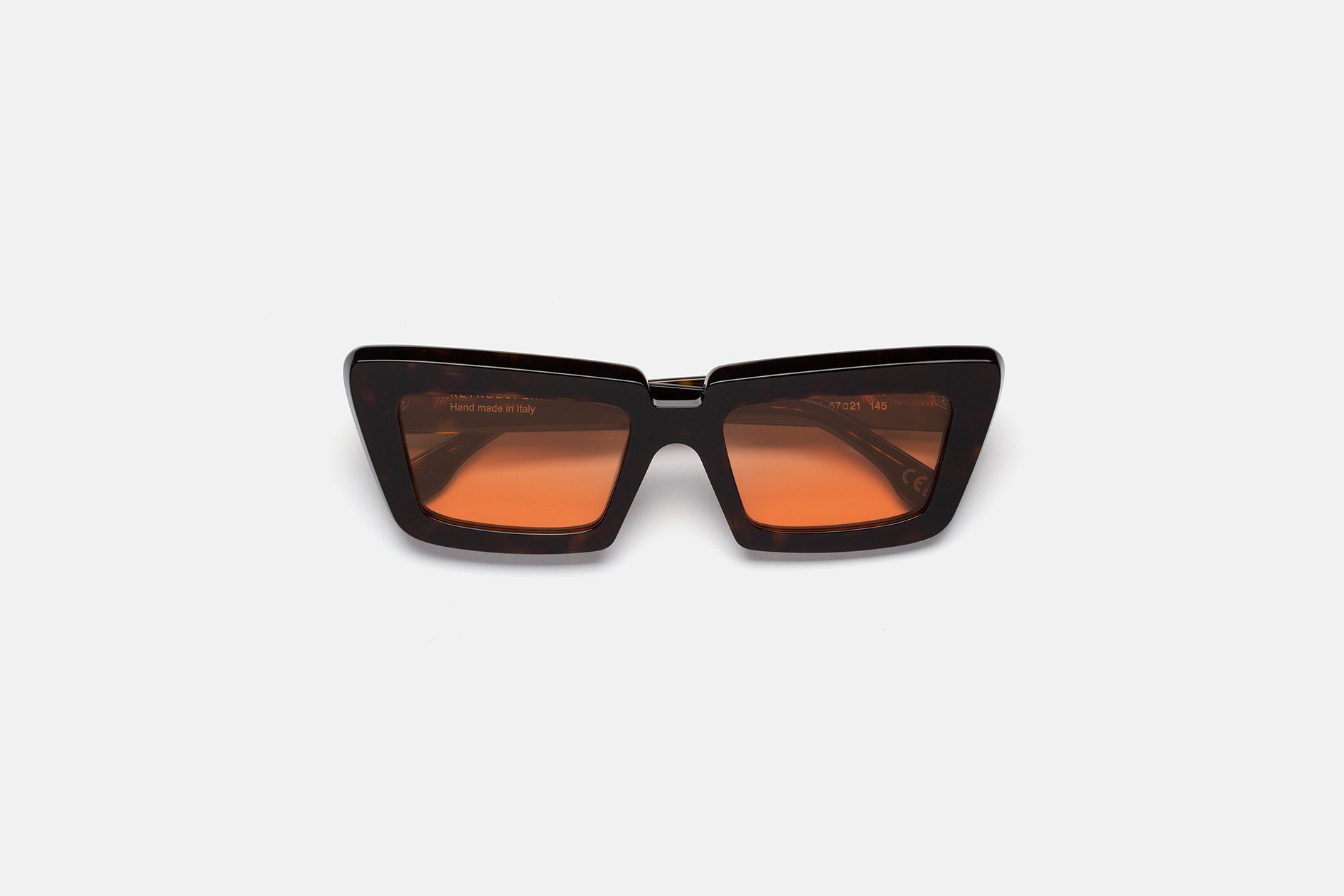 Coccodrillo es una silueta destacada concebida como una montura moderna y atrevida. Una pieza experimental e innovadora, Coccodrillo es una forma deliberadamente sobredimensionada con gruesos bordes puntiagudos. Con geometrías precisas y bordes inclinados, este modelo rezuma carácter. Esta divertida versión de Coccodrillo se presenta en acetato habano moteado con cristales tintados en naranja brillante.