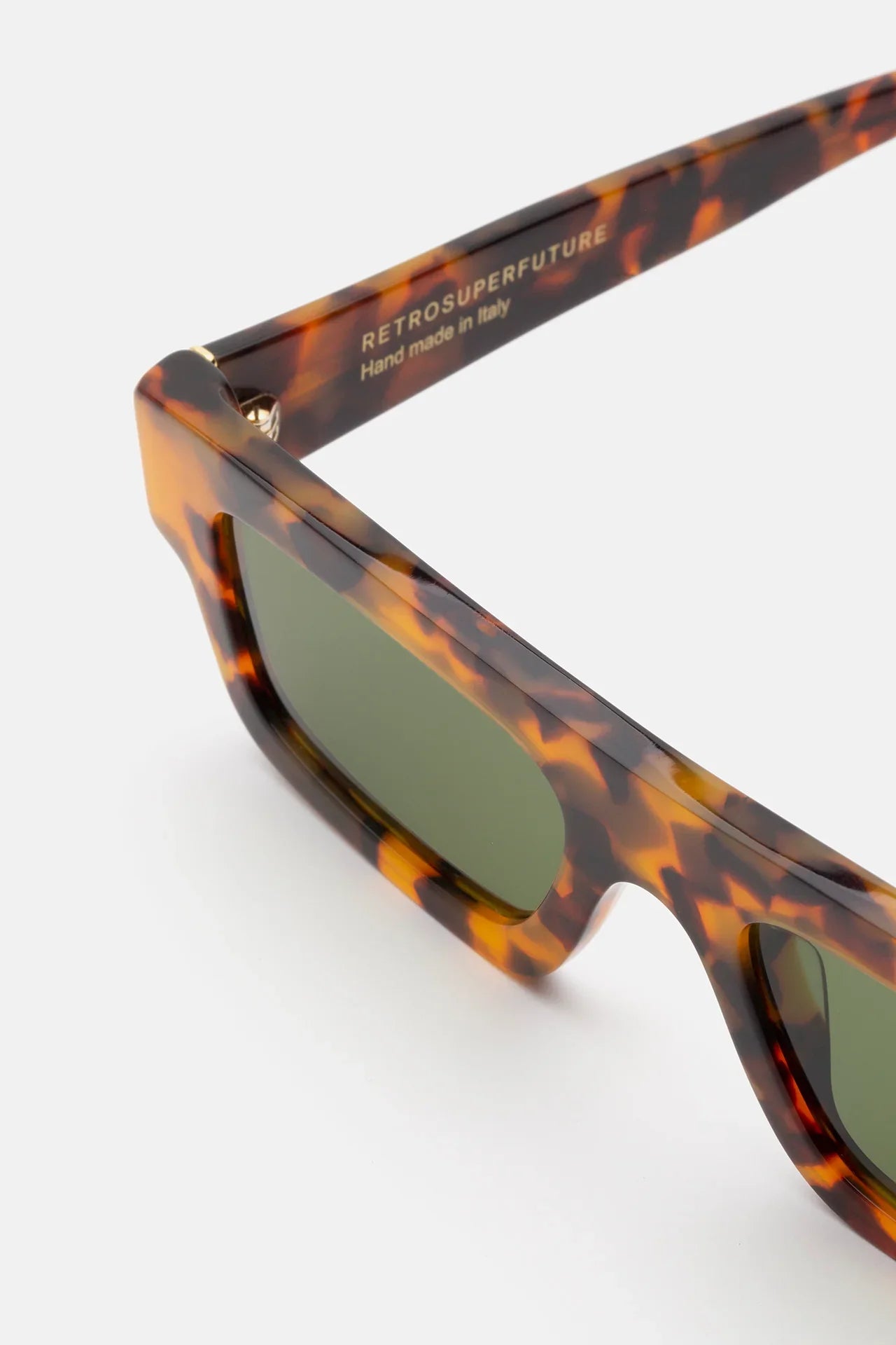 Colpo es una silueta icónica contemporánea que fusiona las referencias vintage con el zeitgeist actual. Con su perfil bajo y compacto, Colpo se inspira tanto en las gruesas monturas de los años 60 como en las visiones futuristas. Su línea de cejas recta y afilada la convierte en una pieza de referencia. Colpo será el modelo omnipresente y destacado de la temporada, visto en las calles de Milán y París, Nueva York y Tokio. Esta versión de Colpo se presenta en acetato habano con lentes verde botella.
