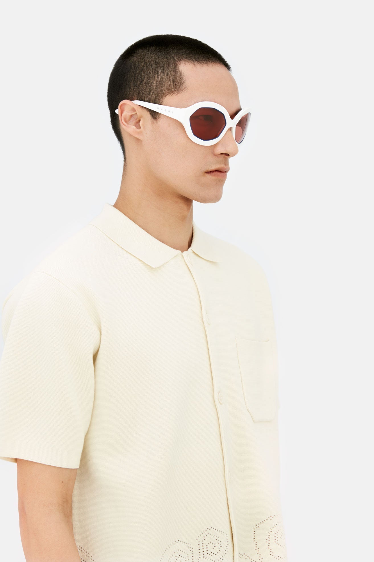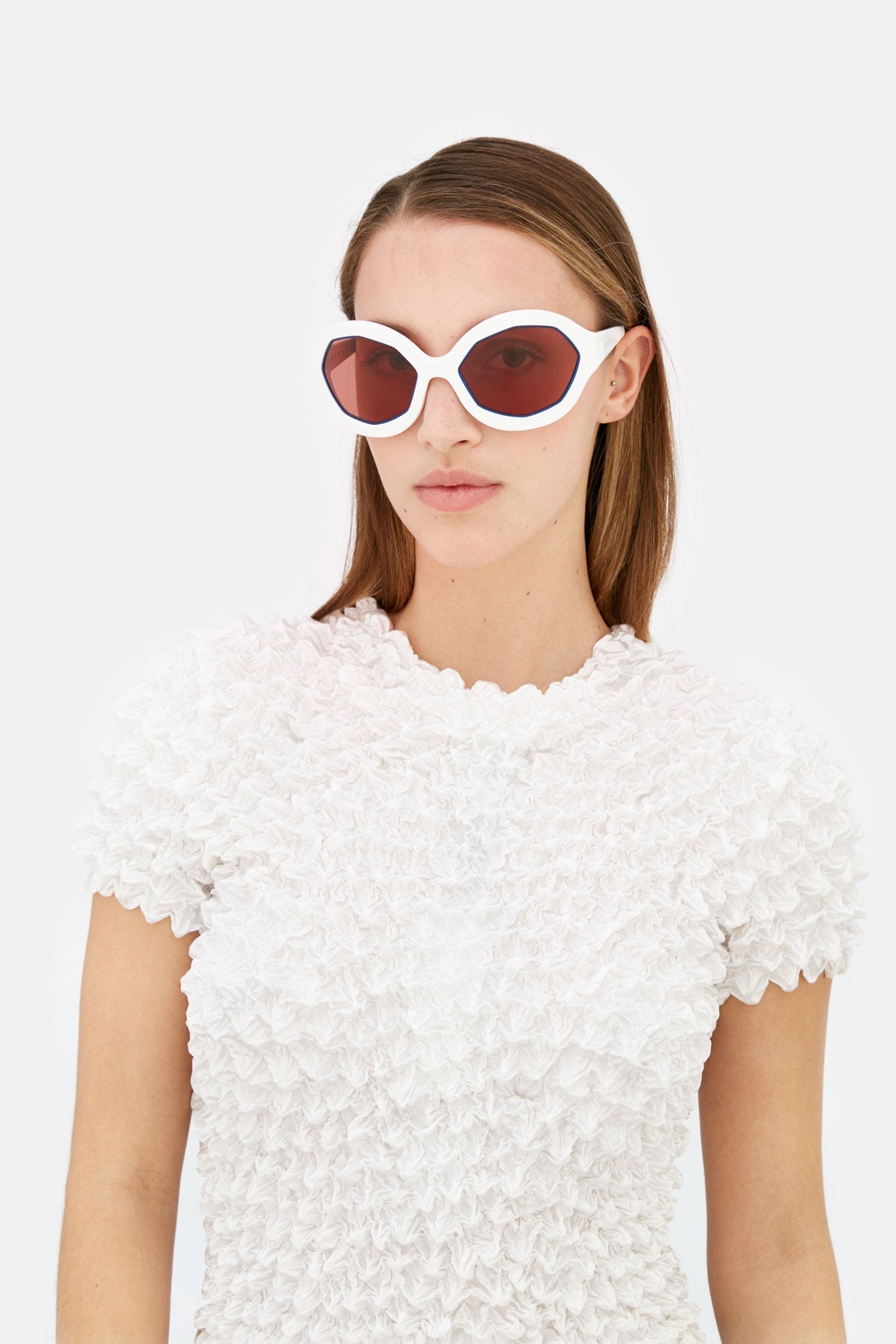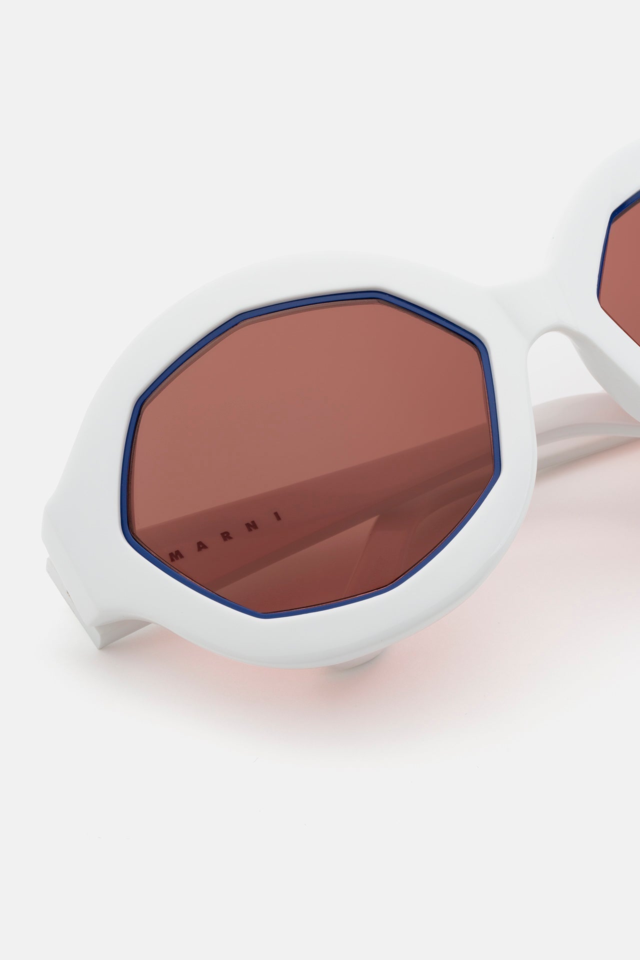 Una silueta exclusiva diseñada para Marni, Cumulus Cloud captura la esencia extravagante de la marca italiana de culto. Inspirada en la cultura pop, con sus colores atrevidos, formas aerodinámicas y materiales plásticos brillantes, Cumulus Cloud es la silueta oversize definitiva. Presenta un diseño redondeado con amplias lentes encerradas en anillos octogonales y engastadas en una estructura envolvente de acetato. Esta versión se presenta en acetato blanco brillante con detalles en azul brillante y lentes tintadas en marrón.