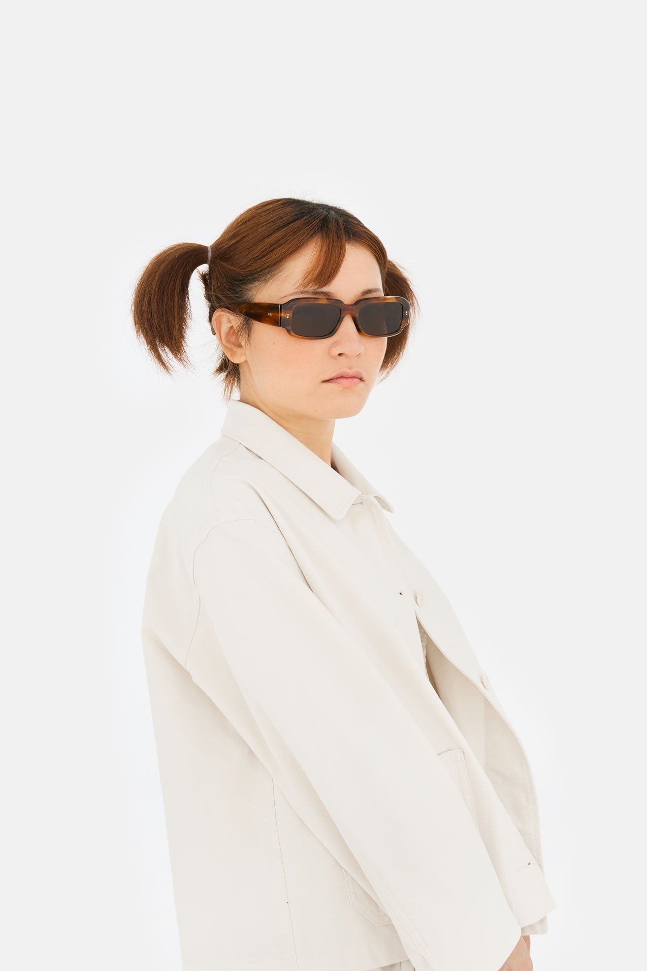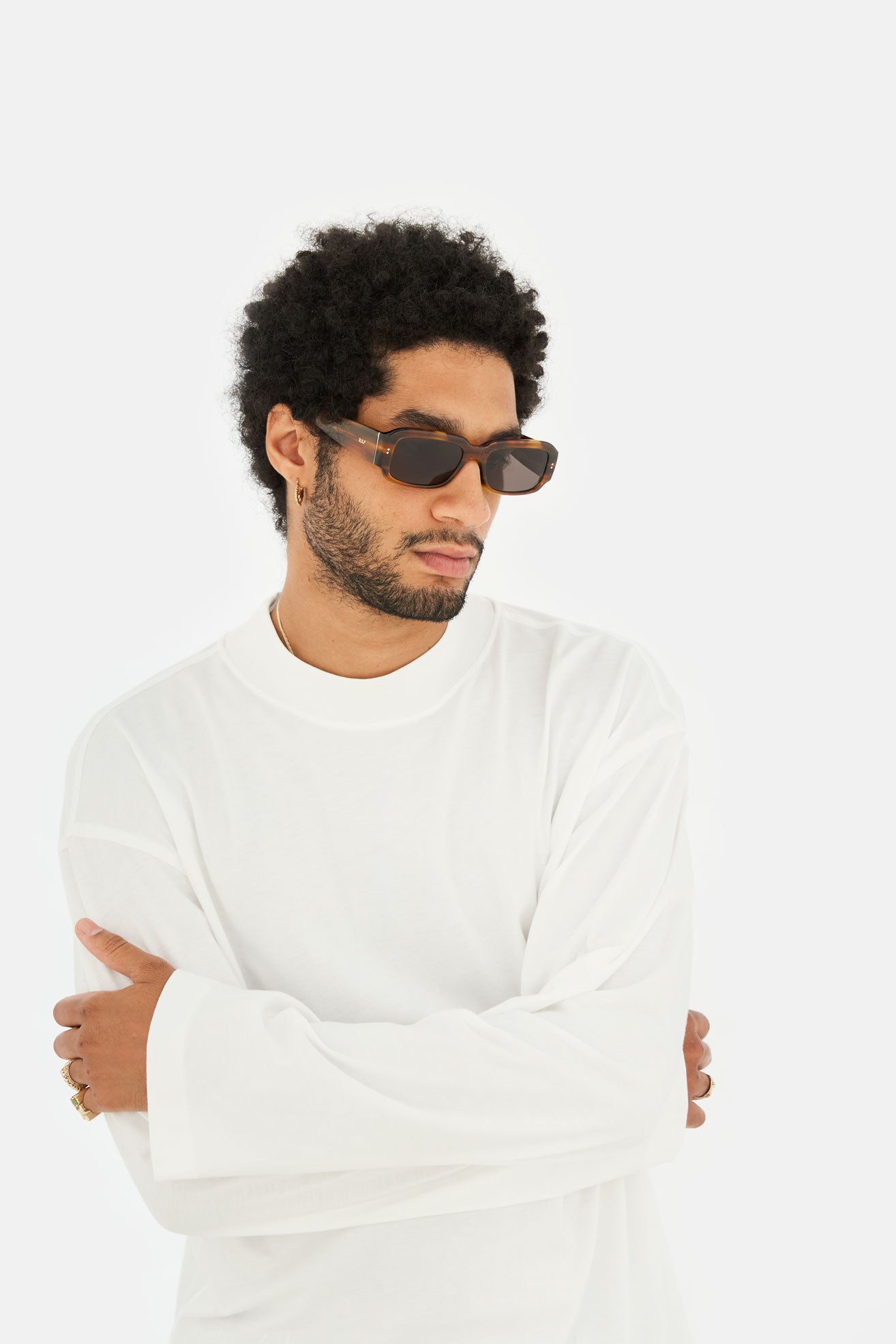 Suave pero vanguardista, redondeado pero cuadrado, Etrusco combina un diseño de inspiración retro con una actitud muy contemporánea y relajada. Sus lentes rectangulares anchas y bajas y sus patillas altas y resistentes están meticulosamente diseñadas para lograr superficies únicas, ultrasuaves y lisas. Para esta versión del Etrusco, se combina un exclusivo y rico acetato de tortuga con lentes ahumados esenciales. Hecho a mano en Italia.