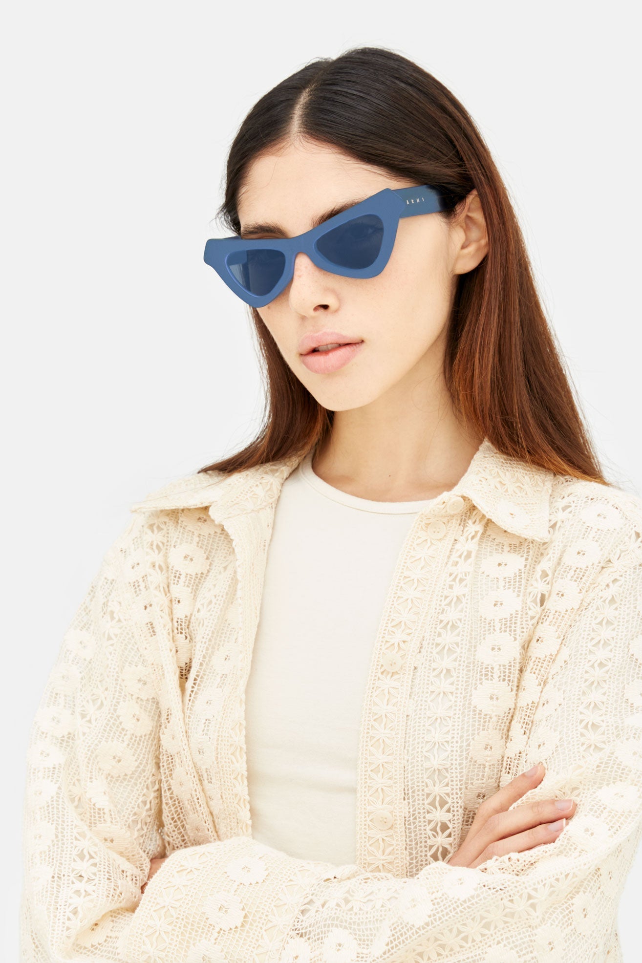 Diseñada en exclusiva para Marni, Uyuni Desert es una forma icónica creada como una atrevida interpretación geométrica de las clásicas monturas de ojo de gato. La reconocible silueta del modelo presenta bordes afilados y puntiagudos que encierran lentes triangulares. El robusto puente y las gruesas patillas completan la geometría única de esta pieza. Esta versión se presenta en acetato azul brillante con lentes a juego.
