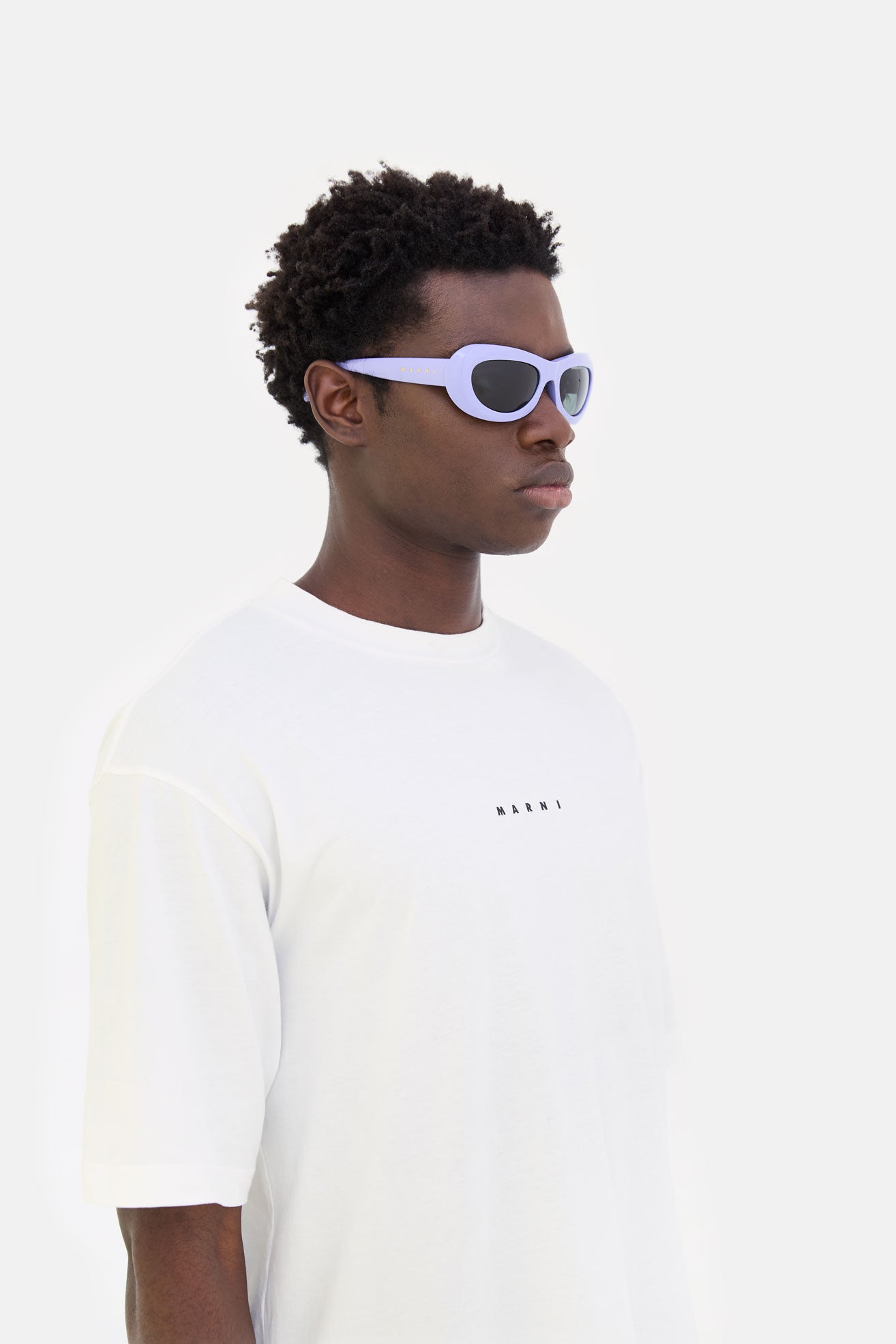 Diseñado exclusivamente para Marni, Field of Rushes es una silueta redondeada pero compacta caracterizada por un puente nasal bajo y lentes ovaladas.La característica clave del modelo son sus bordes de acetato extragruesos, fresados alrededor de los bordes para formar una forma redondeada y elegante.Las resistentes patillas con el logotipo de Marni grabado completan la pieza.Esta versión se presenta en acetato de color lila brillante con lentes verdes y adornos dorados.