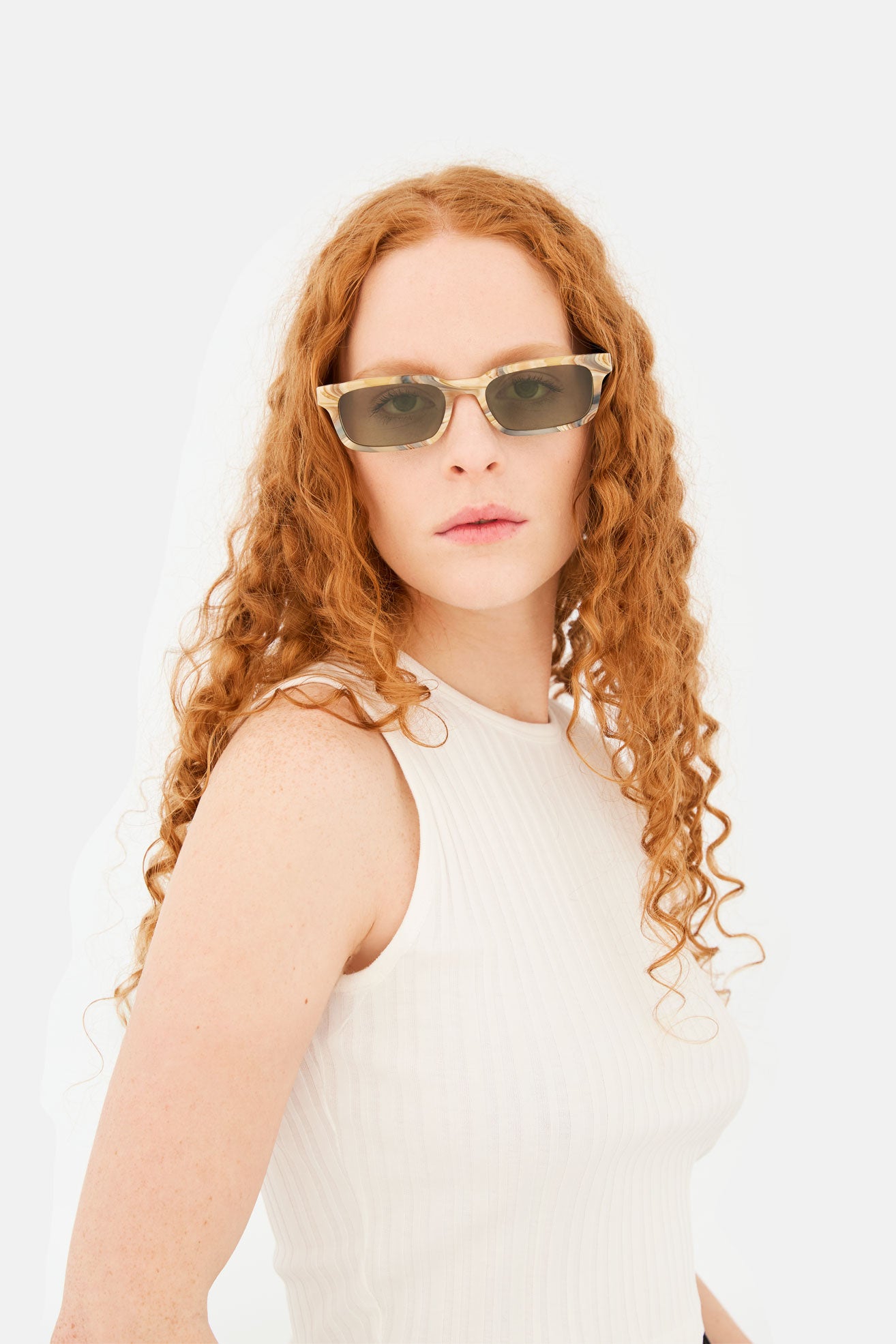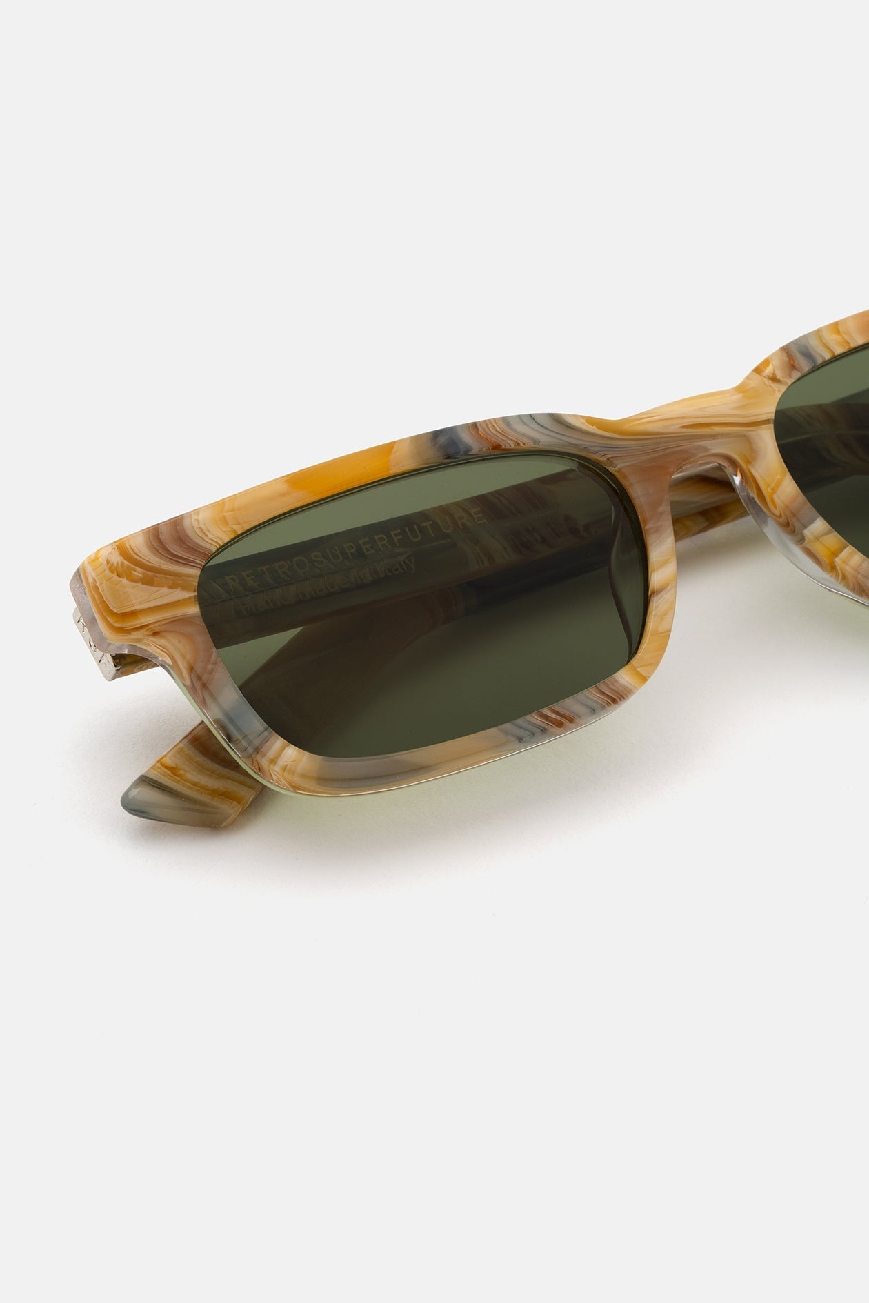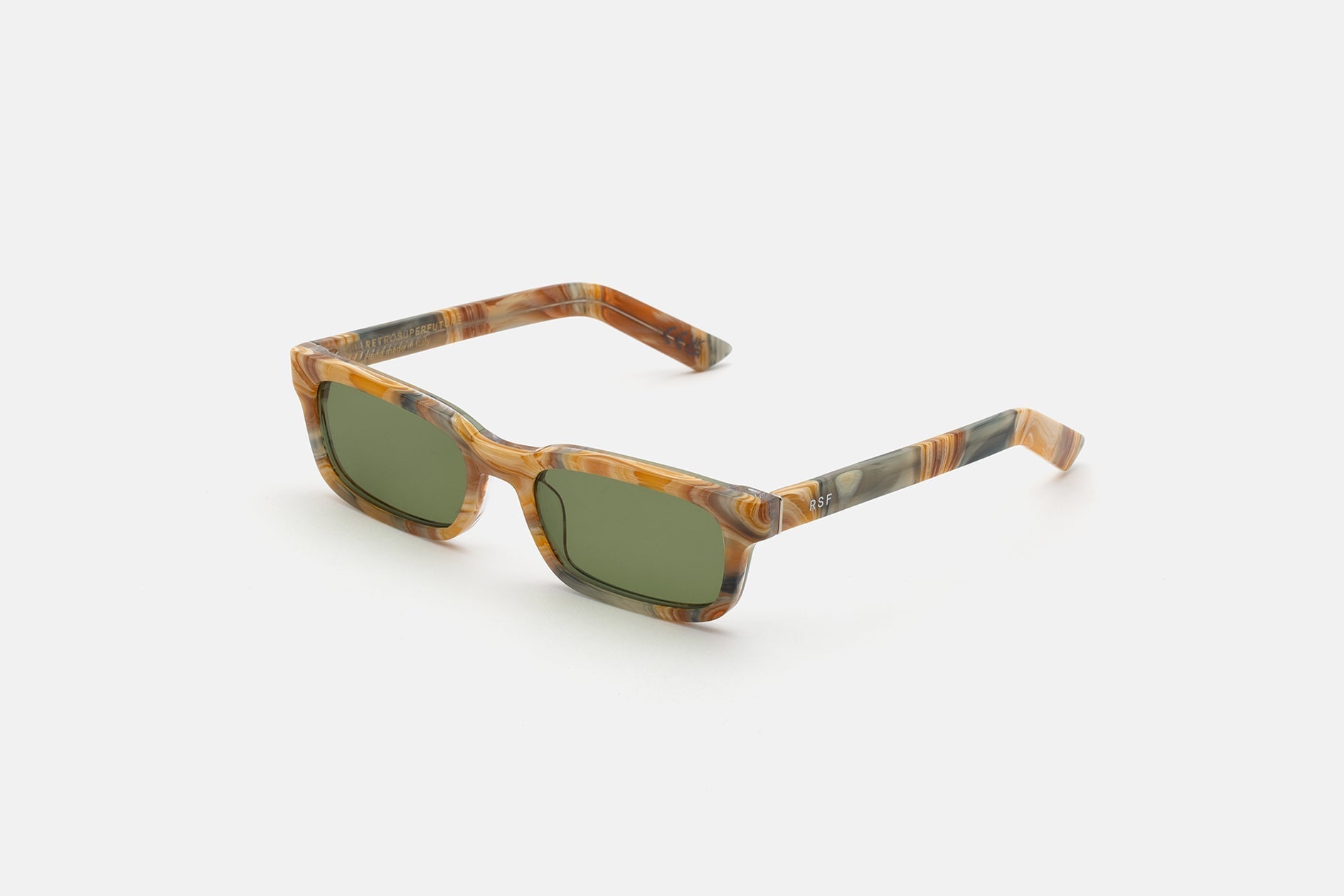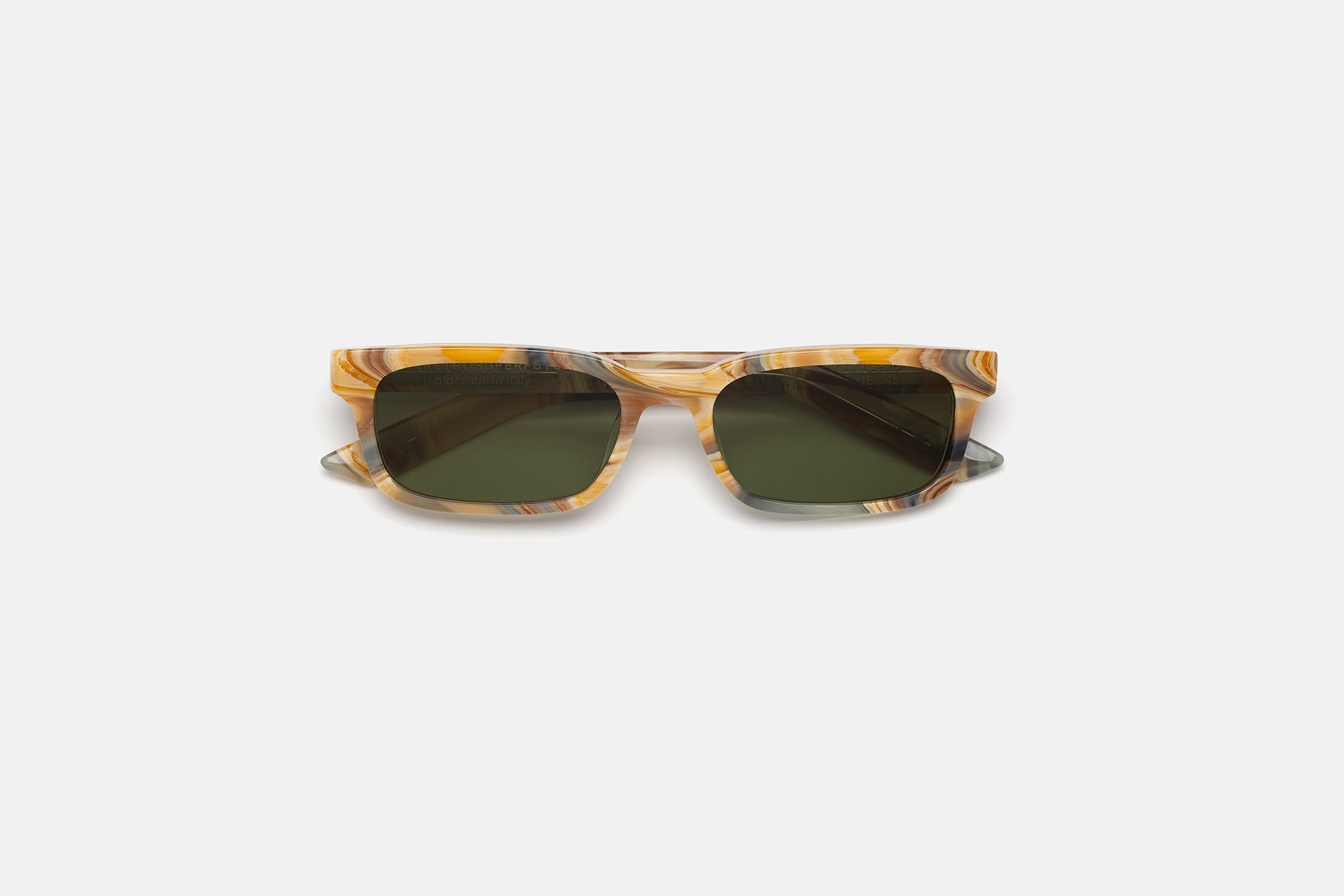 Acetato italiano de alta calidad con un rico y alucinante diseño marmóreo. Elegantes lentes verdes Zeiss en base 2. Gafas de alta gama hechas a mano en Italia.