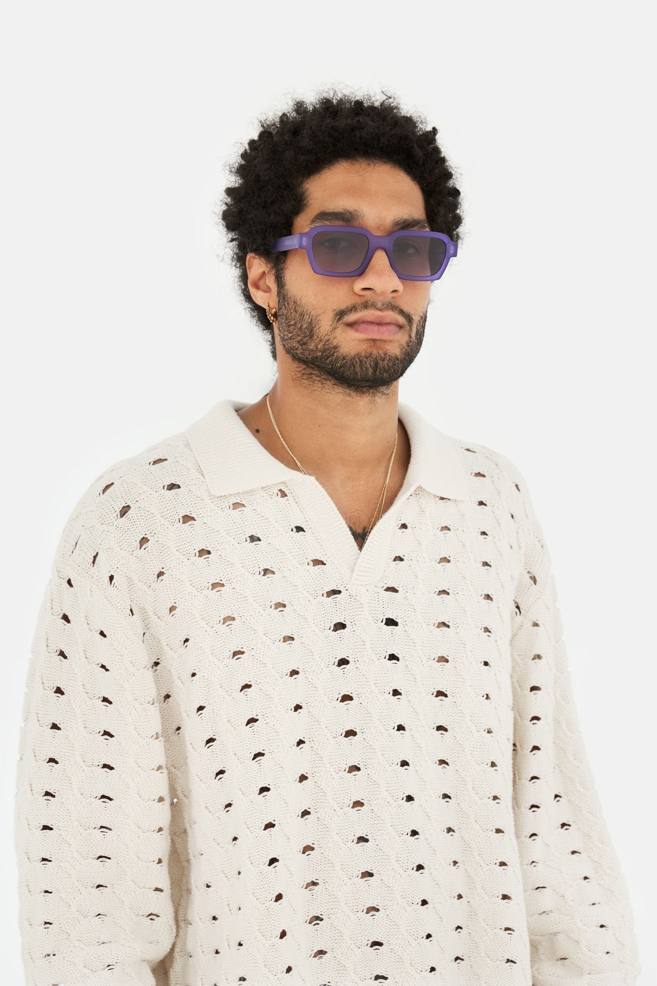 El estilo elegante y vanguardista de Caro se presenta en una nueva línea, compuesta por colores mate intensos para crear una atmósfera de puesta de sol sin fin. La clásica referencia grunge se transforma en una paleta mate suave y colorida, con su diseño icónico, marco de acetato resistente y patillas cuadradas. Esta versión de Caro está disponible en un morado intenso mate ultra suave con lentes desteñidas a juego.