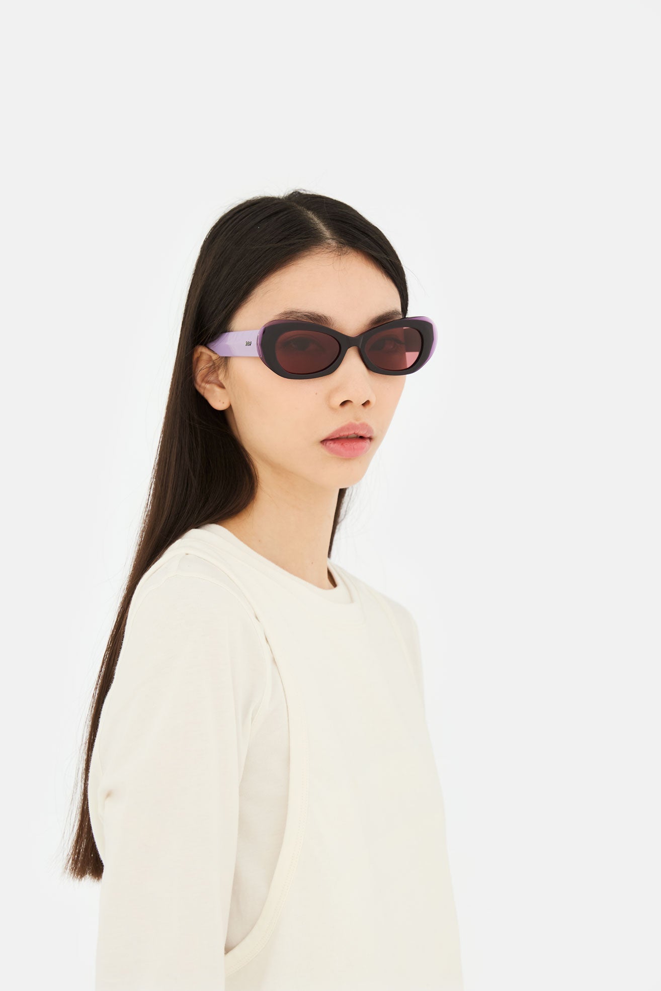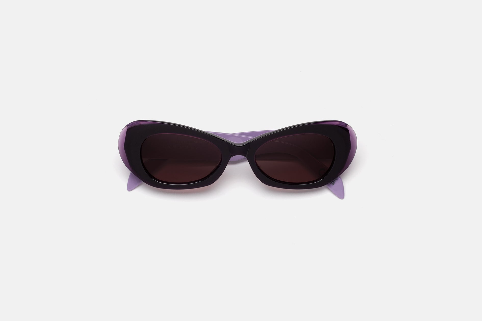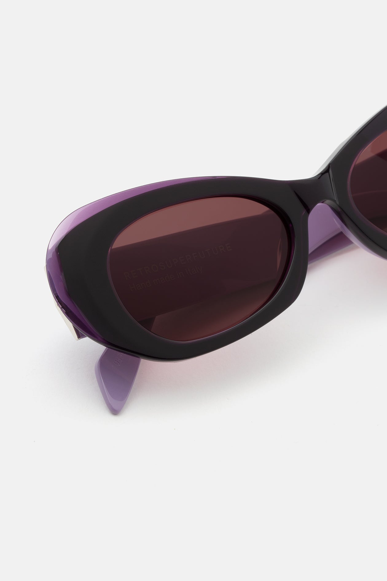 Acetato italiano de alta calidad en una fusión única de lila suave, rematado con acetato cristal berenjena oscuro. Lentes Zeiss a juego de base 6. Gafas de alta gama hechas a mano en Italia.