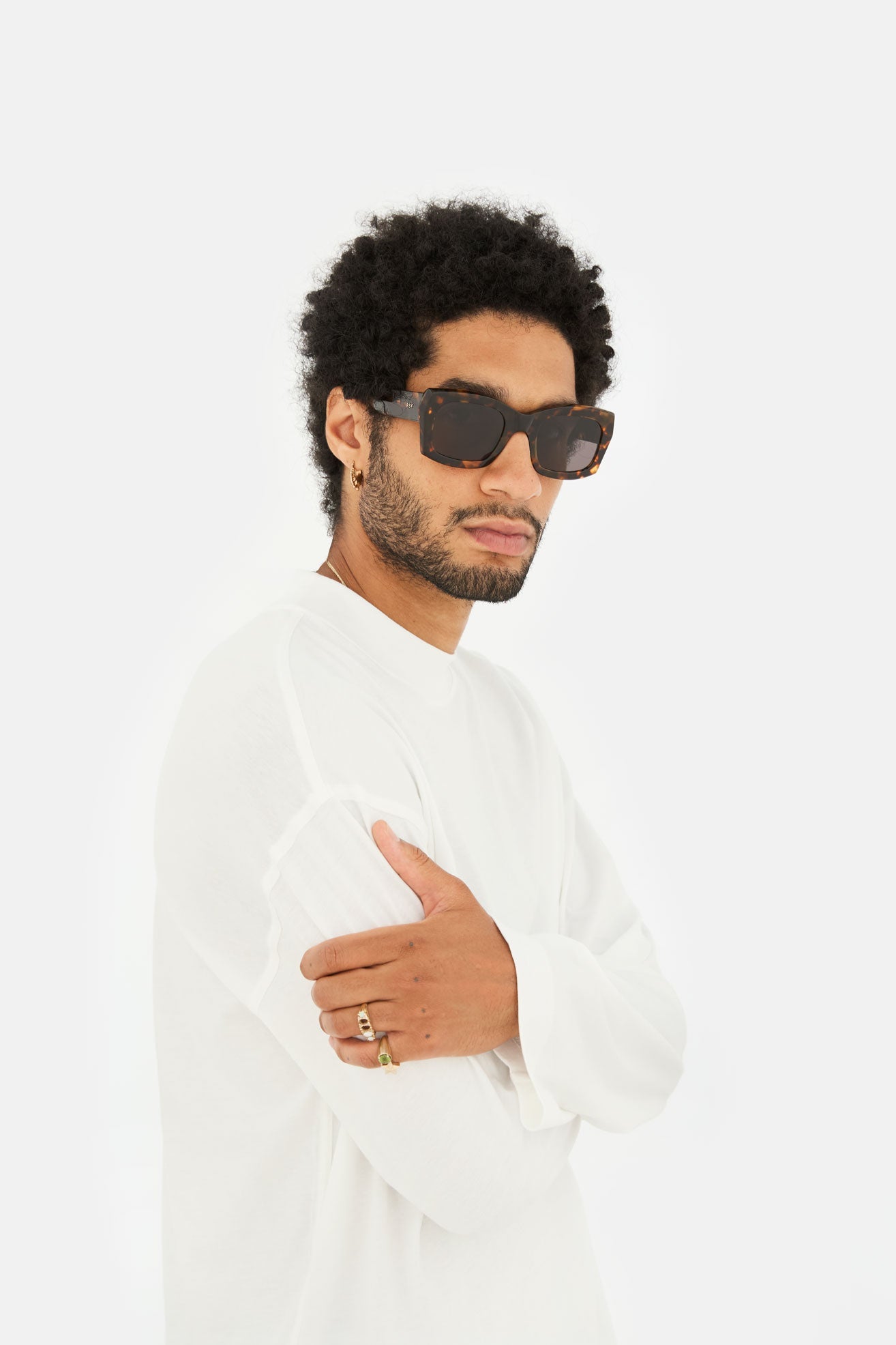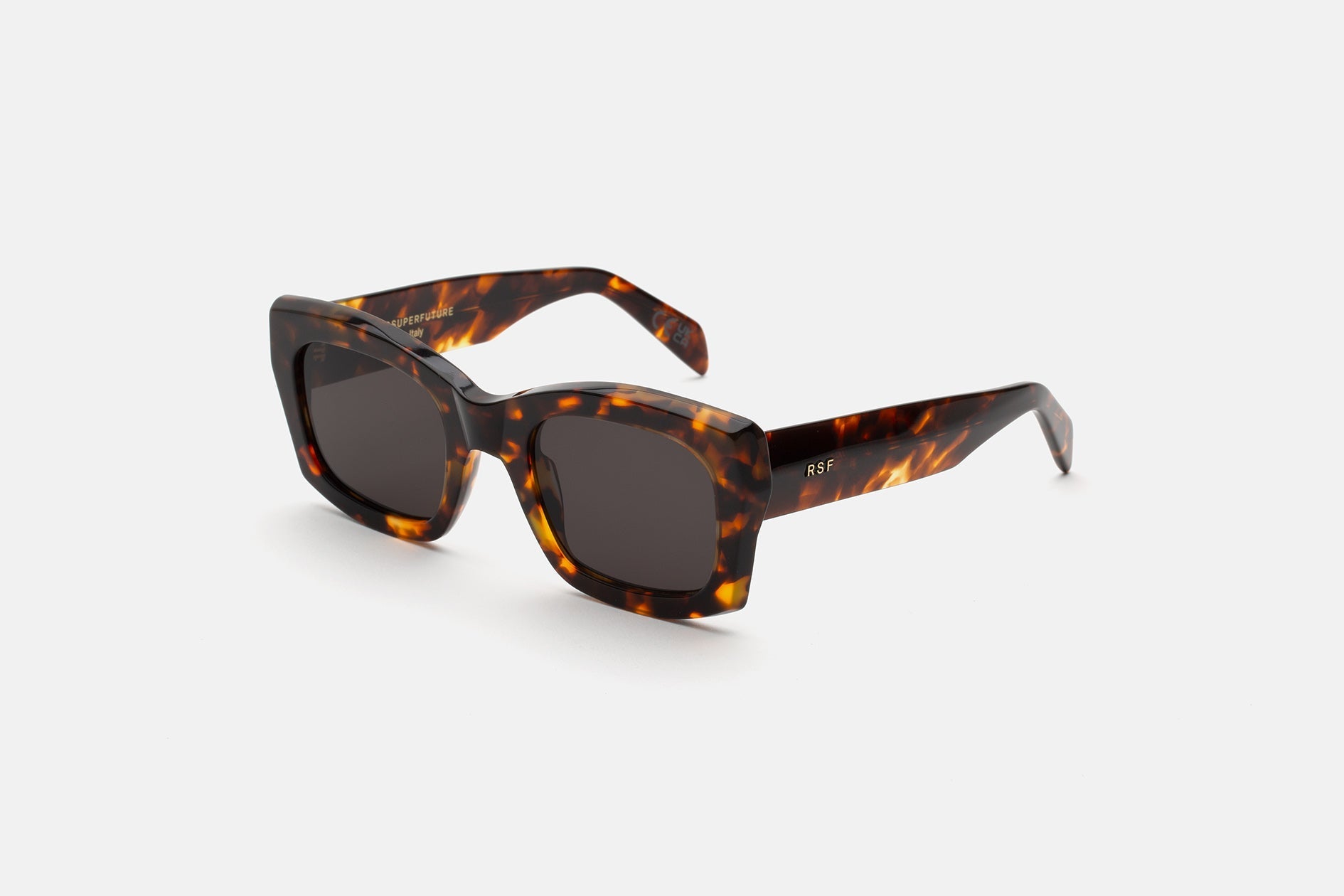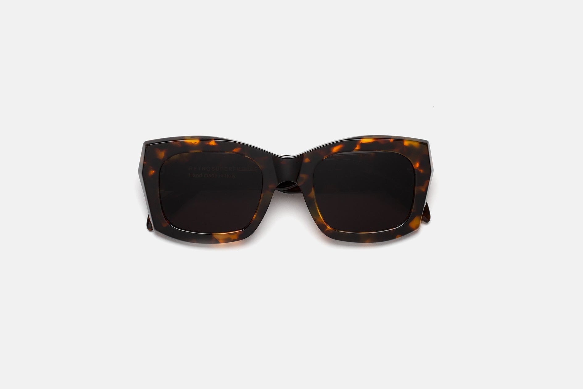 Komori es una montura de acetato robusta y de gran tamaño con un diseño hipergeométrico único que se extiende hasta las patillas. Su montura de acetato de caparazón de tortuga se combina con lentes Zeiss negras atemporales para crear una pieza versátil y llamativa. Hecho a mano en Italia.