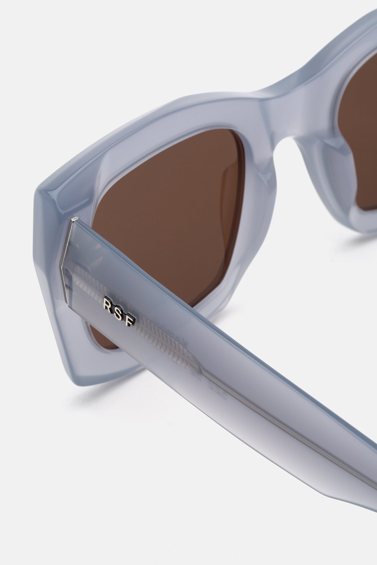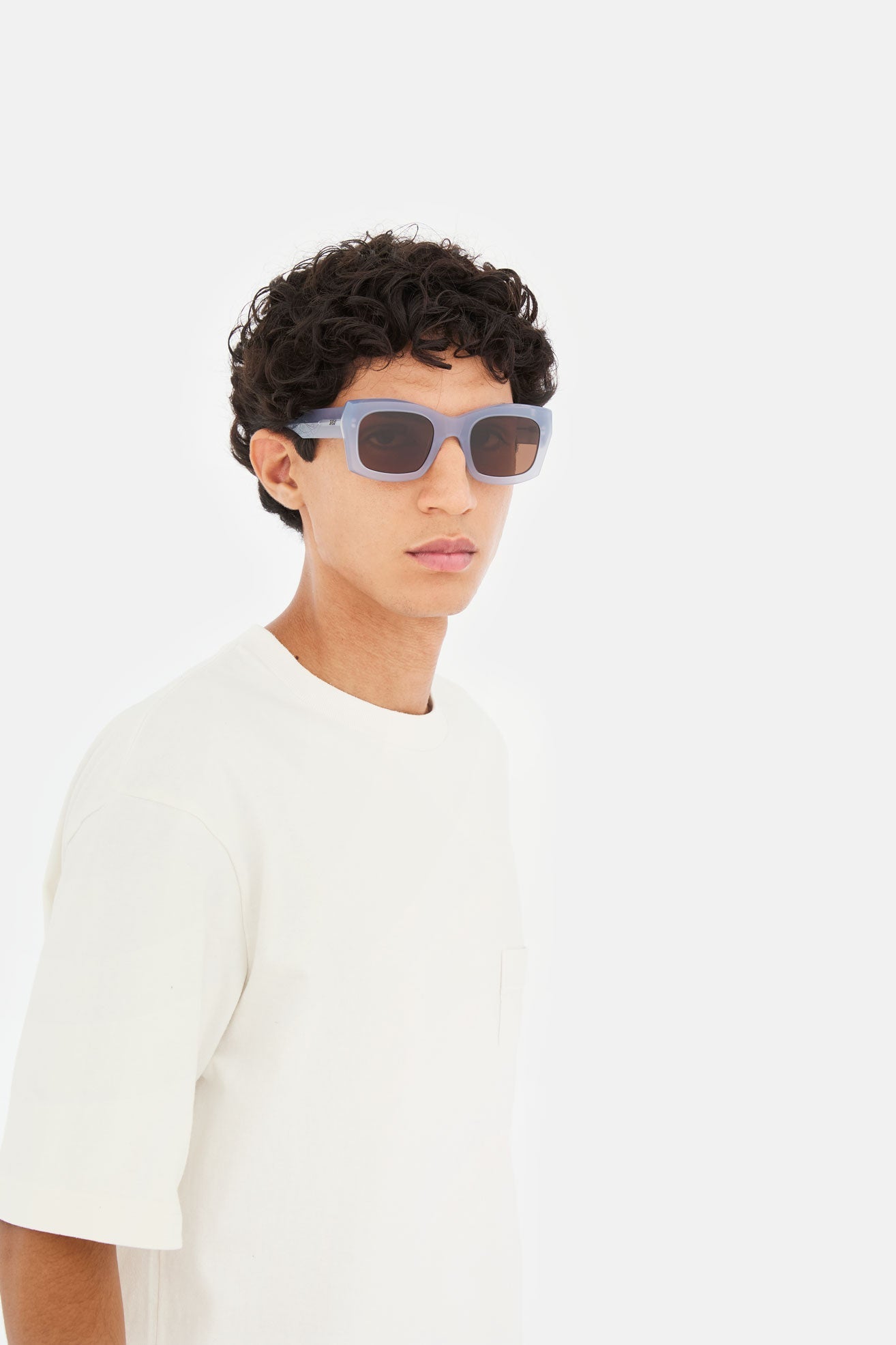 Komori es una montura de acetato robusta y de gran tamaño con un diseño hipergeométrico único que se extiende hasta las patillas. Su montura de acetato azul denim suave se combina con lentes marrones distintivas para una pieza versátil y llamativa. Hecho a mano en Italia.