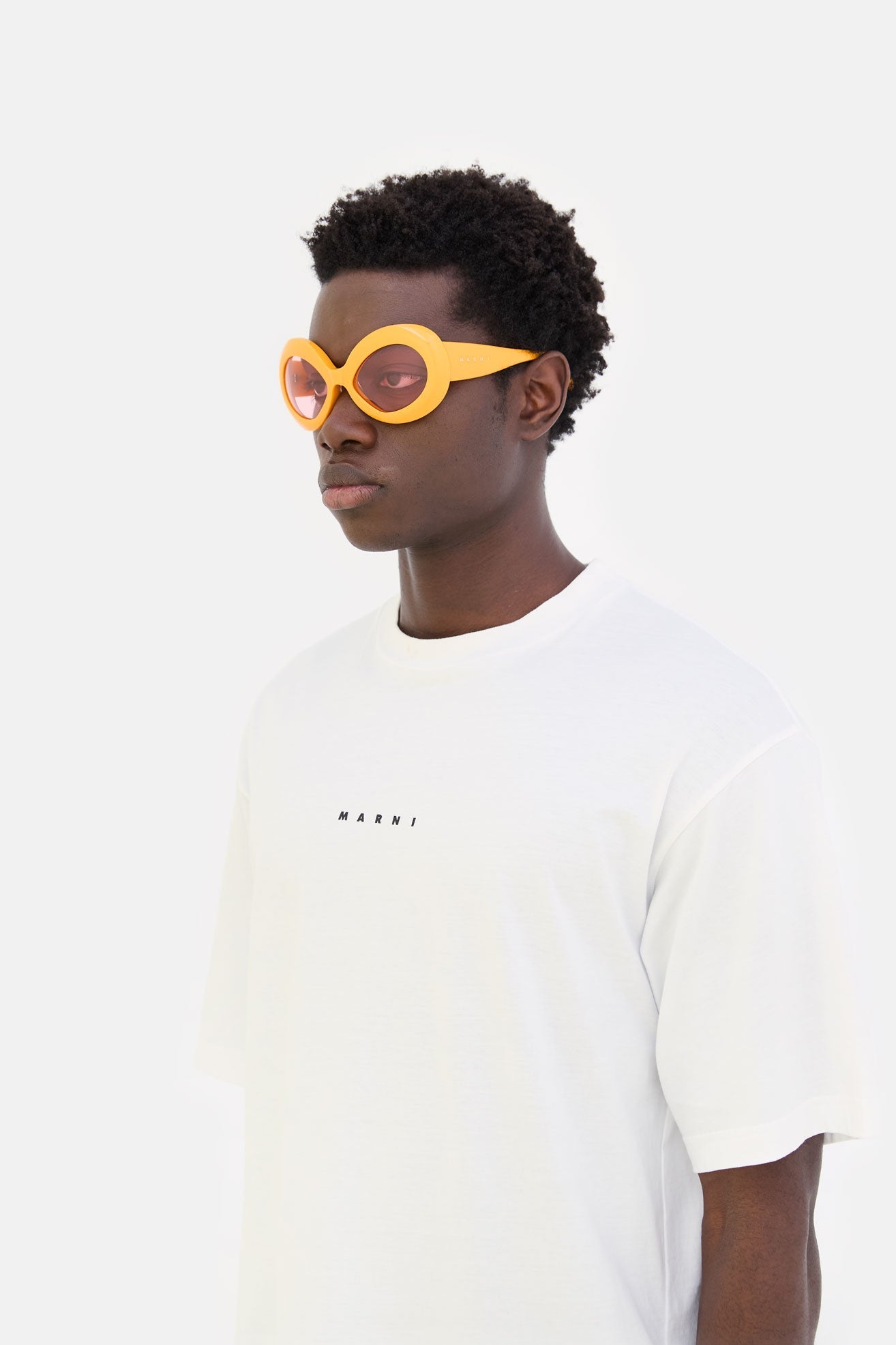 Diseñada exclusivamente para Marni, Lake of Fire es una silueta extragrande concebida como una forma redondeada y envolvente.El modelo presenta una lente redondeada exagerada encerrada dentro de marcos gruesos.El diseño burbujeante de las monturas, pulidas hasta obtener un acabado brillante, confiere a estas gafas de sol su carácter único.Las patillas gruesas pero elegantes con el logotipo de Marni grabado completan este divertido modelo naranja.Esta versión viene con lentes rosas.