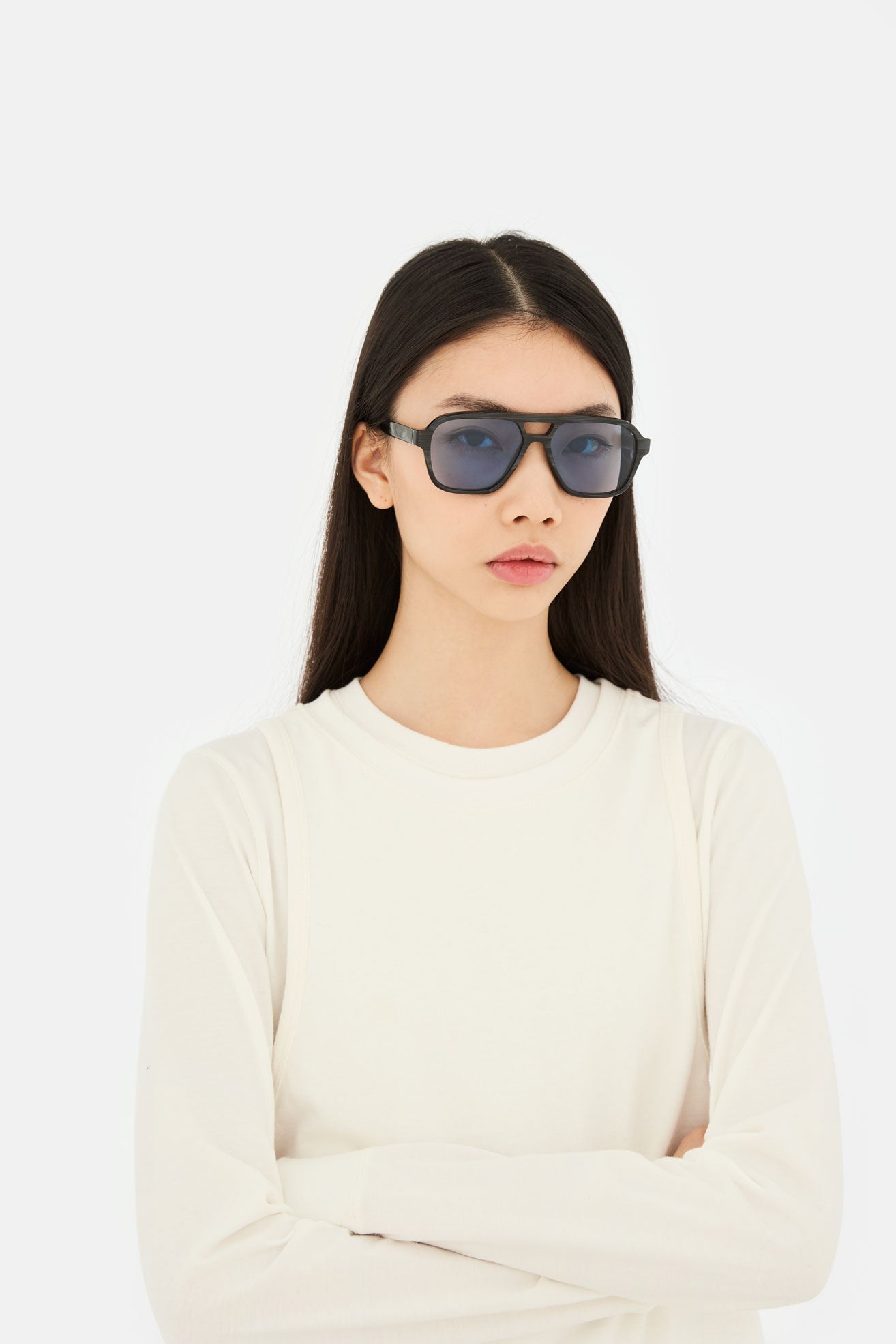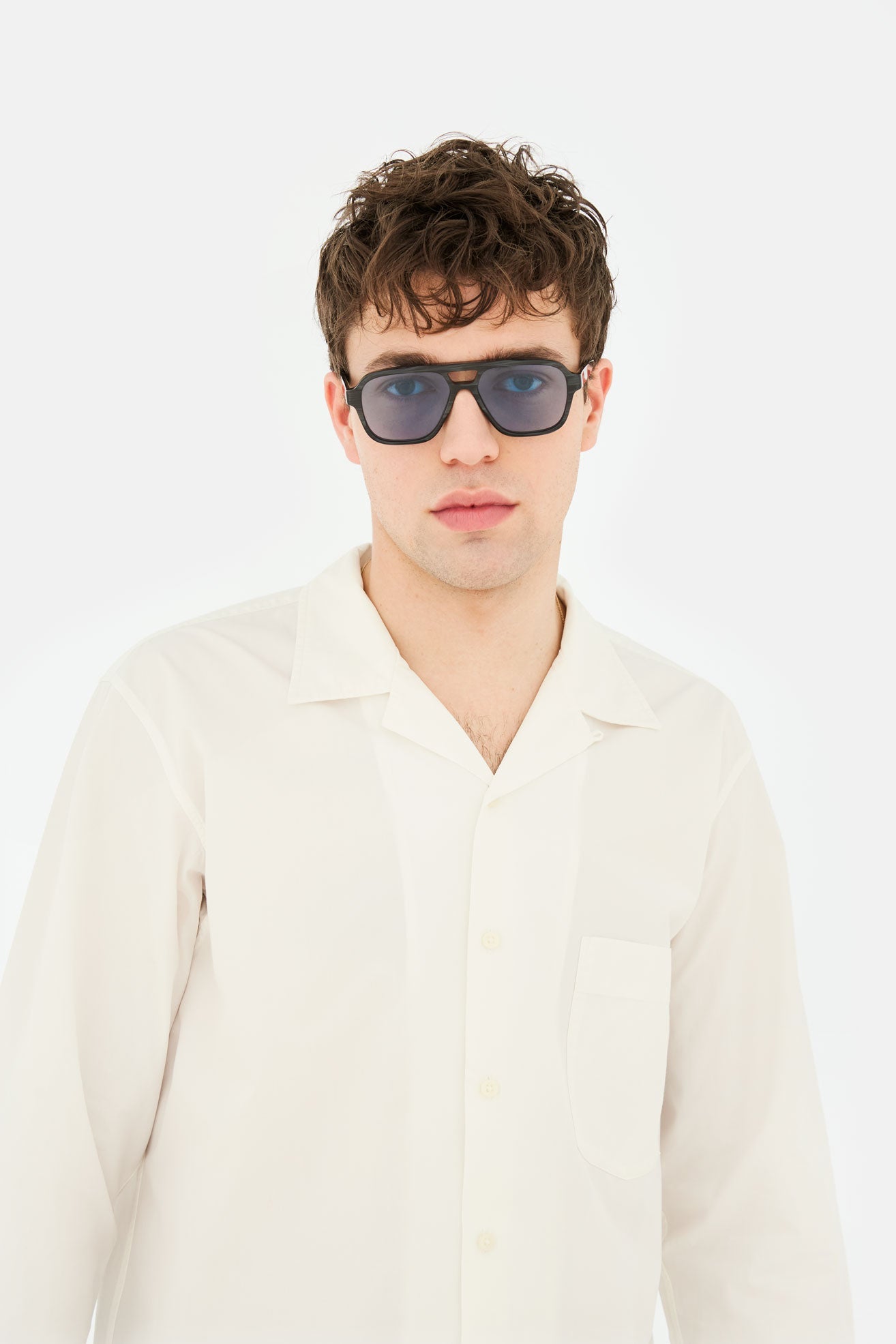 Acetato italiano de alta calidad en un exclusivo acetato negro estriado. Montura de elegantes lentes azules de Zeiss en base 4. Gafas de primera calidad hechas a mano en Italia.