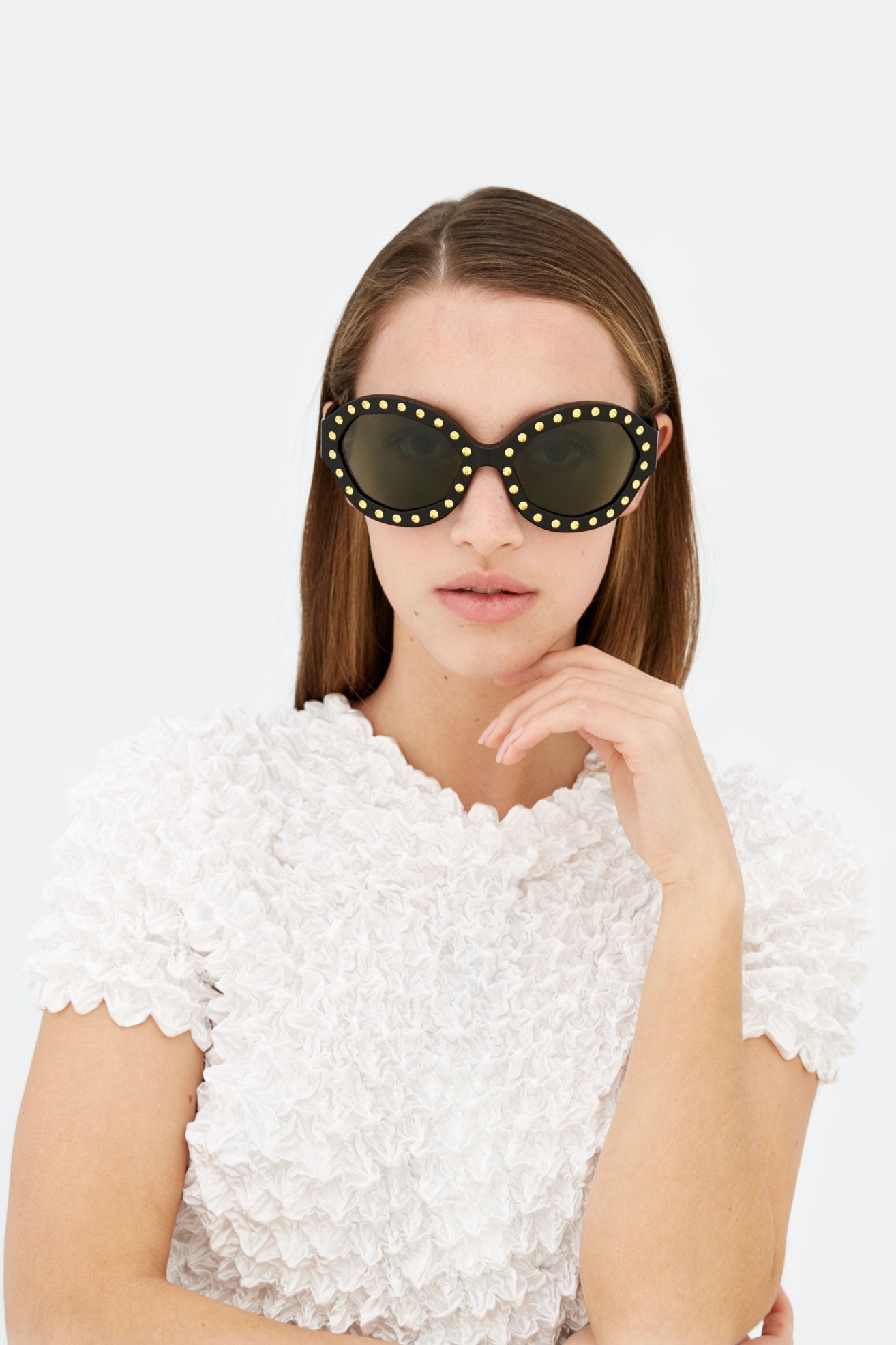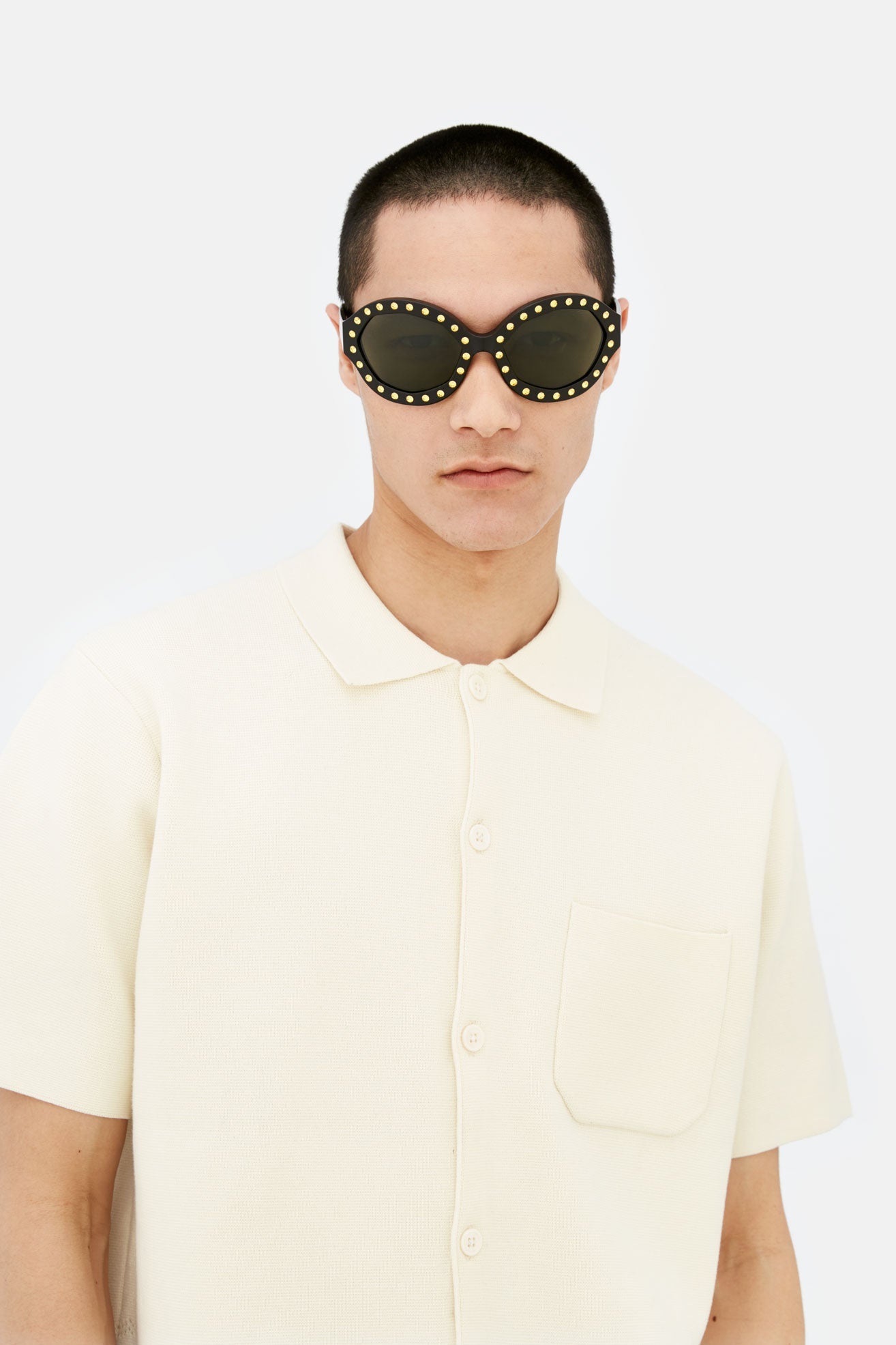 Naica Mine es una silueta de alta gama diseñada para quienes buscan el glamour en el día a día. Naica Mine es una pieza lujosa pero ponible que reinterpreta la estética clásica de las divas con un toque más contemporáneo y urbano. Naica Mine, una pieza de acetato sobredimensionada, presenta un diseño envolvente con un frontal curvado y lentes encerradas en anillos octogonales geométricos. La característica clave del modelo son las piedras preciosas que se han aplicado a mano en los bordes exteriores, resaltando aún más su forma única. Esta versión se presenta en negro con detalles dorados.
