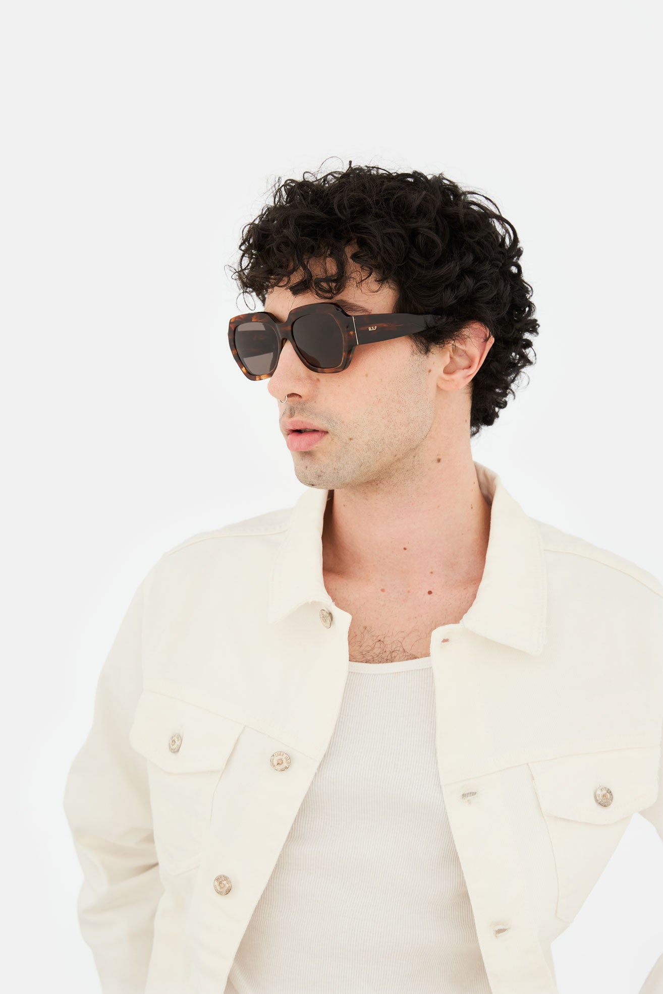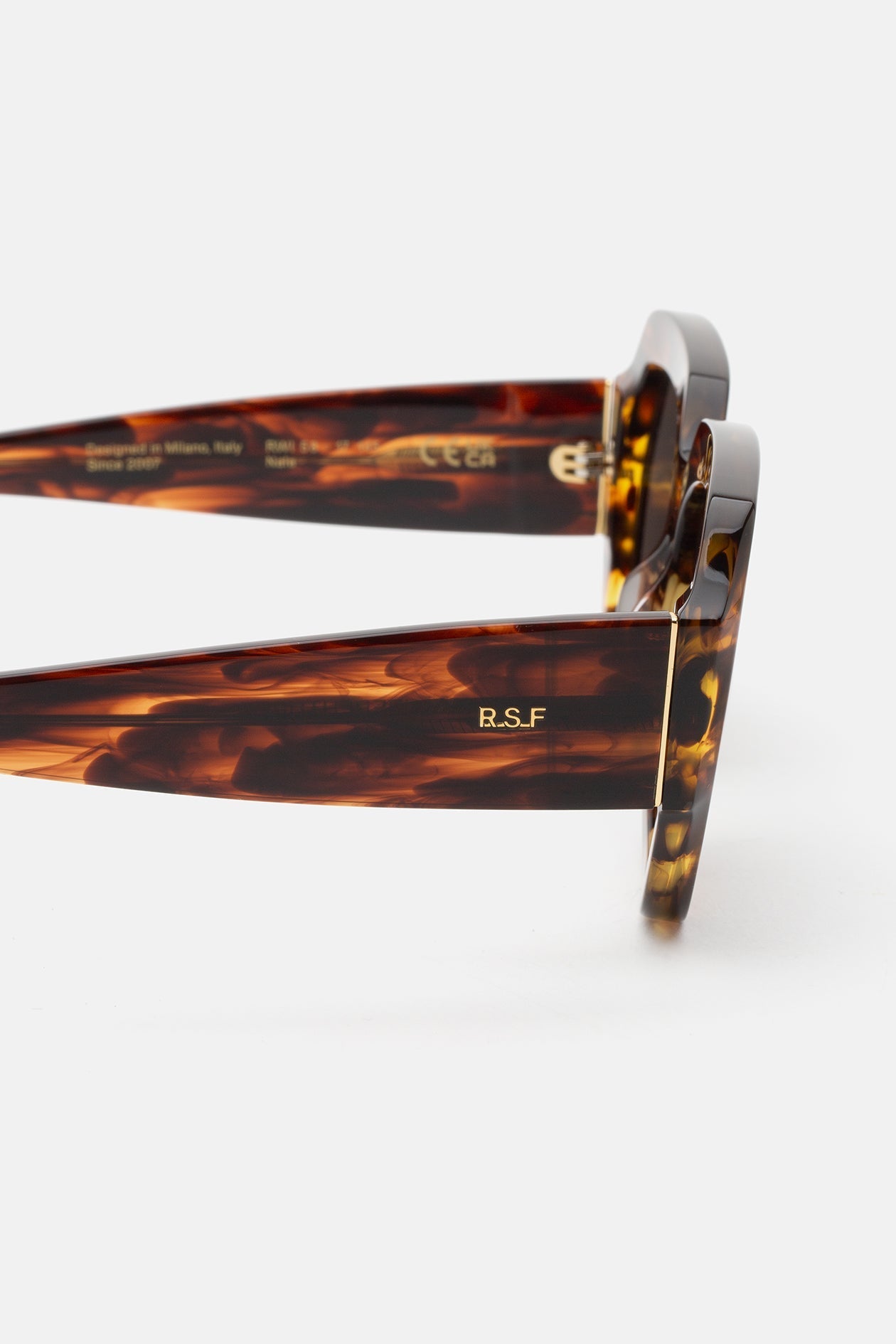 Acetato italiano de alta calidad en un intenso y oscuro color habana. Lentes Zeiss extra negras de base 4. Gafas de alta gama hechas a mano en Italia.
