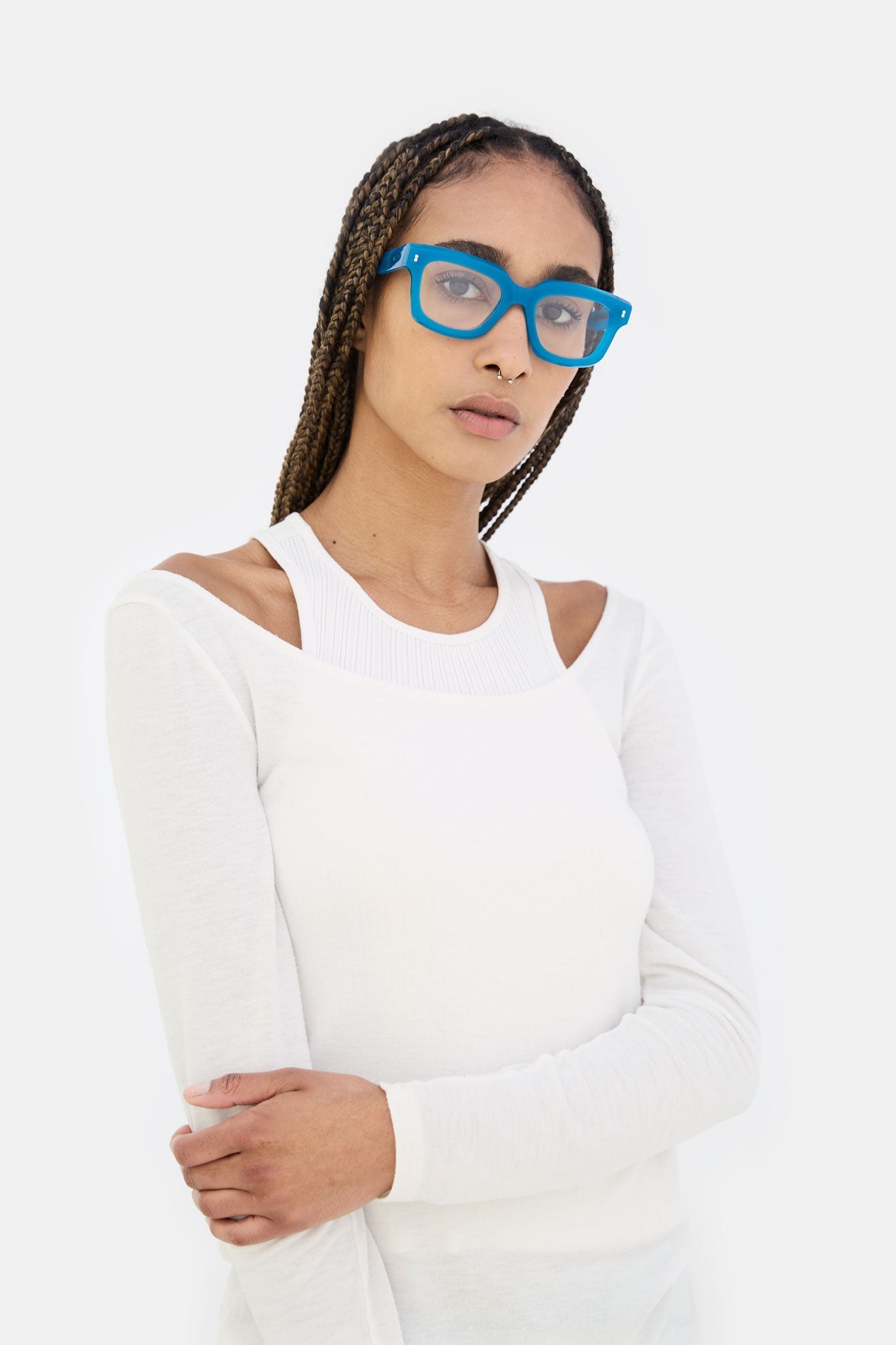 Numero 118 es una silueta única que reinterpreta monturas vintage atemporales con un diseño fresco y contemporáneo. Caracterizado por llantas gruesas y resistentes, el modelo presenta dos tachuelas en las patillas y un puente nasal en forma de cerradura, en referencia a las formas de los años 50. Sus proporciones atrevidas y lentes de gran tamaño actualizan esta forma clásica para lograr una estética moderna y nítida. Esta silueta viene en acetato azul vibrante con detalles plateados.