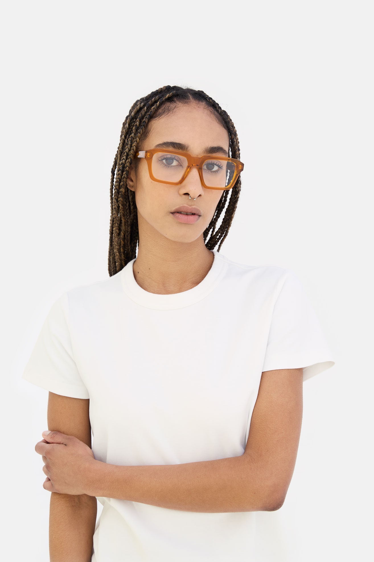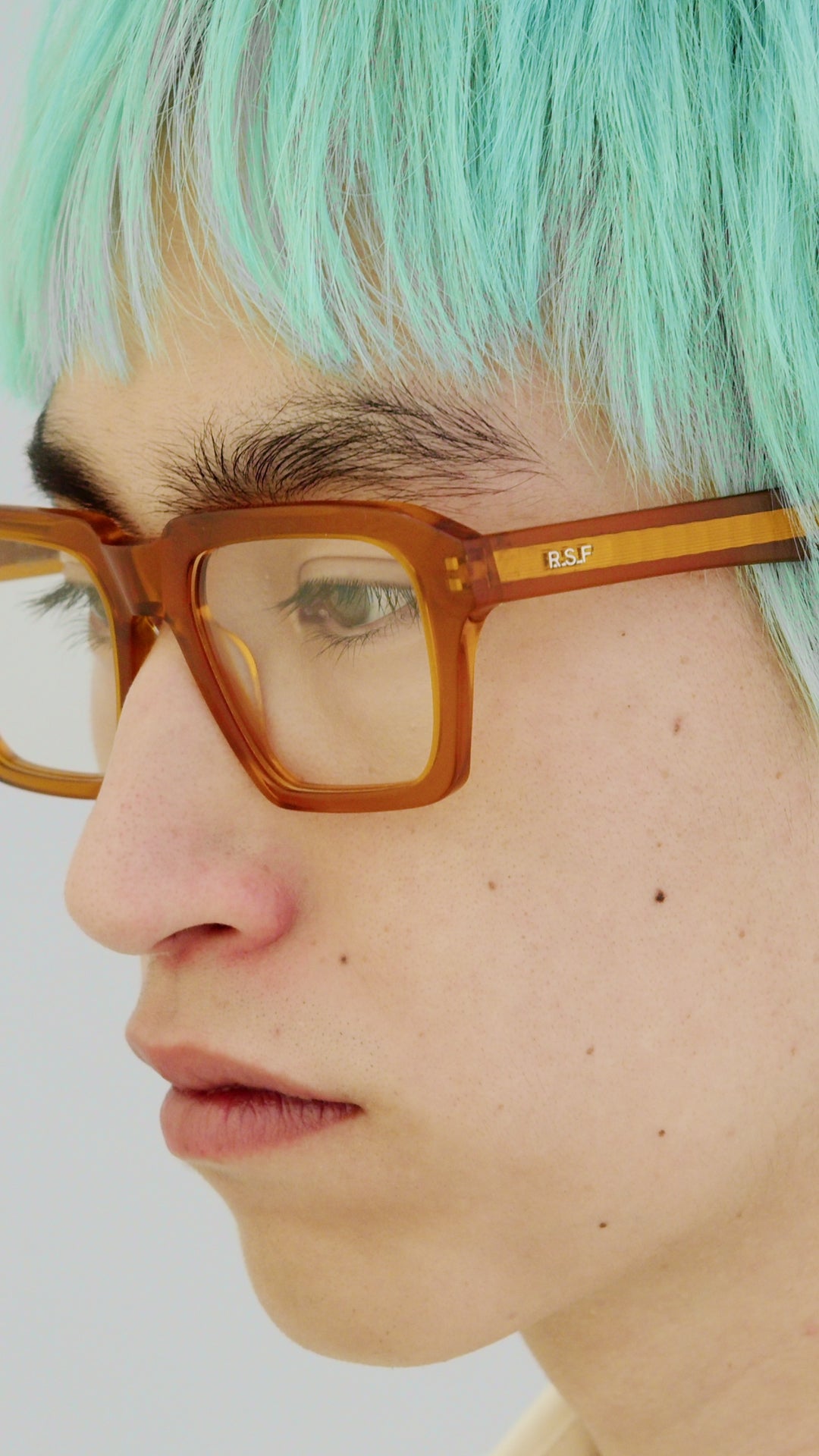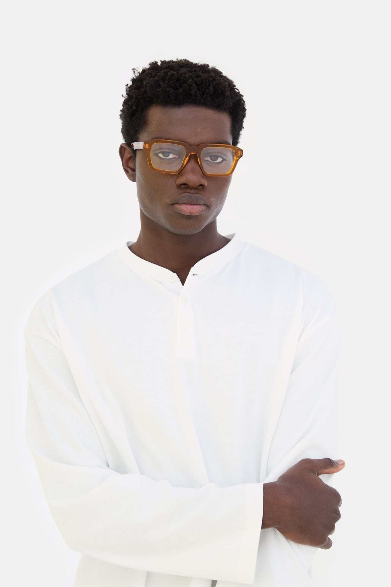 Numero 121 una silueta oversize con carácter único. Este modelo de gafas presenta una robusta montura geométrica de acetato y patillas que fusionan una estética de los años 70 con un toque contemporáneo.Esta versión de N121 está disponible en un divertido acetato de color miel.