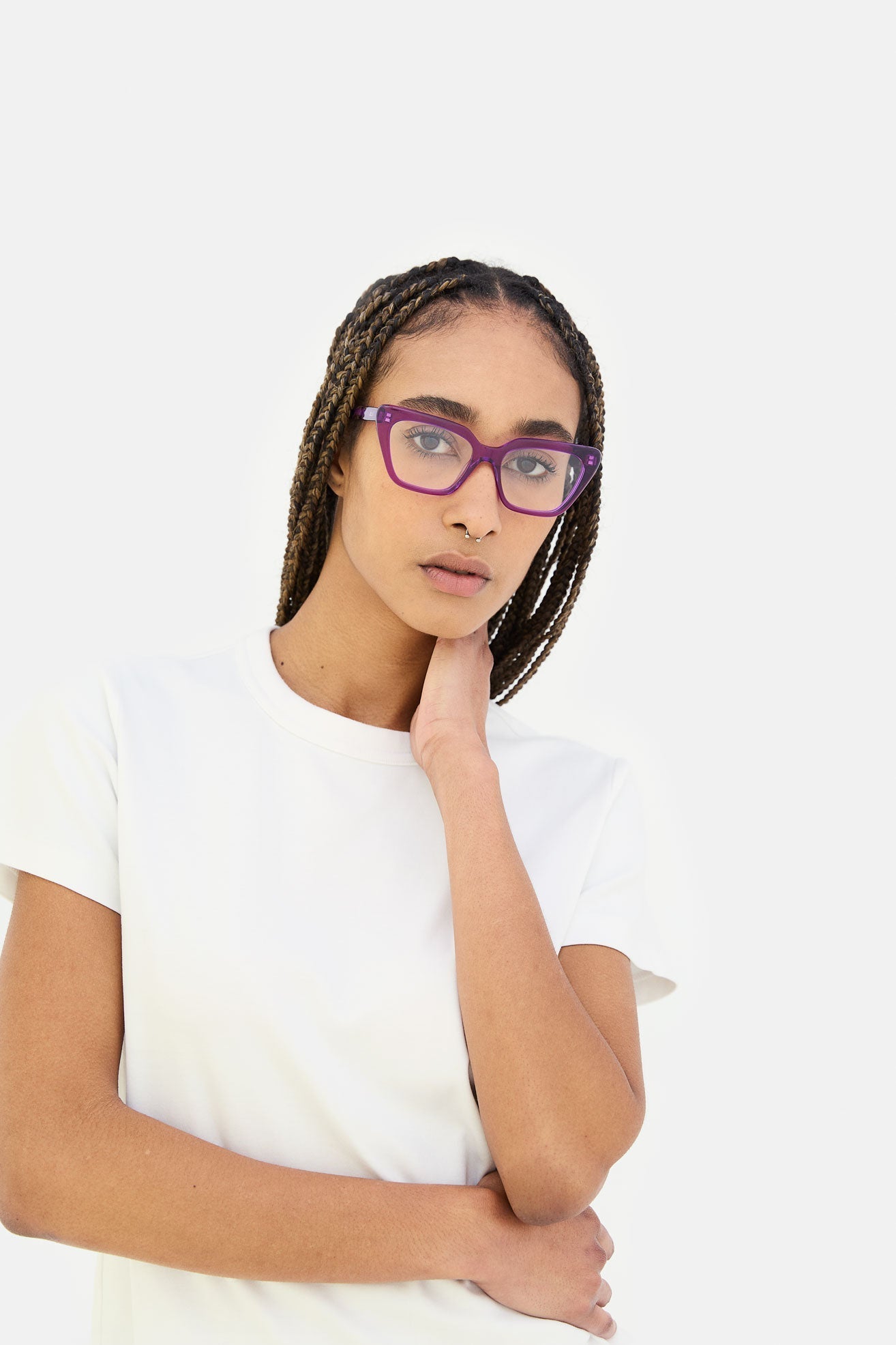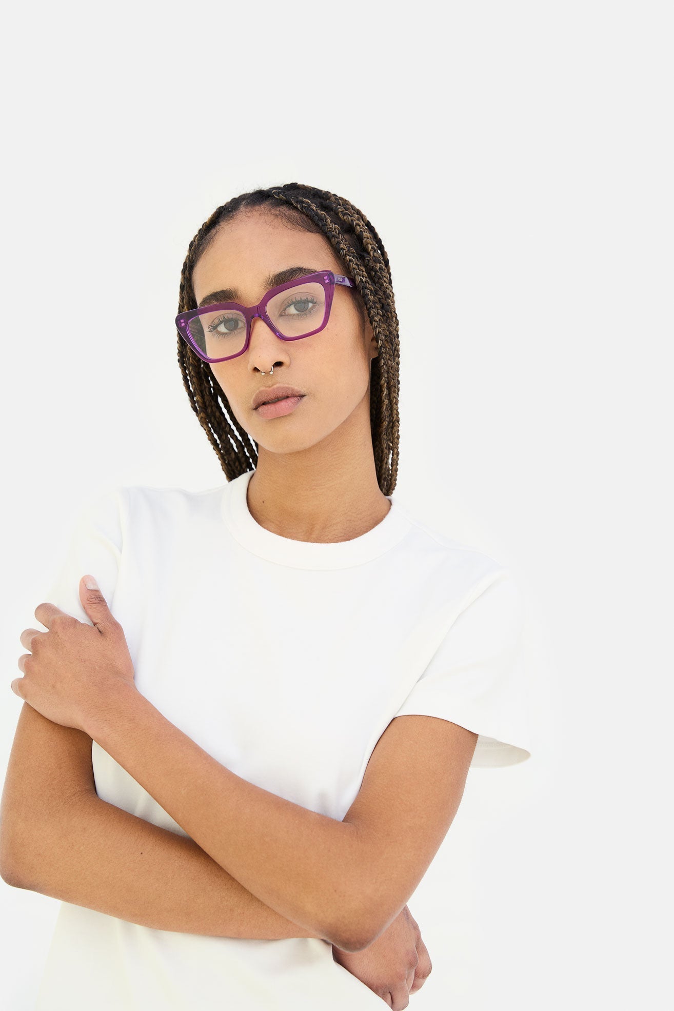 Numero 122 es una silueta divertida concebida para usarse todos los días.El modelo está diseñado para todos aquellos que quieren salir de la zona de confort pero manteniendo los pies en la tierra.Presenta una montura de acetato tipo ojo de gato, ligera, delgada y elegante.Esta versión de Numero 122 está disponible en acetato violeta cristal.