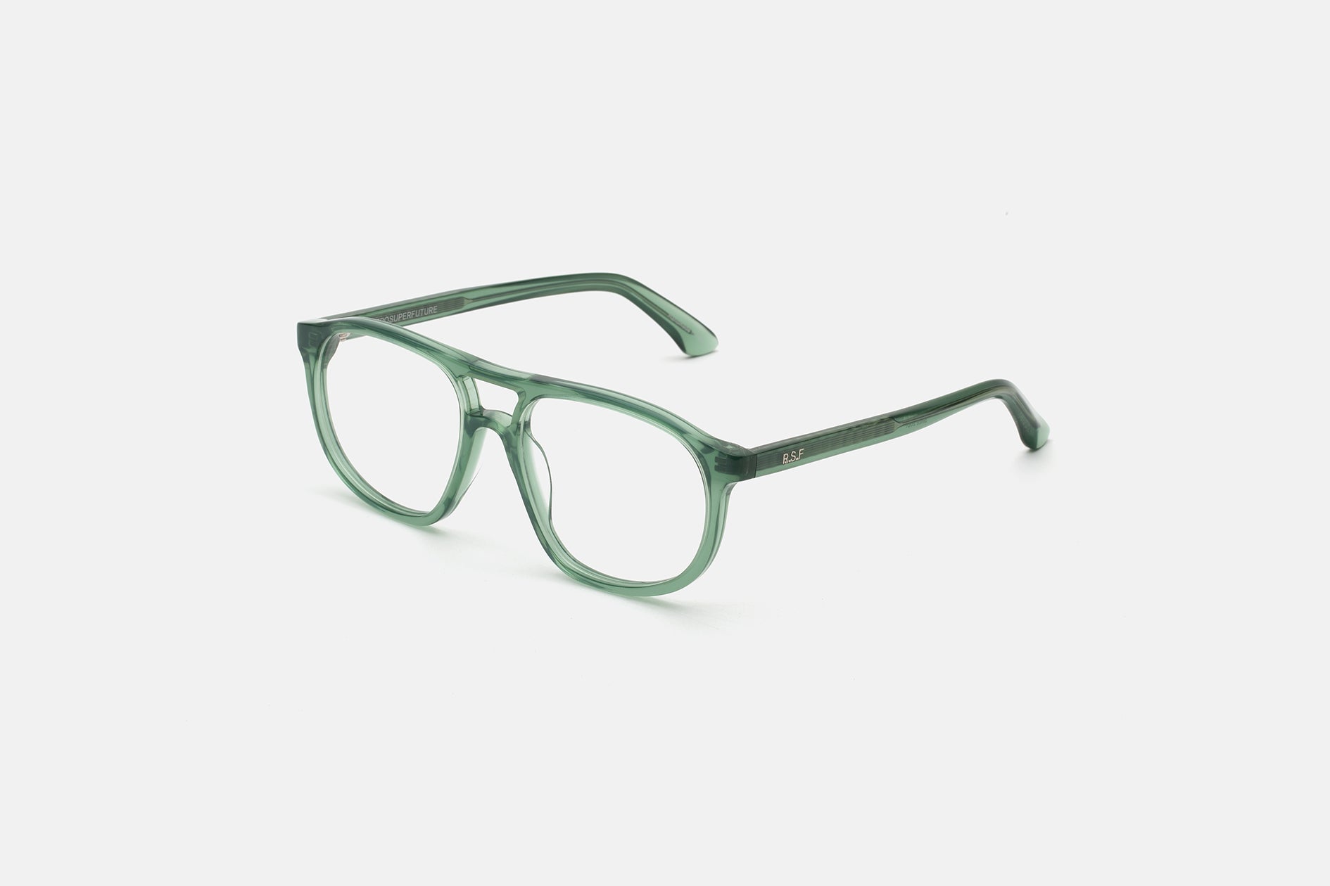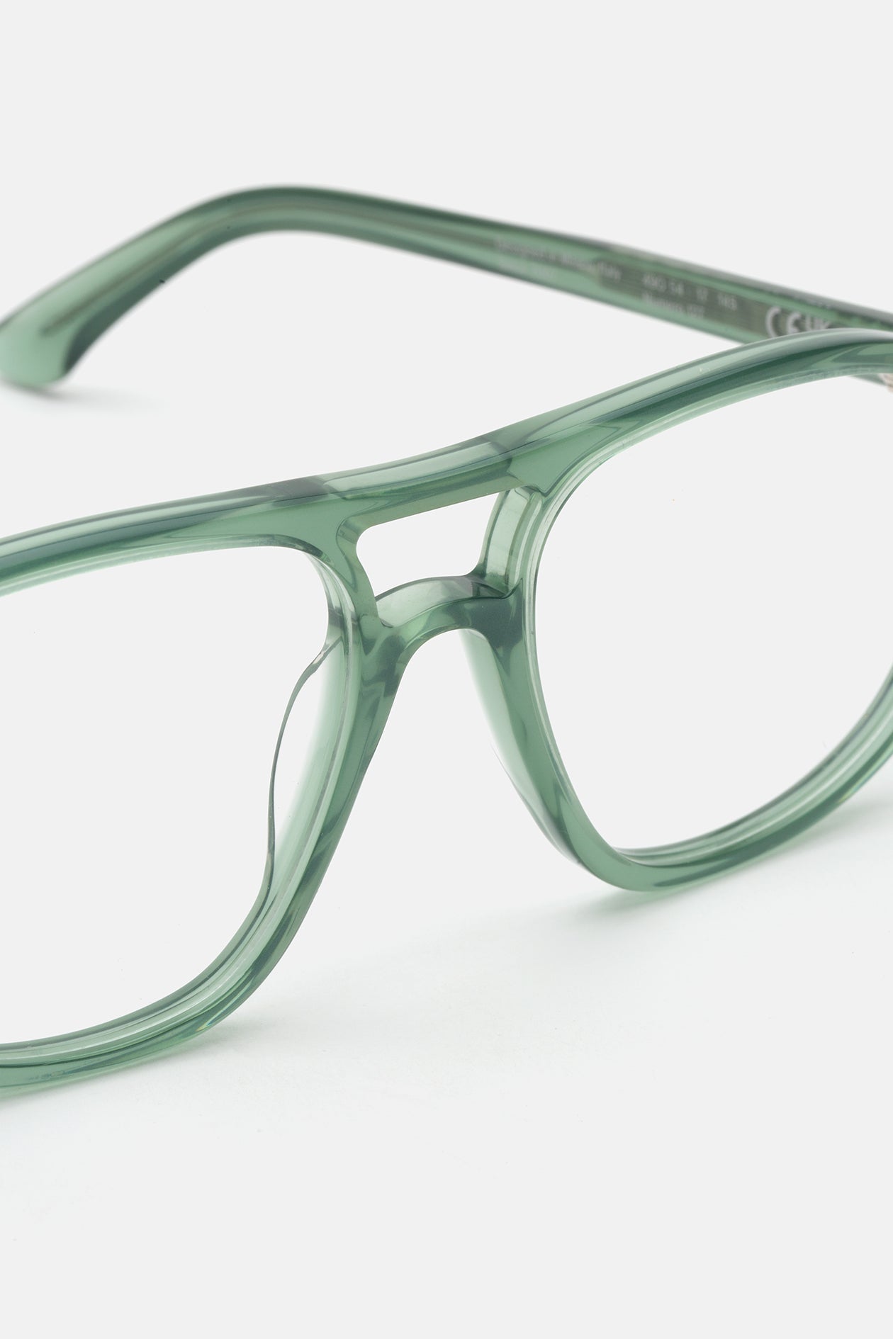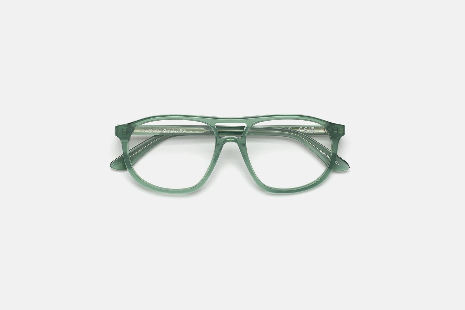Acetato italiano de alta calidad en un elegante acetato verde salvia. Montaje de lentes de visualización transparentes en la base 4. Lentes graduadas no incluidas. Gafas premium hechas a mano en Italia.