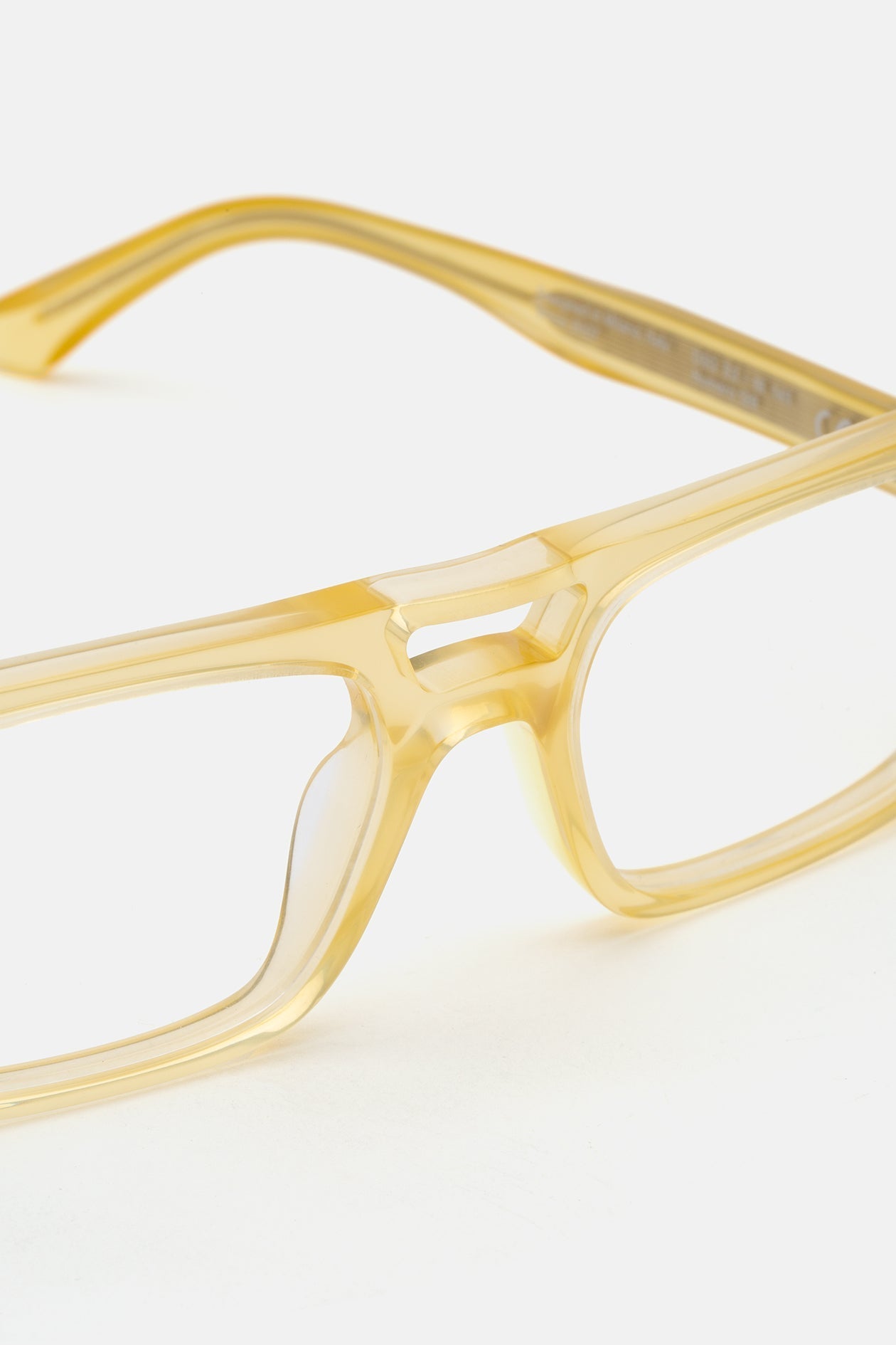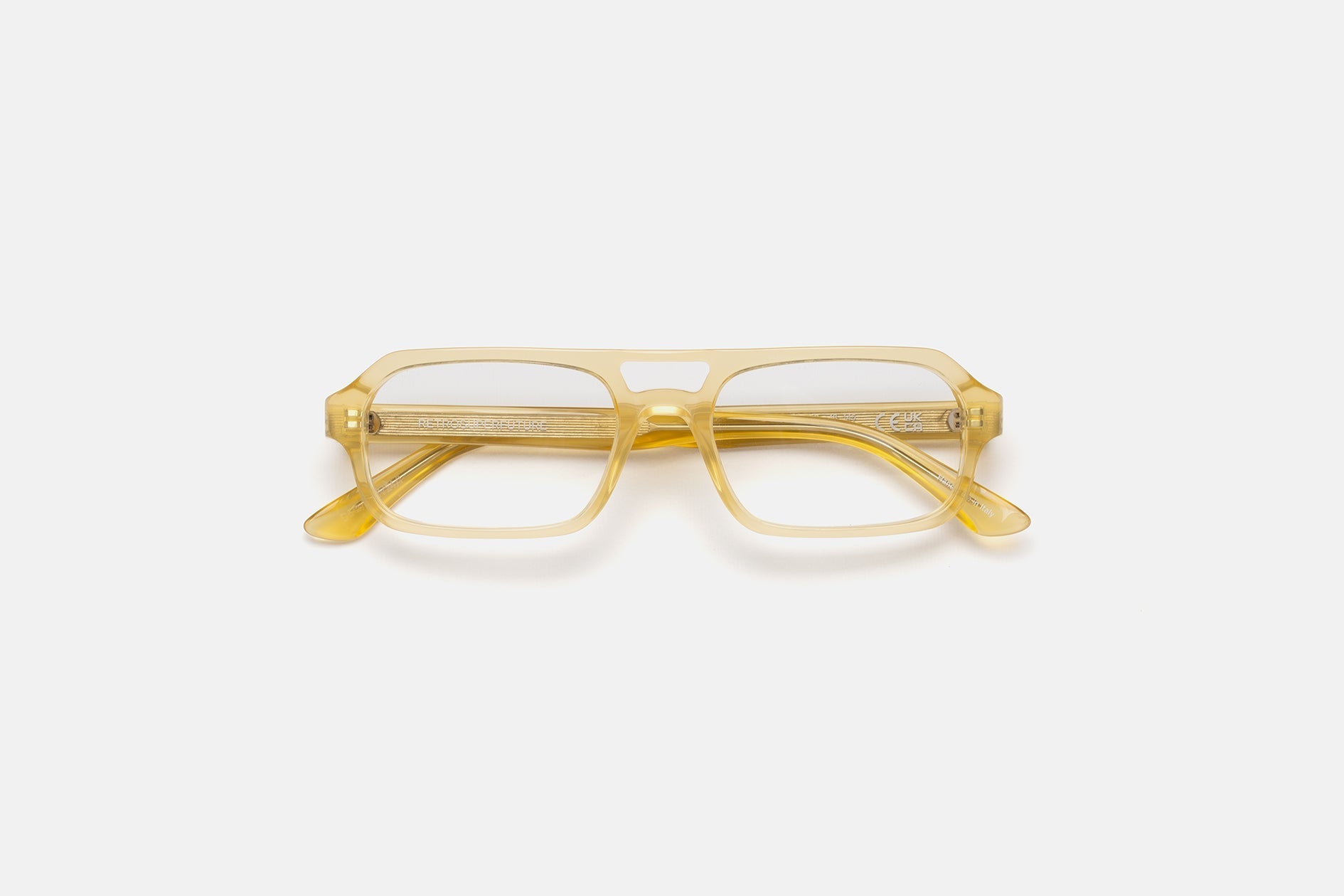 Acetato italiano de alta calidad en un suave acetato de cristal amarillo. Montaje de lentes de visualización transparentes en la base 4. Lentes graduadas no incluidas. Gafas premium hechas a mano en Italia.
