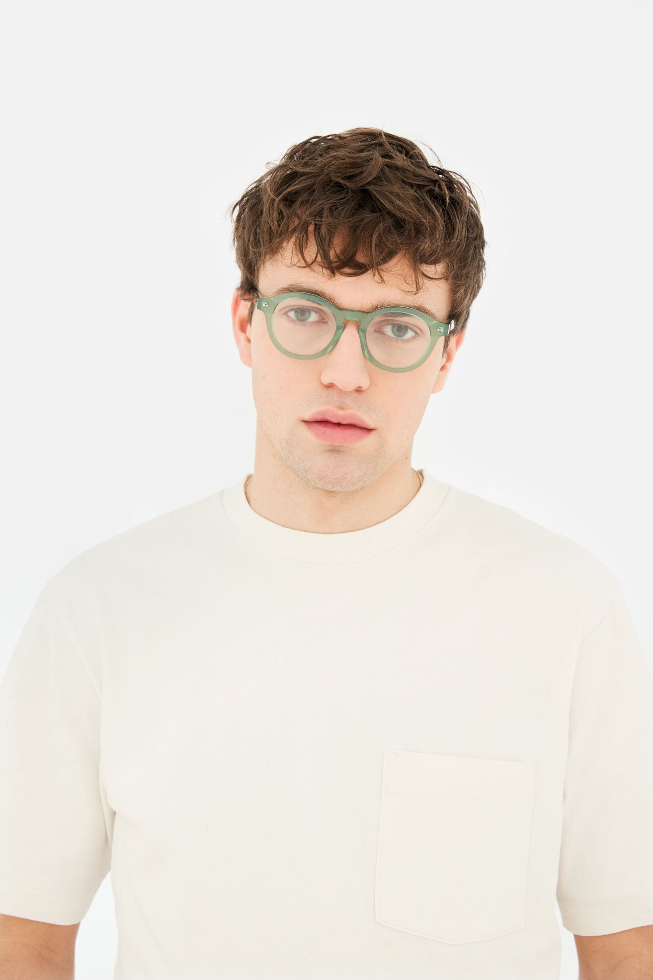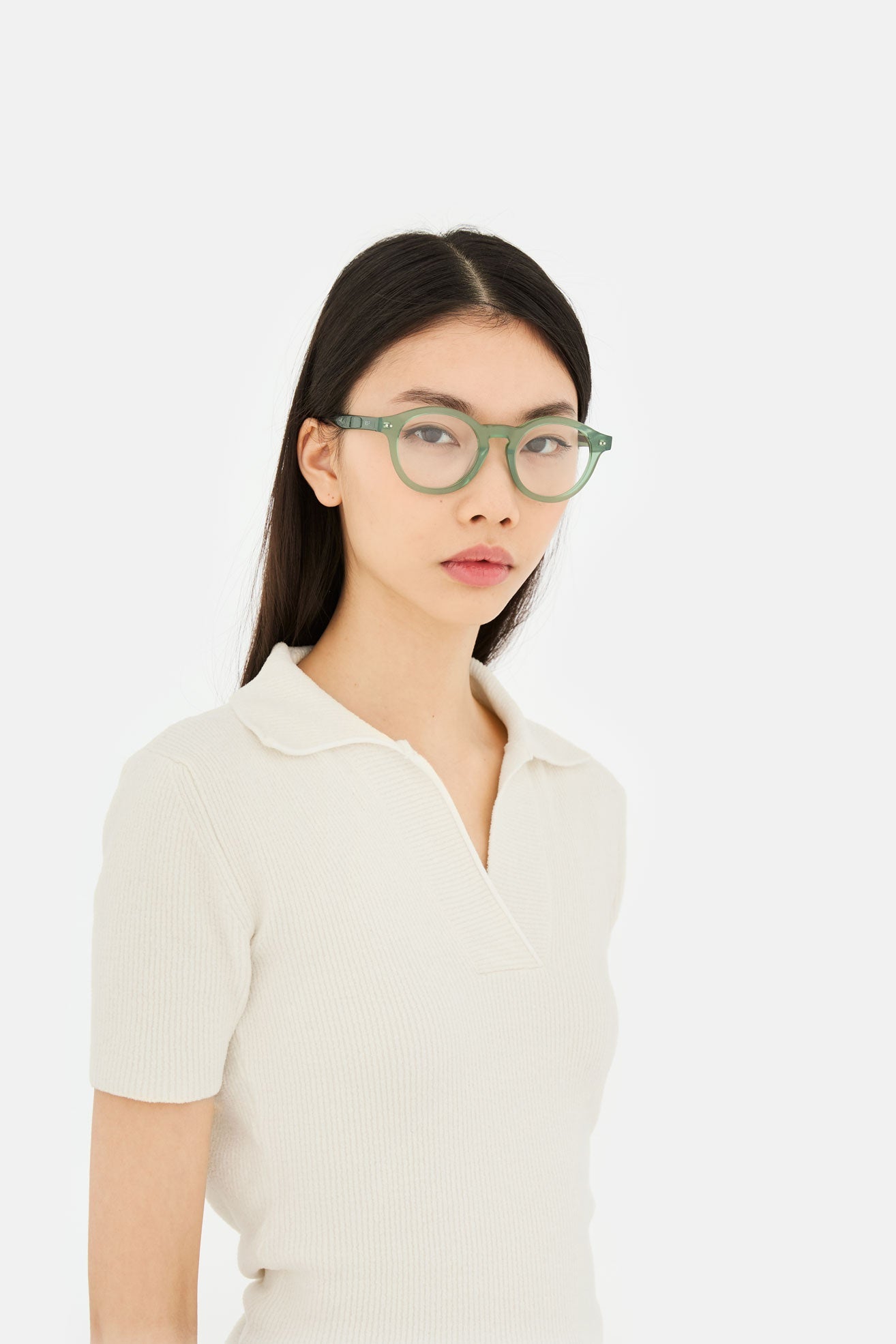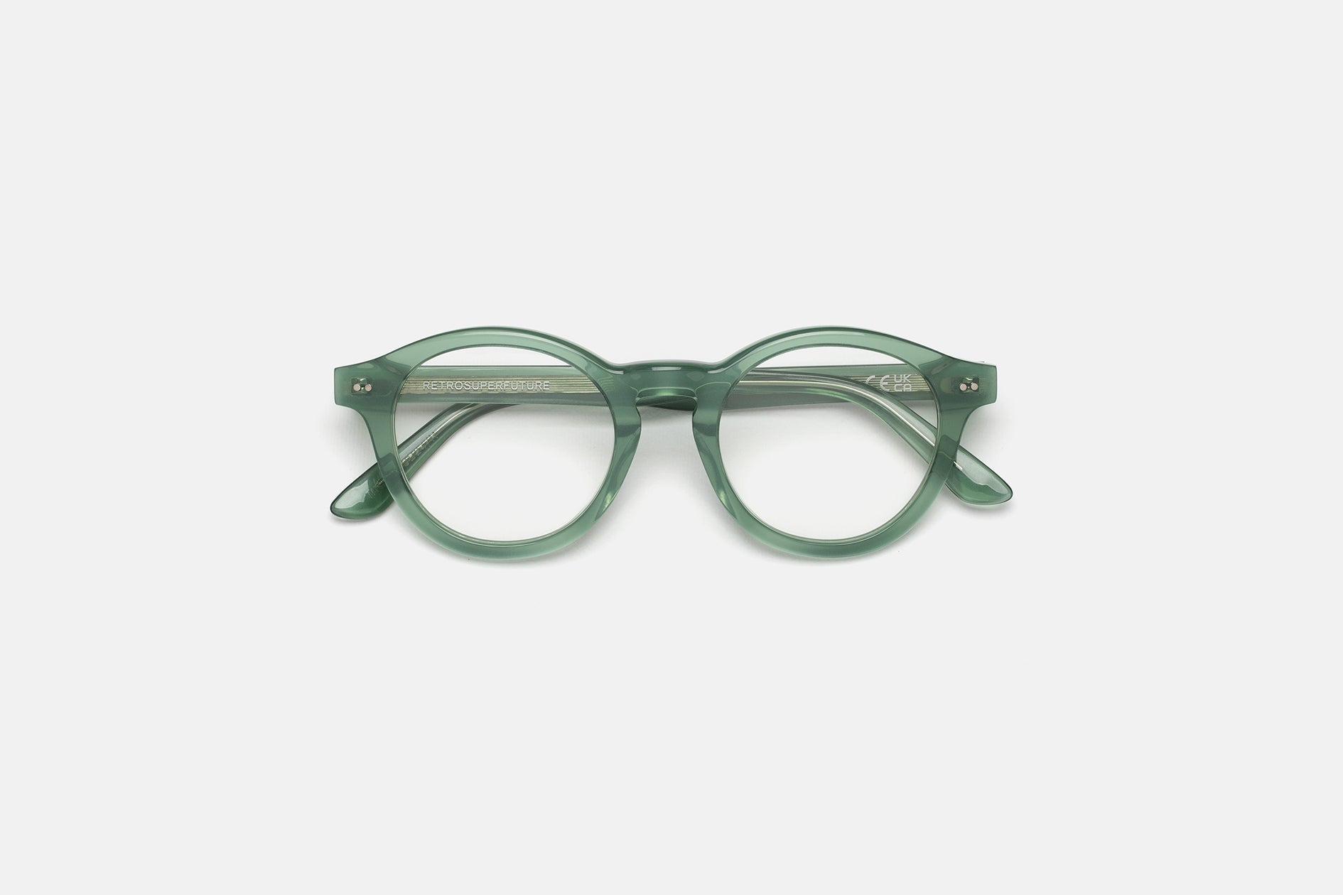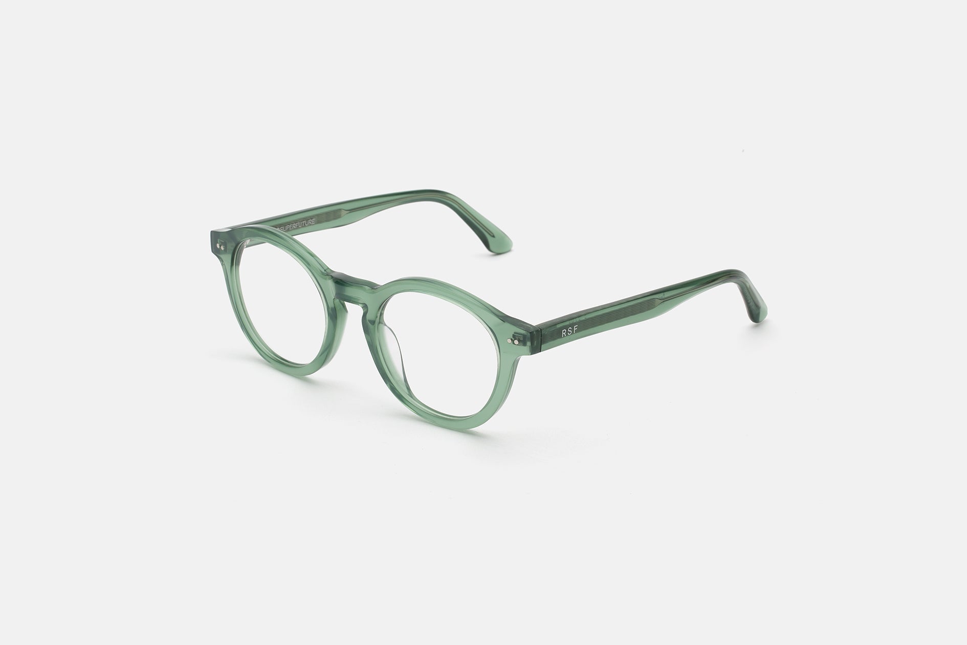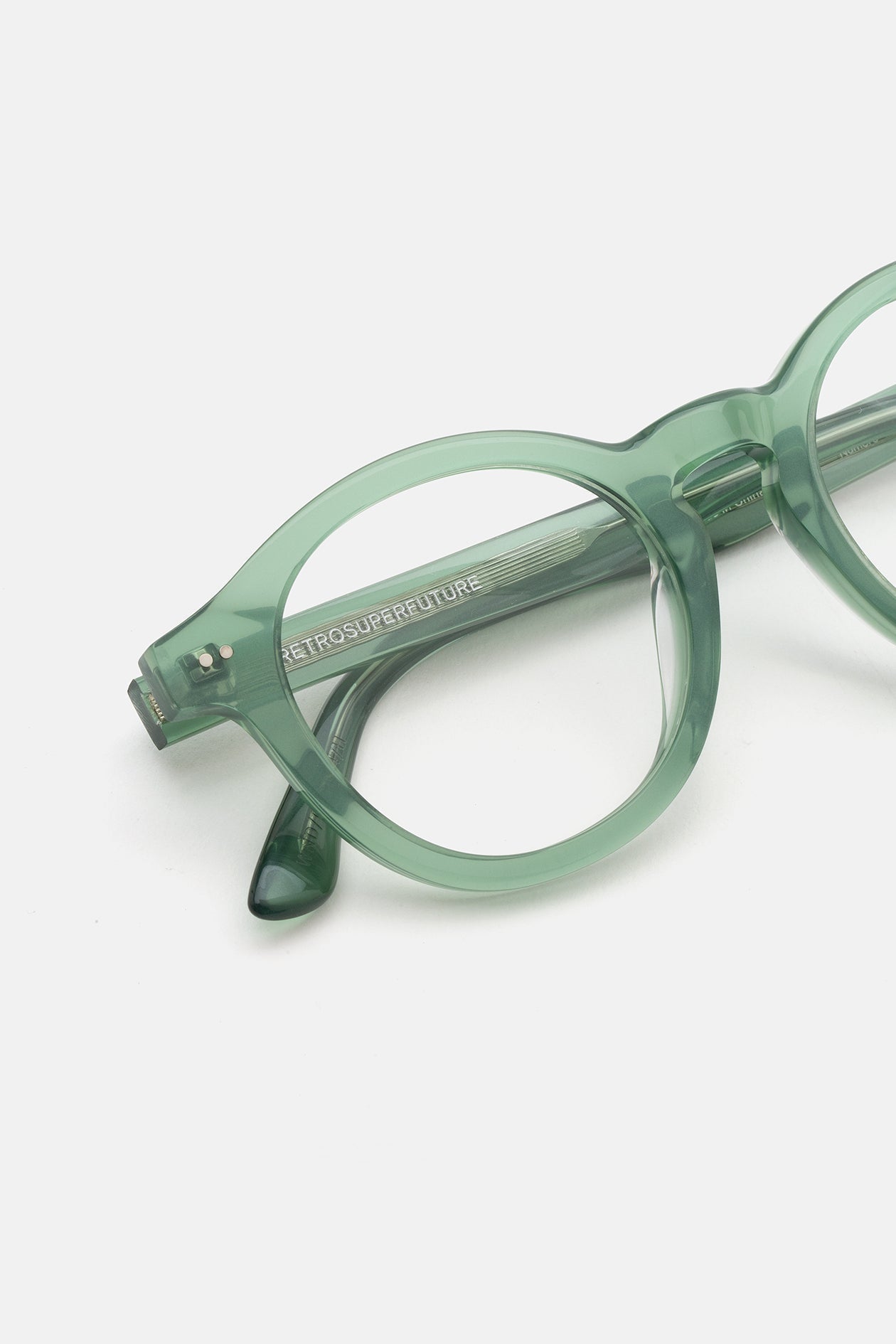 Acetato italiano de alta calidad en un elegante acetato cristal verde salvia. Lentes transparentes de montaje en la base 4. Lentes graduadas no incluidas. Gafas premium diseñadas en Milán, Italia.