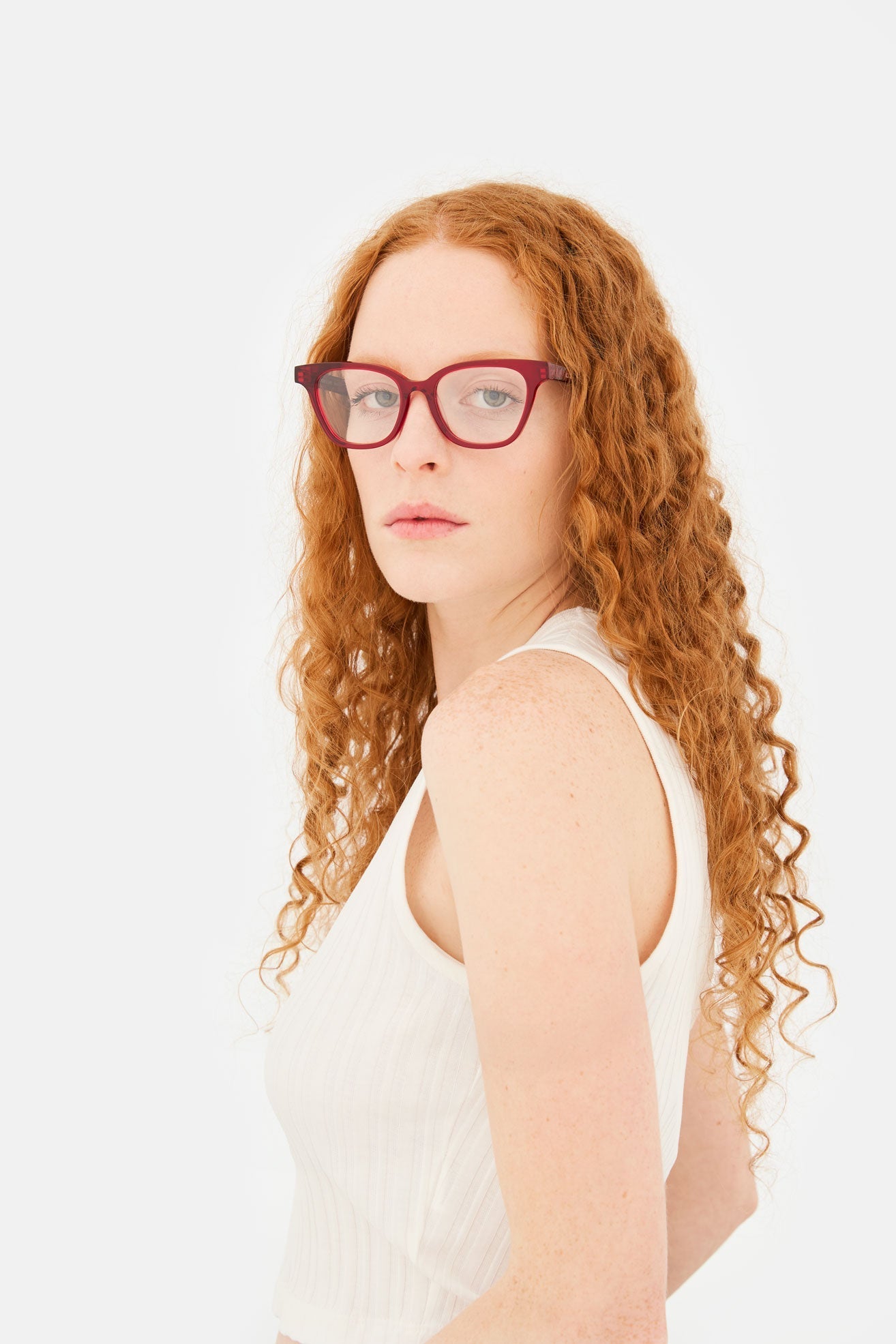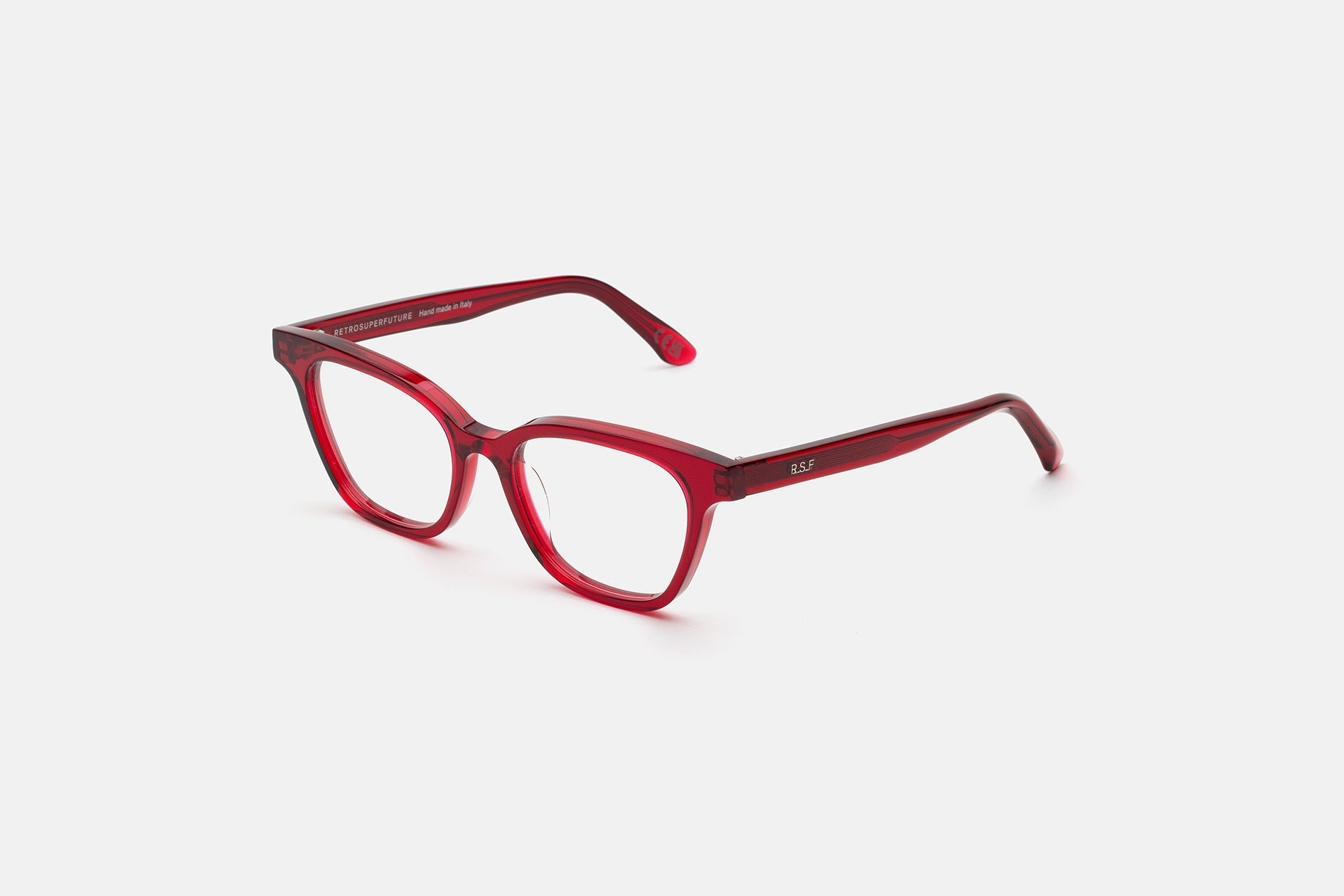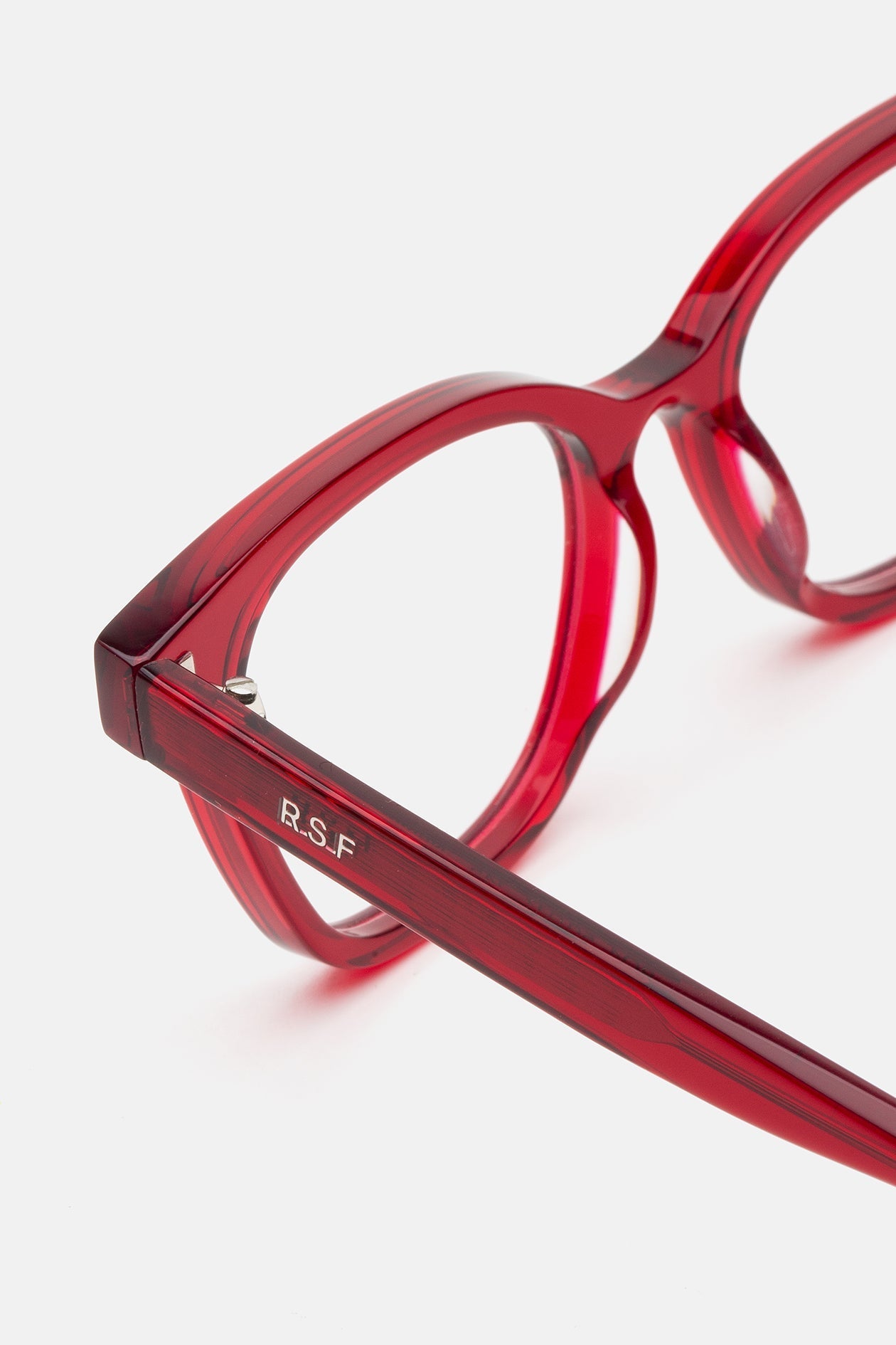 Acetato italiano de alta calidad en un elegante acetato cristal rojo intenso. Lentes de visualización transparentes en la base 4. Lentes graduadas no incluidas. Gafas premium diseñadas en Milán, Italia.
