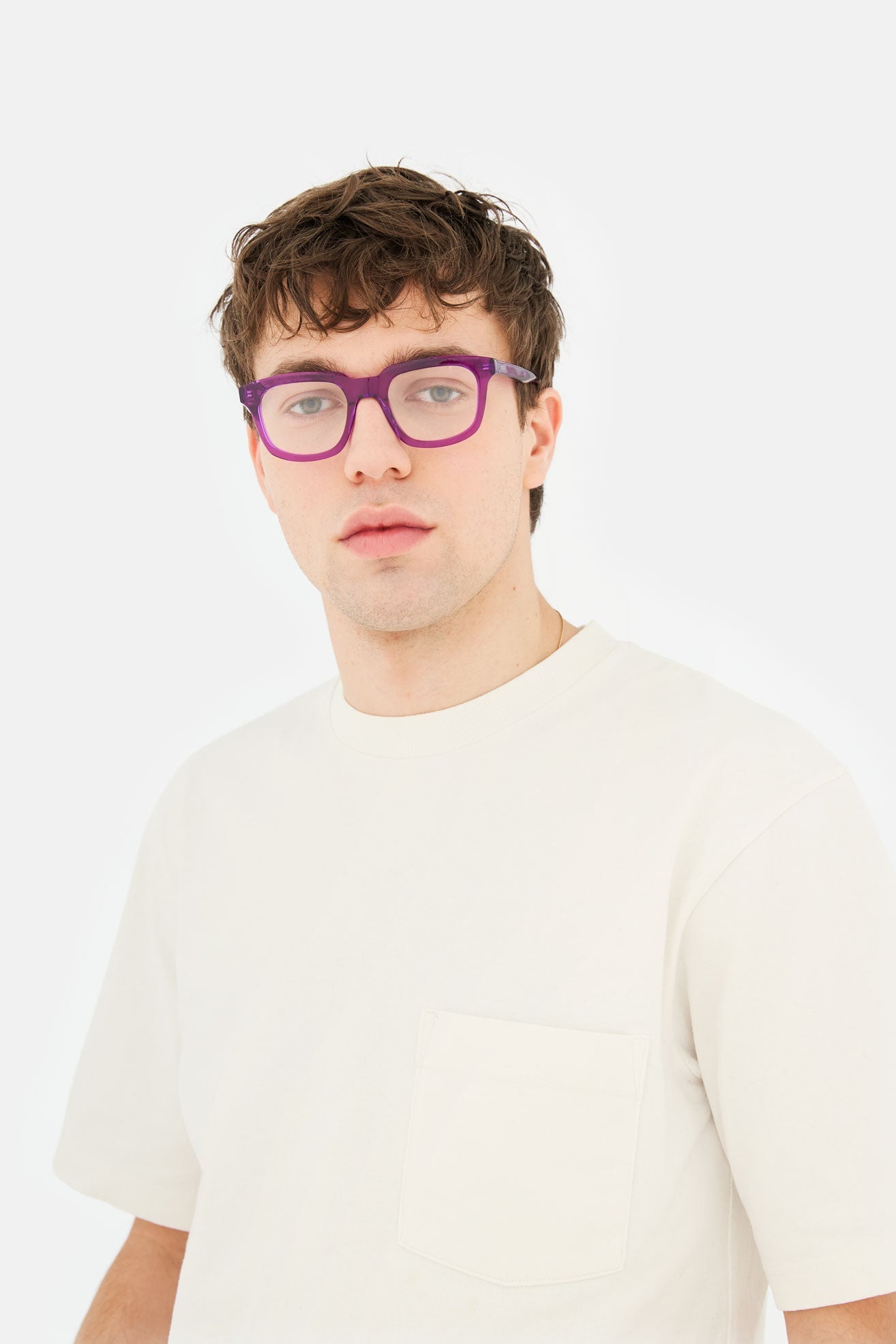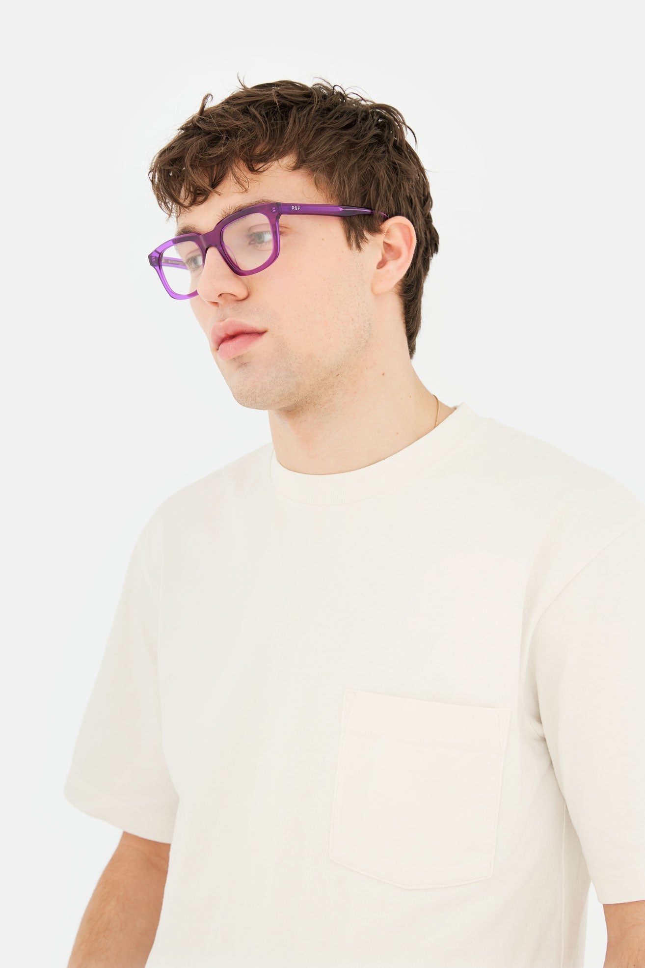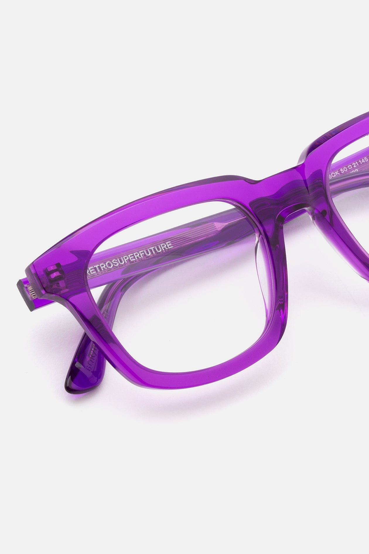 Acetato italiano de alta calidad en un exclusivo acetato cristalino de color púrpura ácido. Lentes transparentes de montaje en la base 4. Lentes graduadas no incluidas. Gafas premium diseñadas en Milán, Italia.