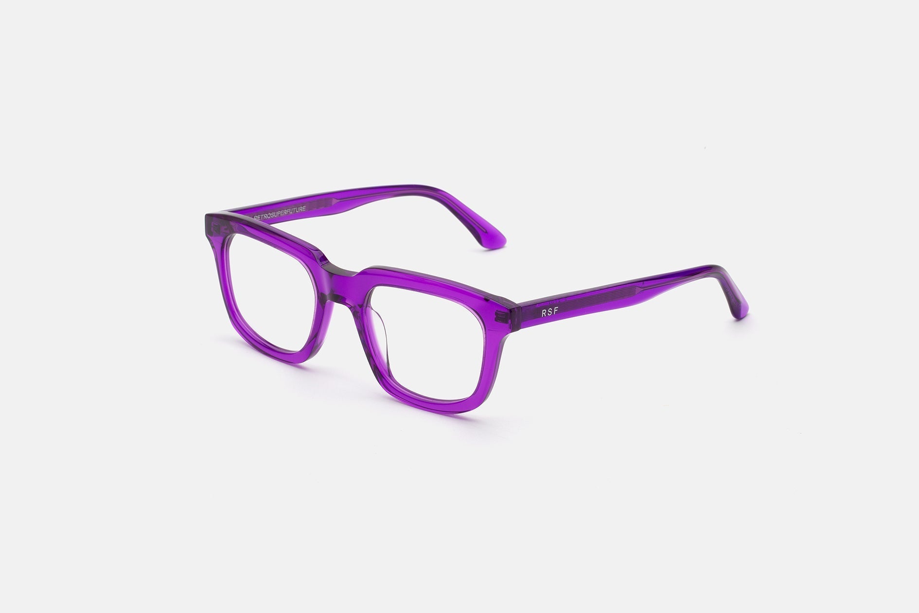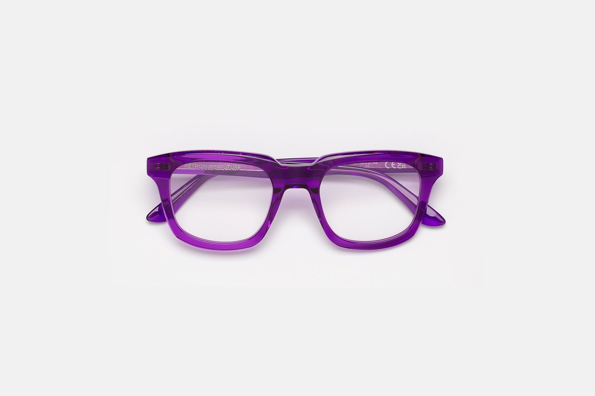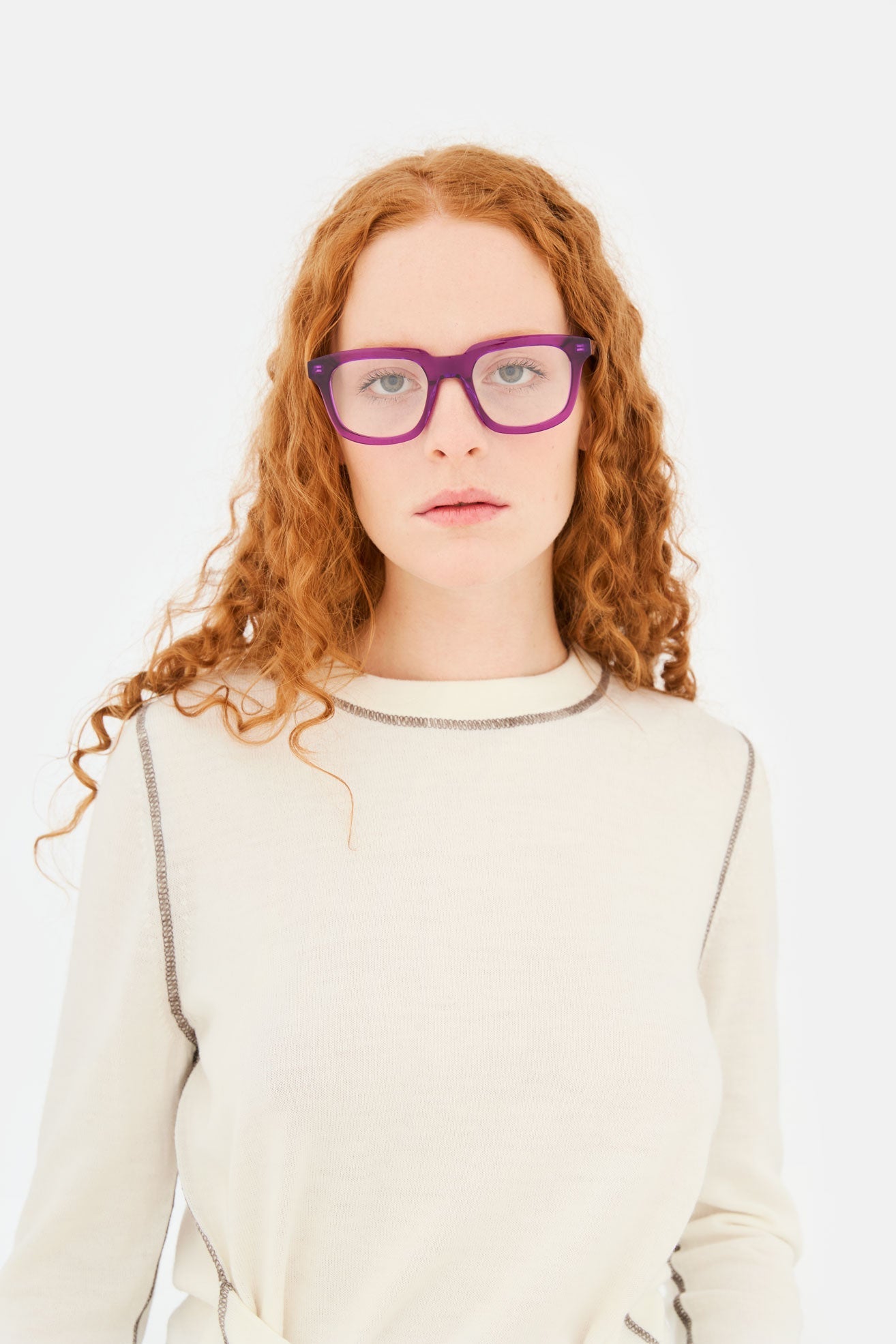 Acetato italiano de alta calidad en un exclusivo acetato cristalino de color púrpura ácido. Lentes transparentes de montaje en la base 4. Lentes graduadas no incluidas. Gafas premium diseñadas en Milán, Italia.