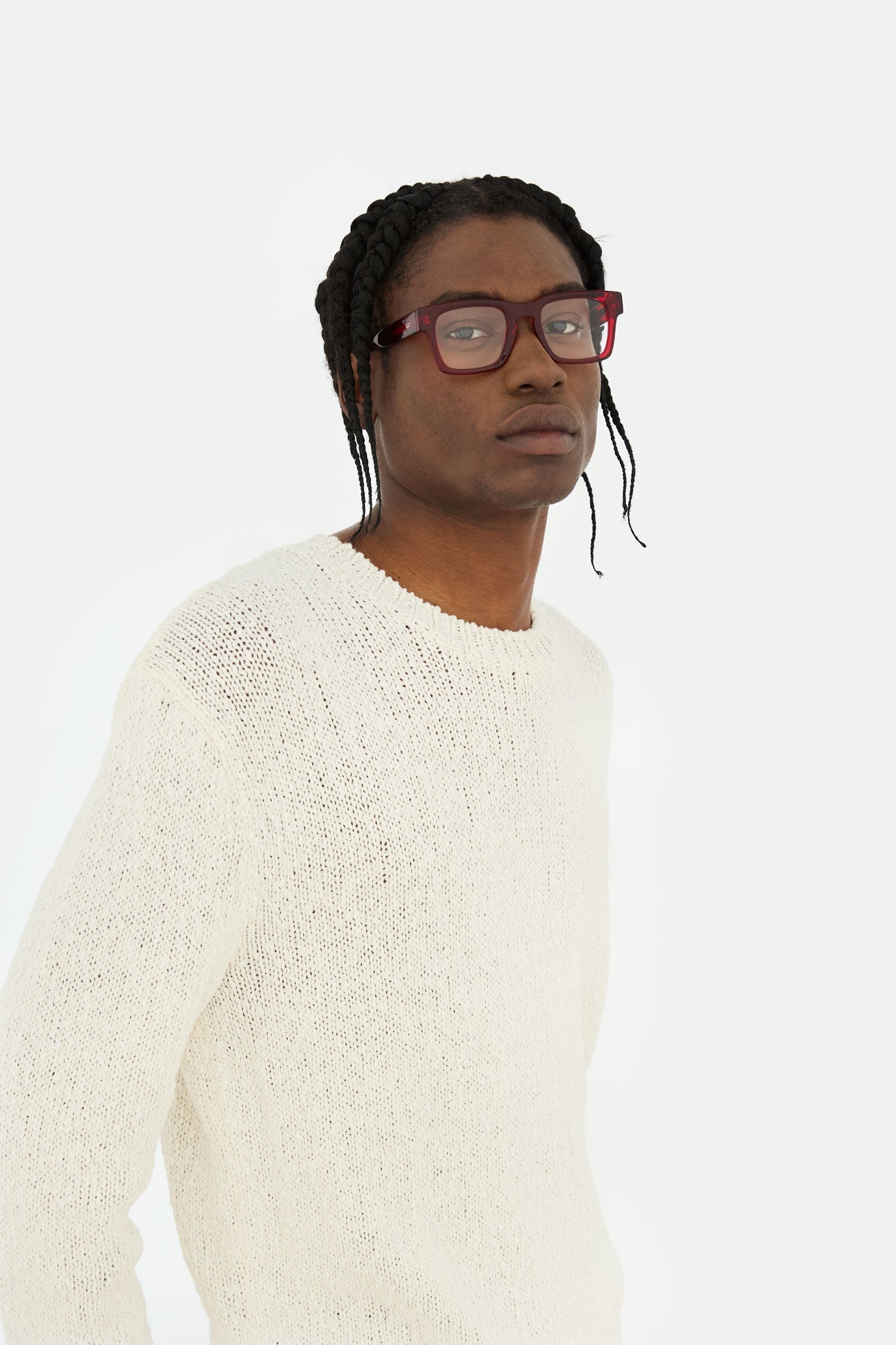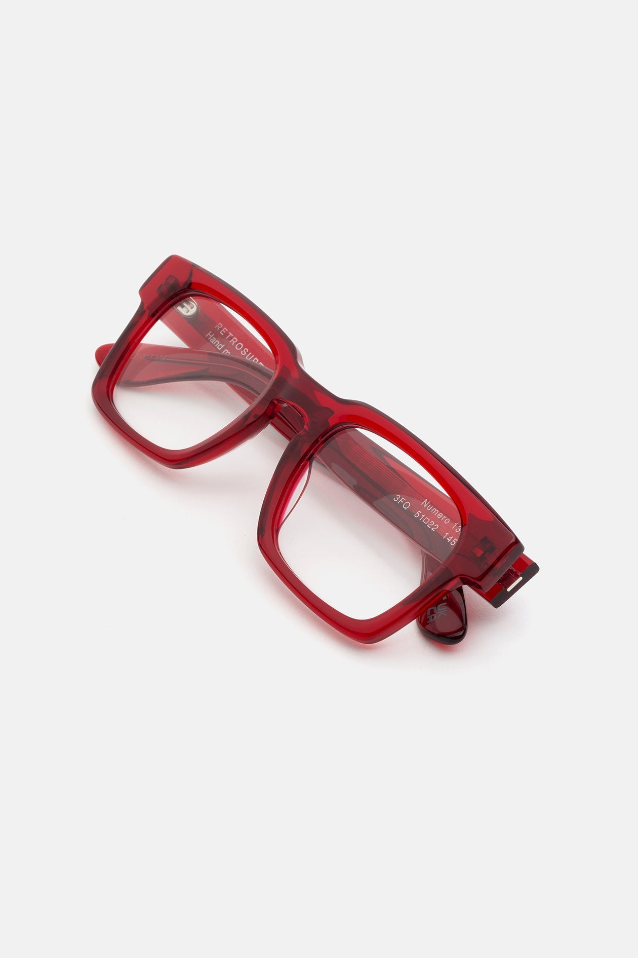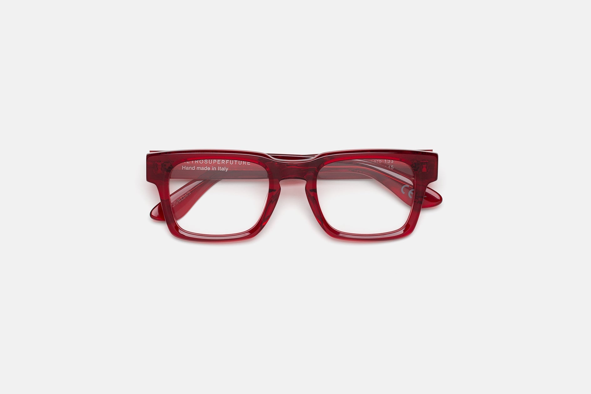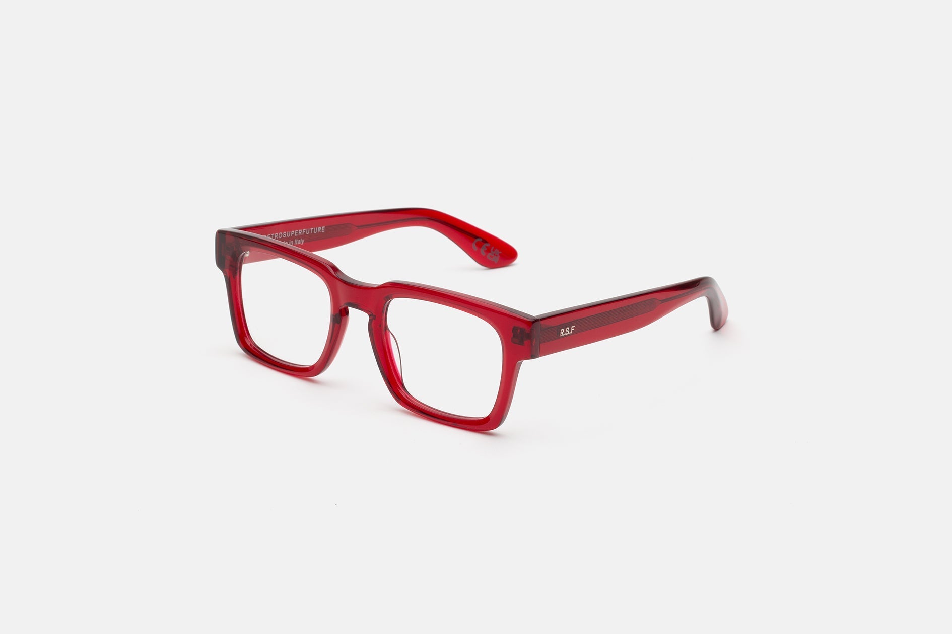 Acetato italiano de alta calidad en acetato cristal rojo intenso. Lentes de visualización transparentes en la base 4. Lentes graduadas no incluidas. Gafas premium diseñadas en Milán, Italia.