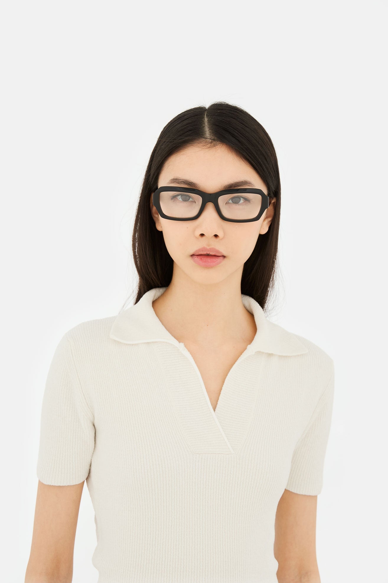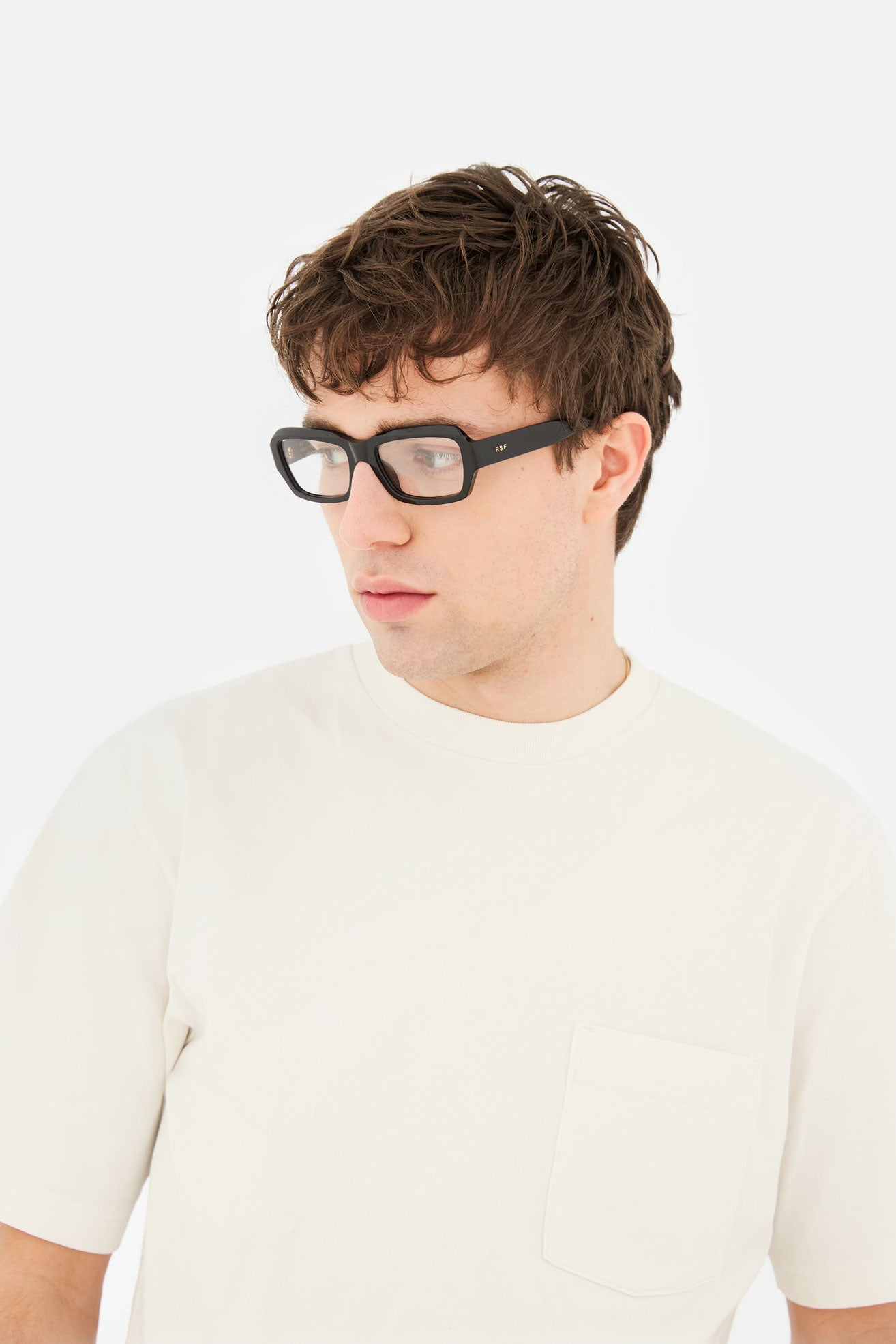 Acetato italiano de alta calidad en un clásico acetato negro. Lentes transparentes de montaje en la base 4. Lentes graduadas no incluidas. Gafas premium diseñadas en Milán, Italia.