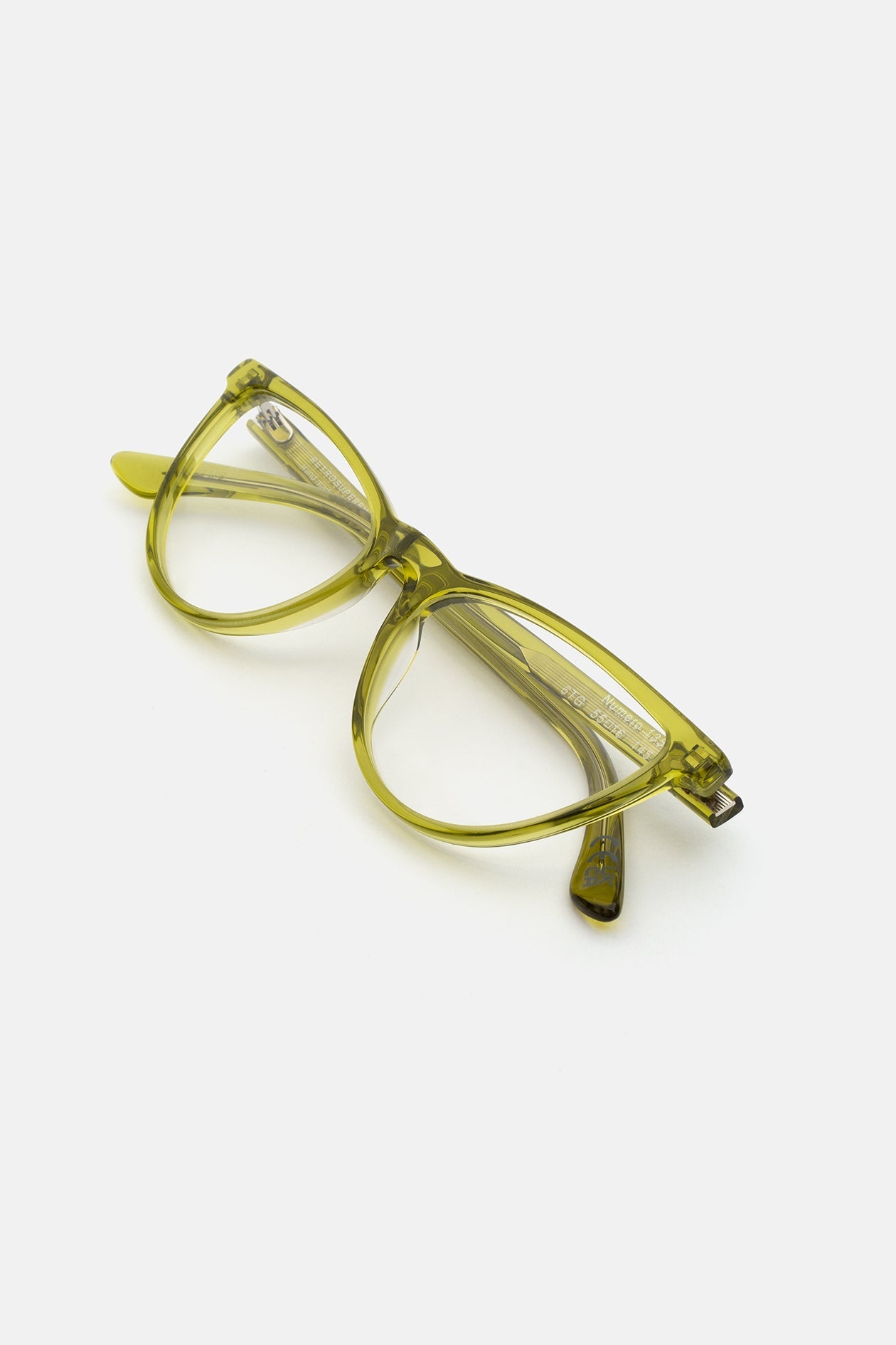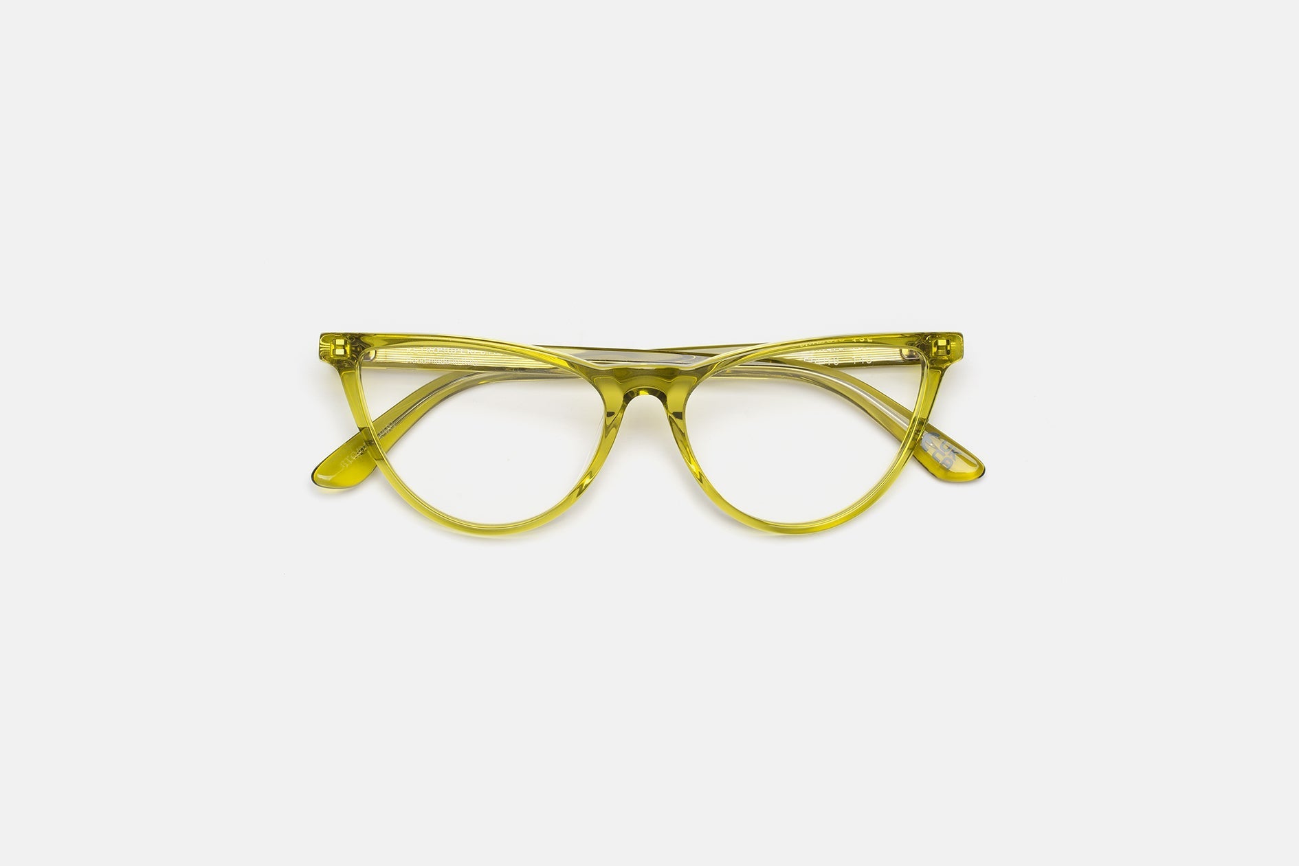 Acetato italiano de alta calidad en un exclusivo acetato cristalino amarillo ácido. Lentes transparentes de montaje en la base 4. Lentes graduadas no incluidas. Gafas de alta gama diseñadas en Milán, Italia.