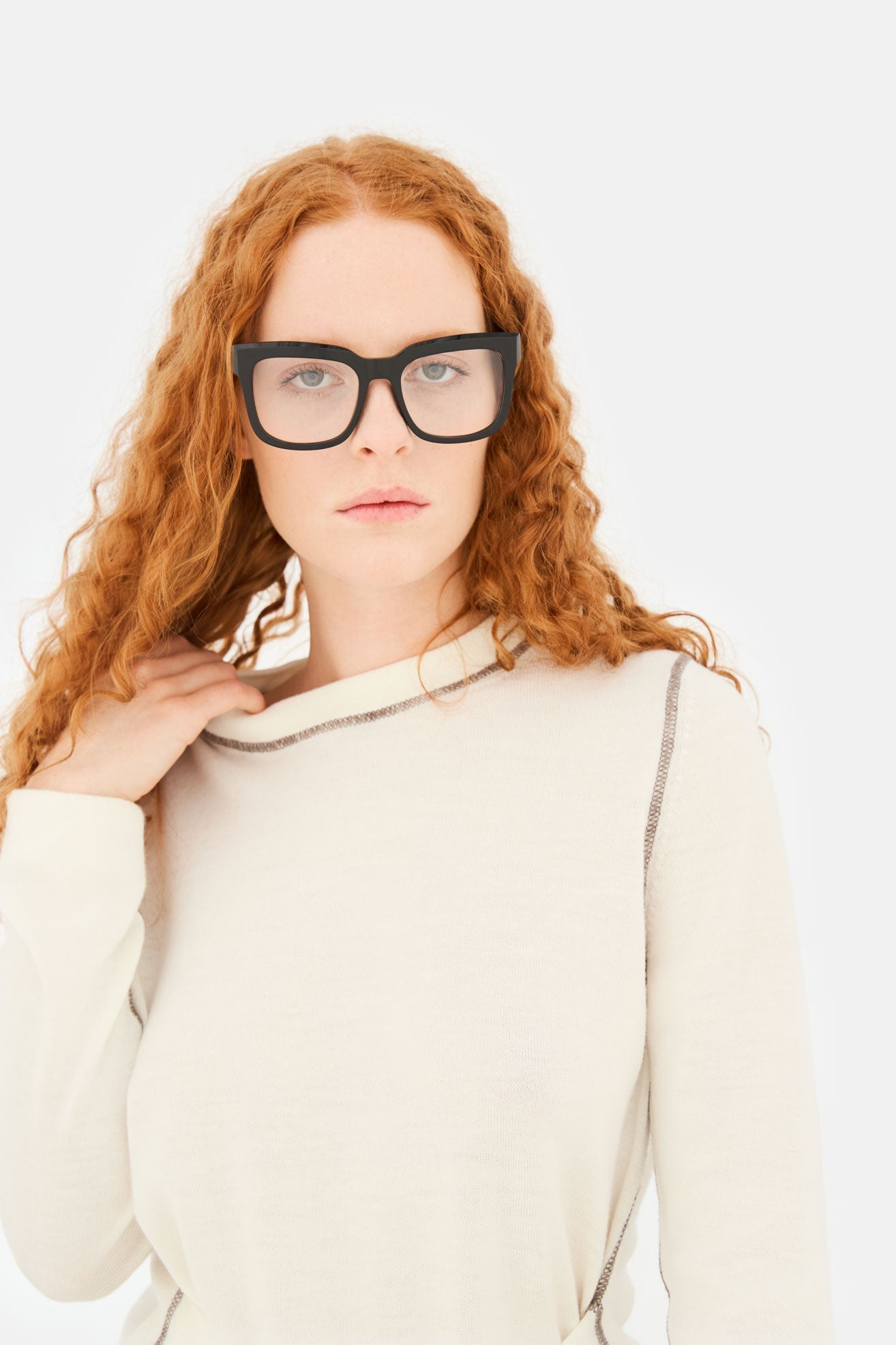 Acetato italiano de alta calidad en un clásico acetato negro. Lentes transparentes de pantalla en la base 4. Lentes graduadas no incluidas. Gafas premium diseñadas en Milán, Italia.
