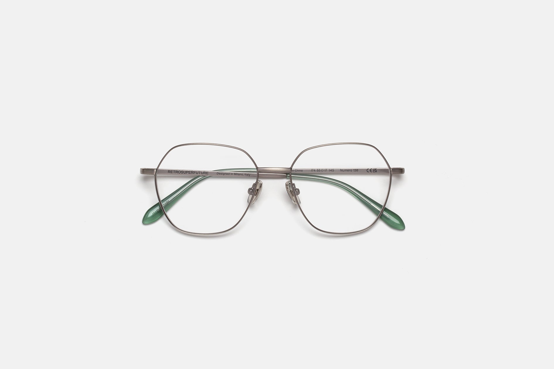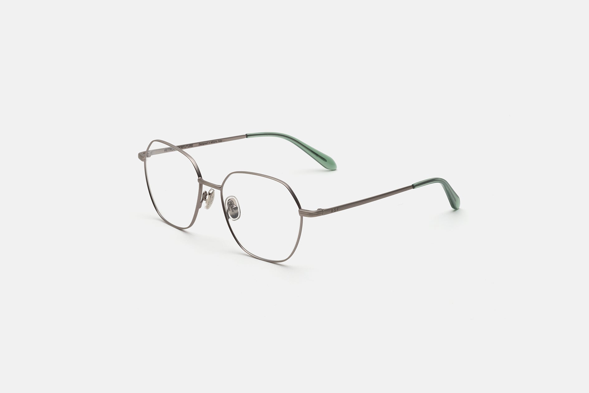Metal de alta calidad con acabado galvánico plateado mate y punta de acetato para un ajuste cómodo. Lentes transparentes en la base 4. Lentes graduadas no incluidas. Gafas premium diseñadas en Milán, Italia.