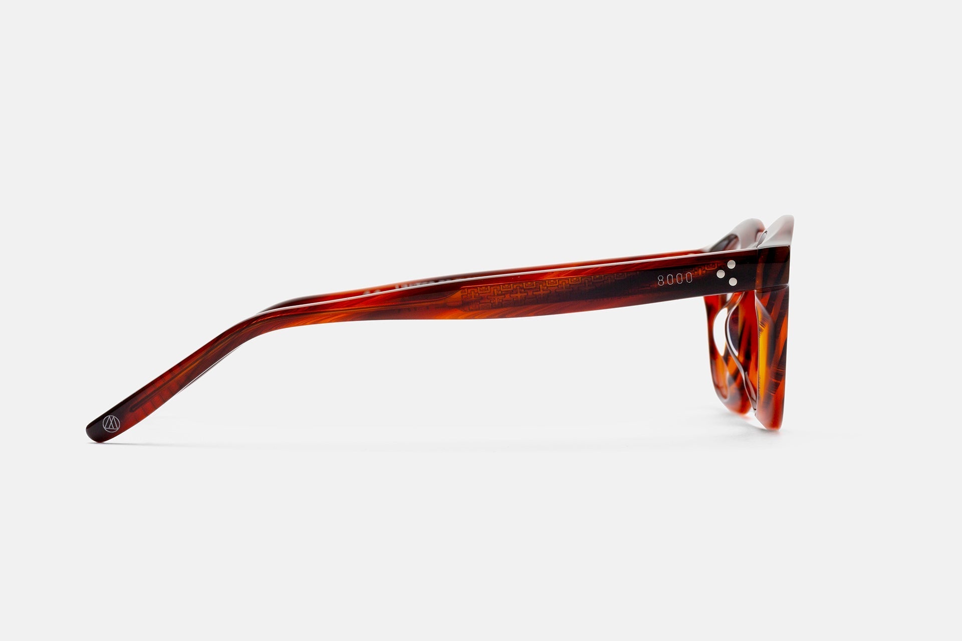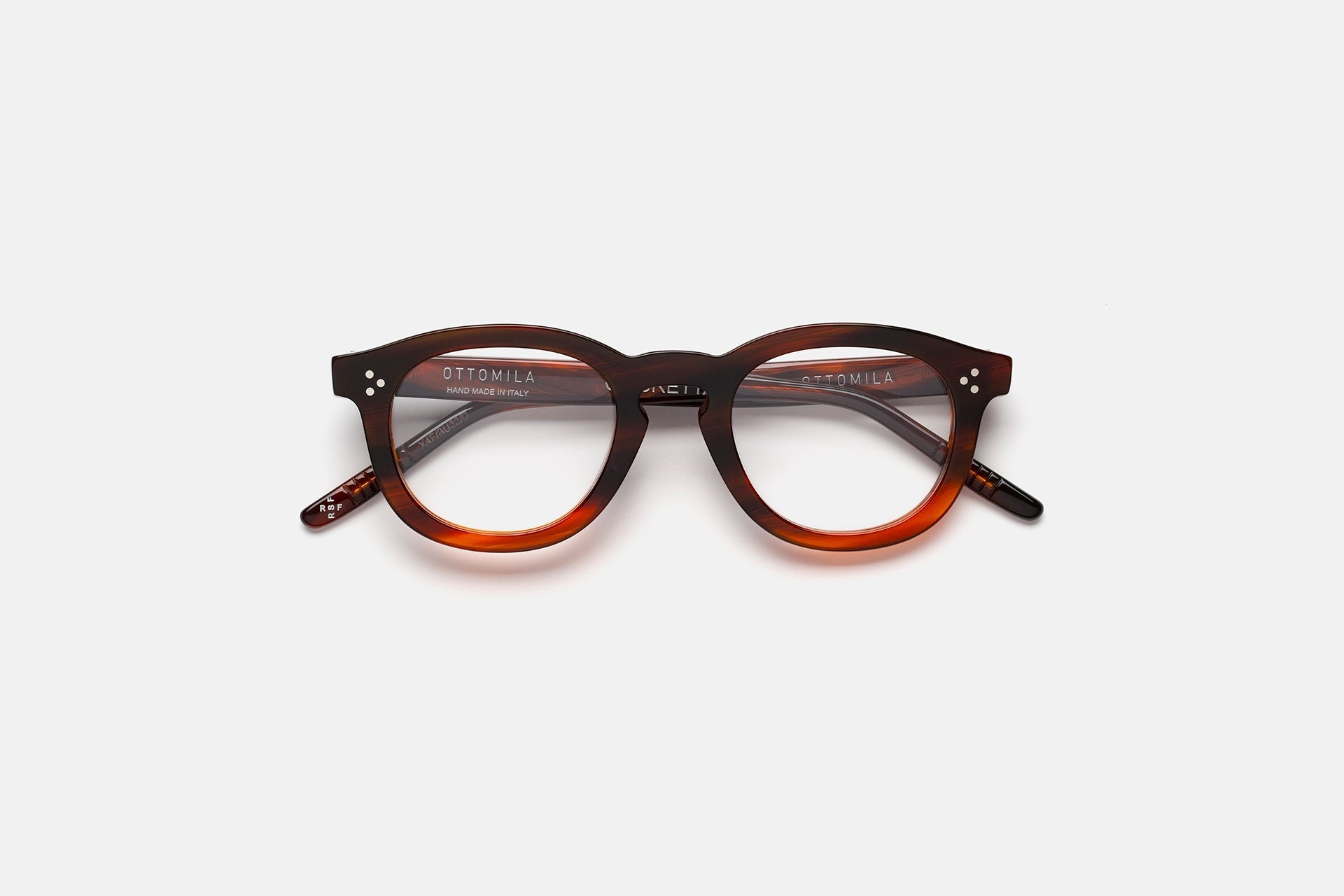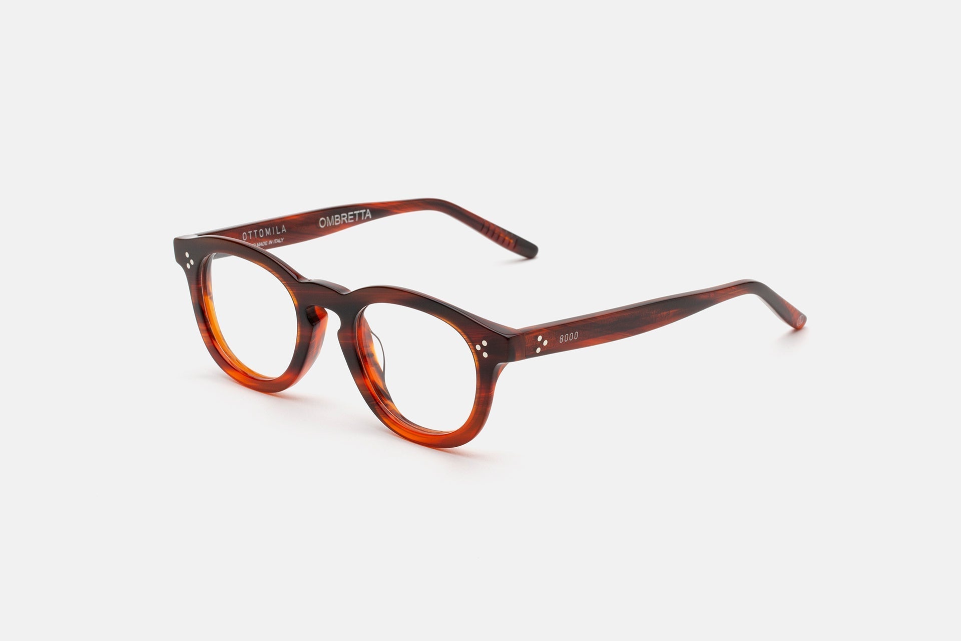 Creada para Ottomila, Ombretta es una interpretación contemporánea de una silueta muy familiar y atemporal: una montura caracterizada por sus curvas redondeadas y su puente nasal en forma de ojo de cerradura con tachuelas metálicas en el frente. El modelo cuenta con gruesos aros de acetato meticulosamente elaborados con bordes inclinados y tallados en el interior para conseguir ligereza, ajuste y comodidad. Se trata de una silueta discreta que se ve realzada por una artesanía excepcional y la atención a los detalles para los verdaderos conocedores de las gafas. Este modelo se presenta en acetato Habana a rayas.