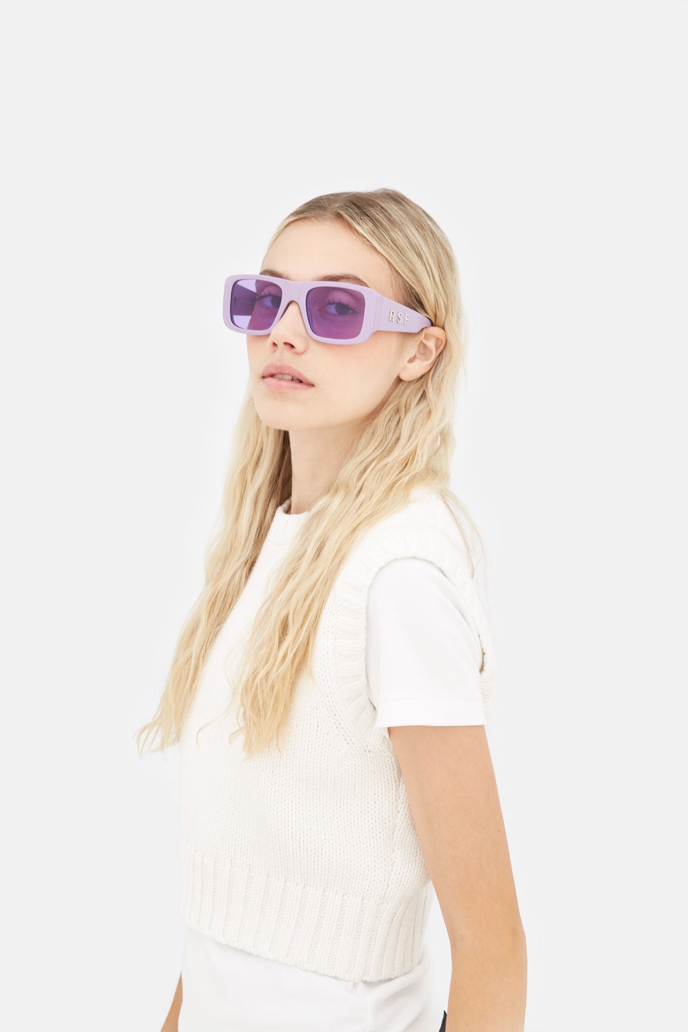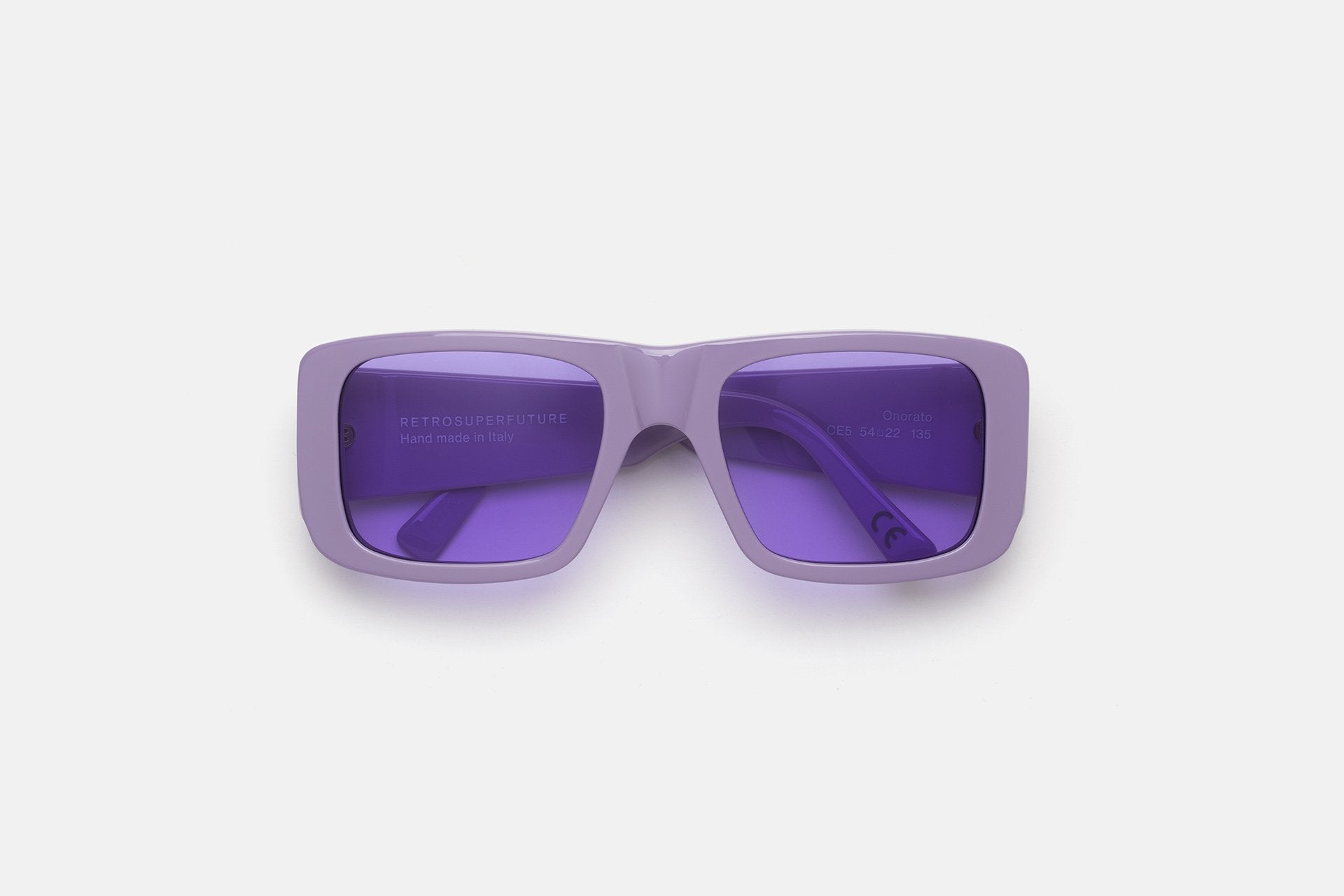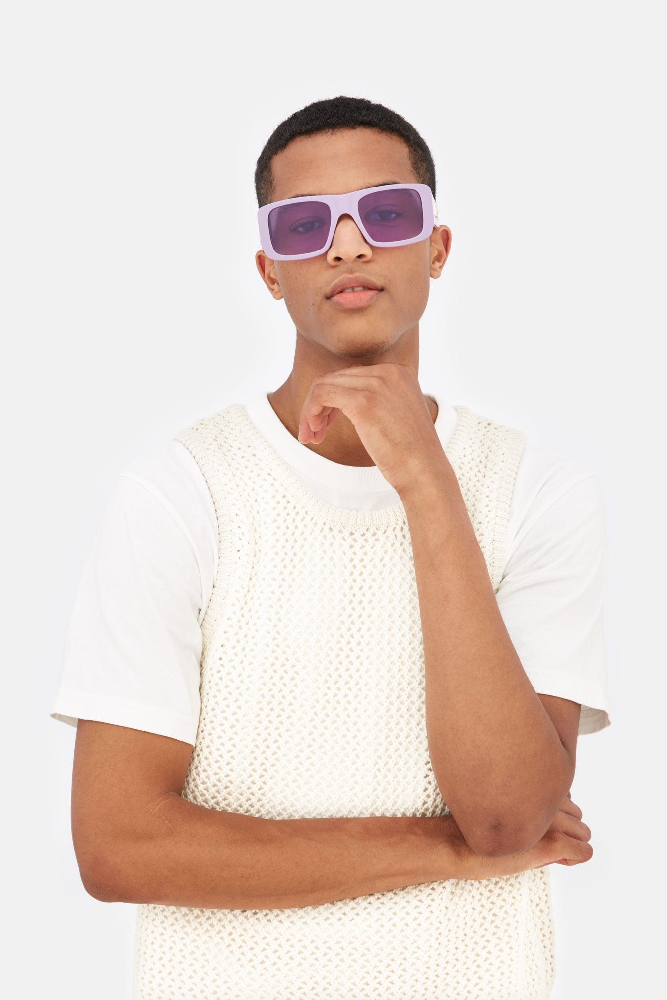 Onorato, una pieza clave de RSF, es un modelo inspirado en las referencias de los años 70, desde Aristóteles Onassis hasta Miles Davis. Onorato es una montura de acetato con un diseño robusto y sobredimensionado, que presenta una línea superior recta y un atrevido puente nasal. Los gruesos bordes de acetato se curvan alrededor de las patillas, a juego con sus distintivas puntas anchas. Sobredimensionada y con un toque callejero, esta versión viene con un acetato lila y lentes tintadas de color púrpura a juego.