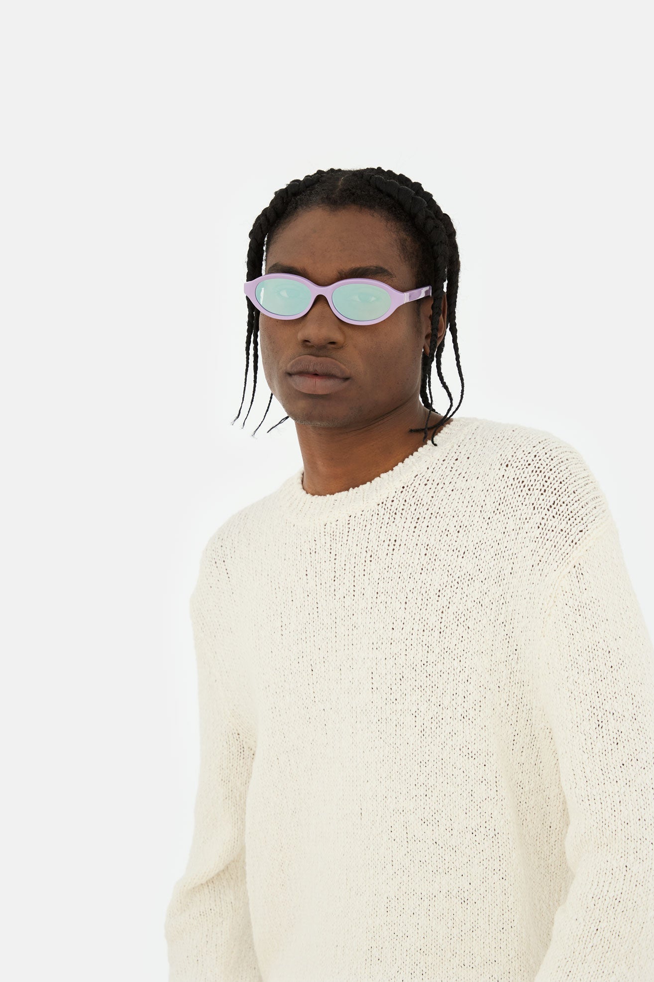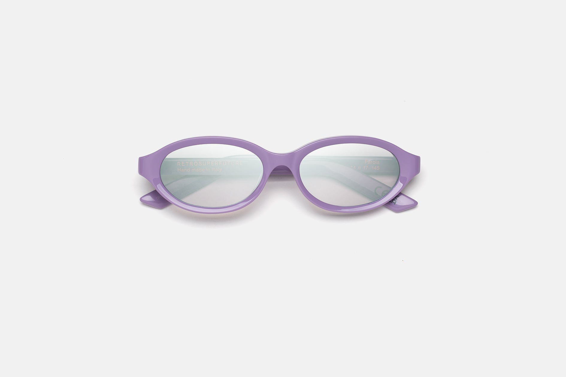 Acetato italiano de alta calidad en un suave y alegre tono lila. Lentes plateadas eléctricas flash únicas en la base 2. Gafas de alta gama hechas a mano en Italia.