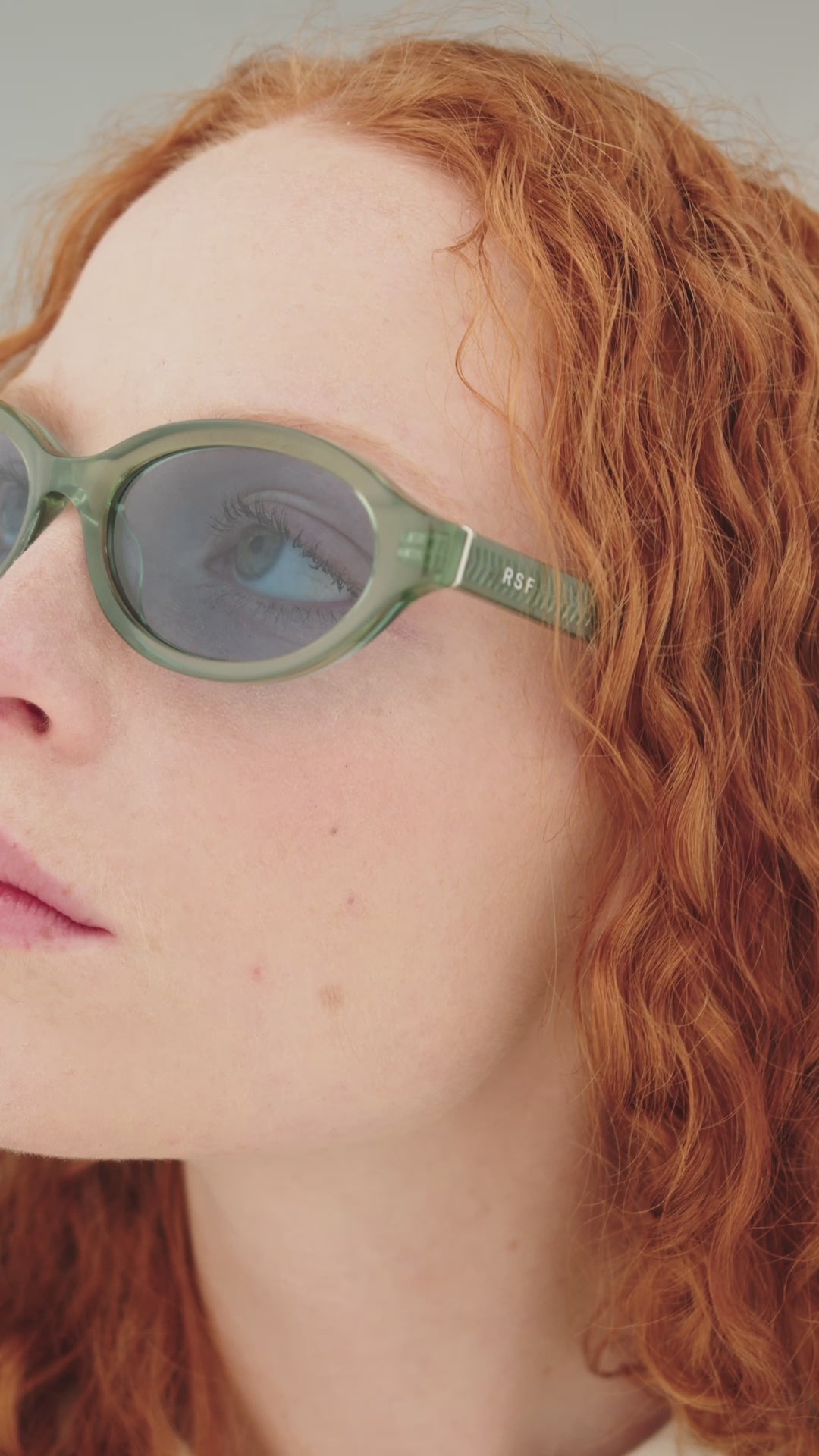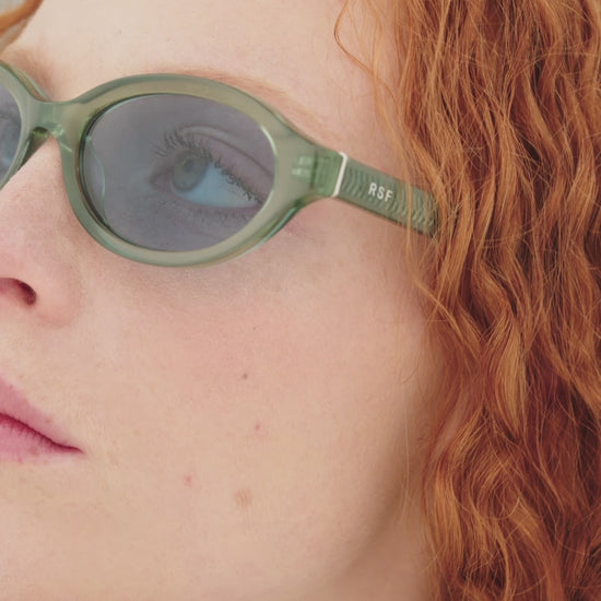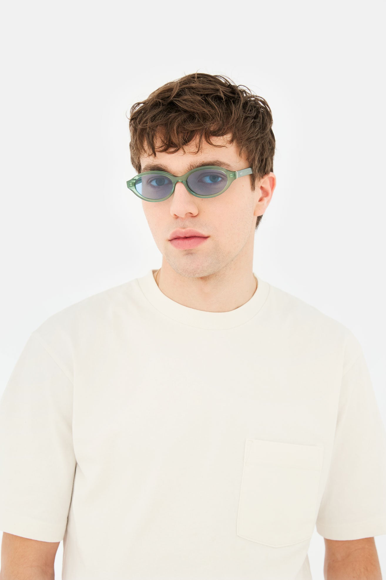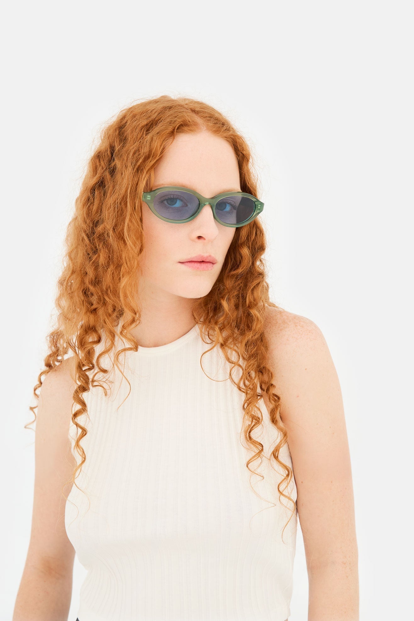 Acetato italiano de alta calidad en un elegante acetato verde salvia. Lentes azules Zeiss de base 2. Gafas de alta gama hechas a mano en Italia.