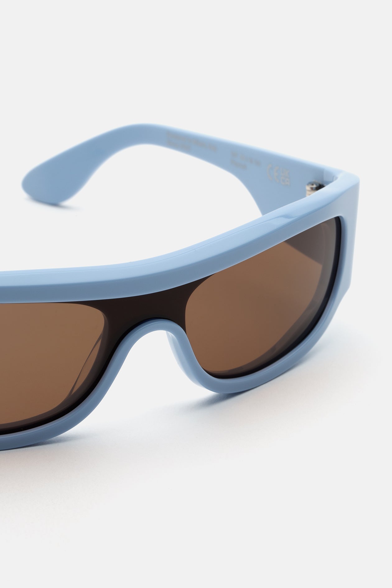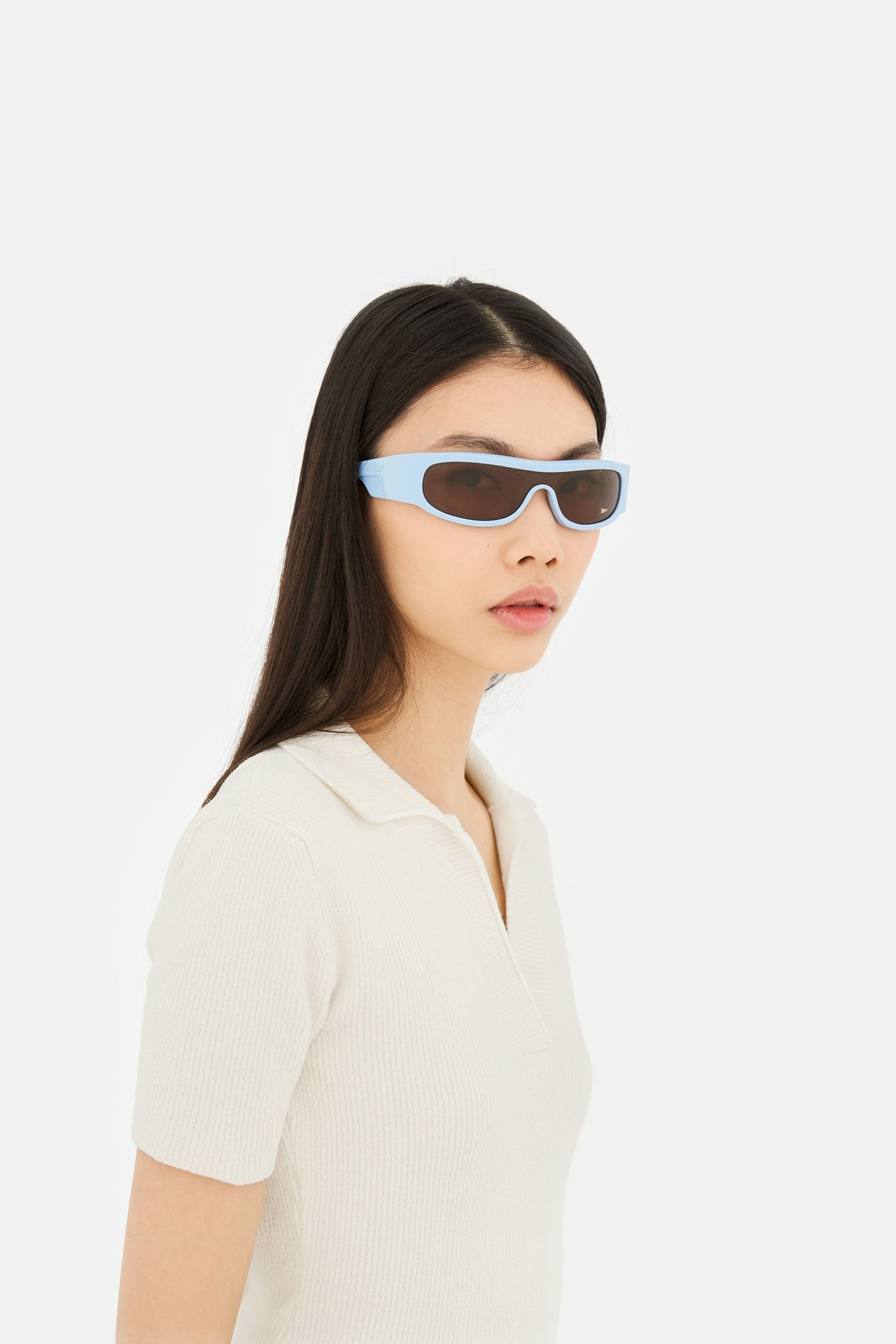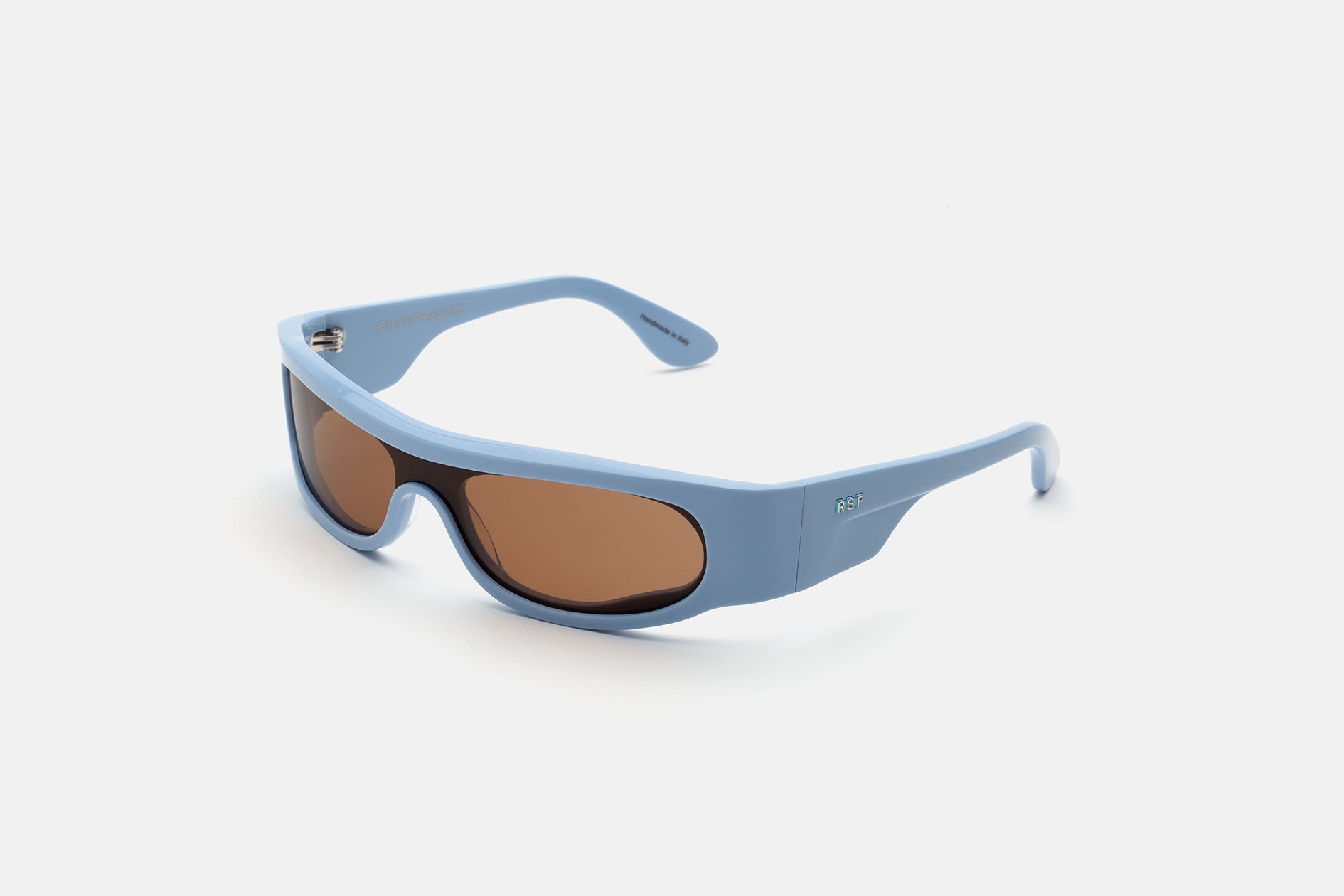 Acetato italiano de alta calidad en un suave acetato azul celeste. Montaje sobre escudo Zeiss azul en base 4. Gafas premium hechas a mano en Italia.