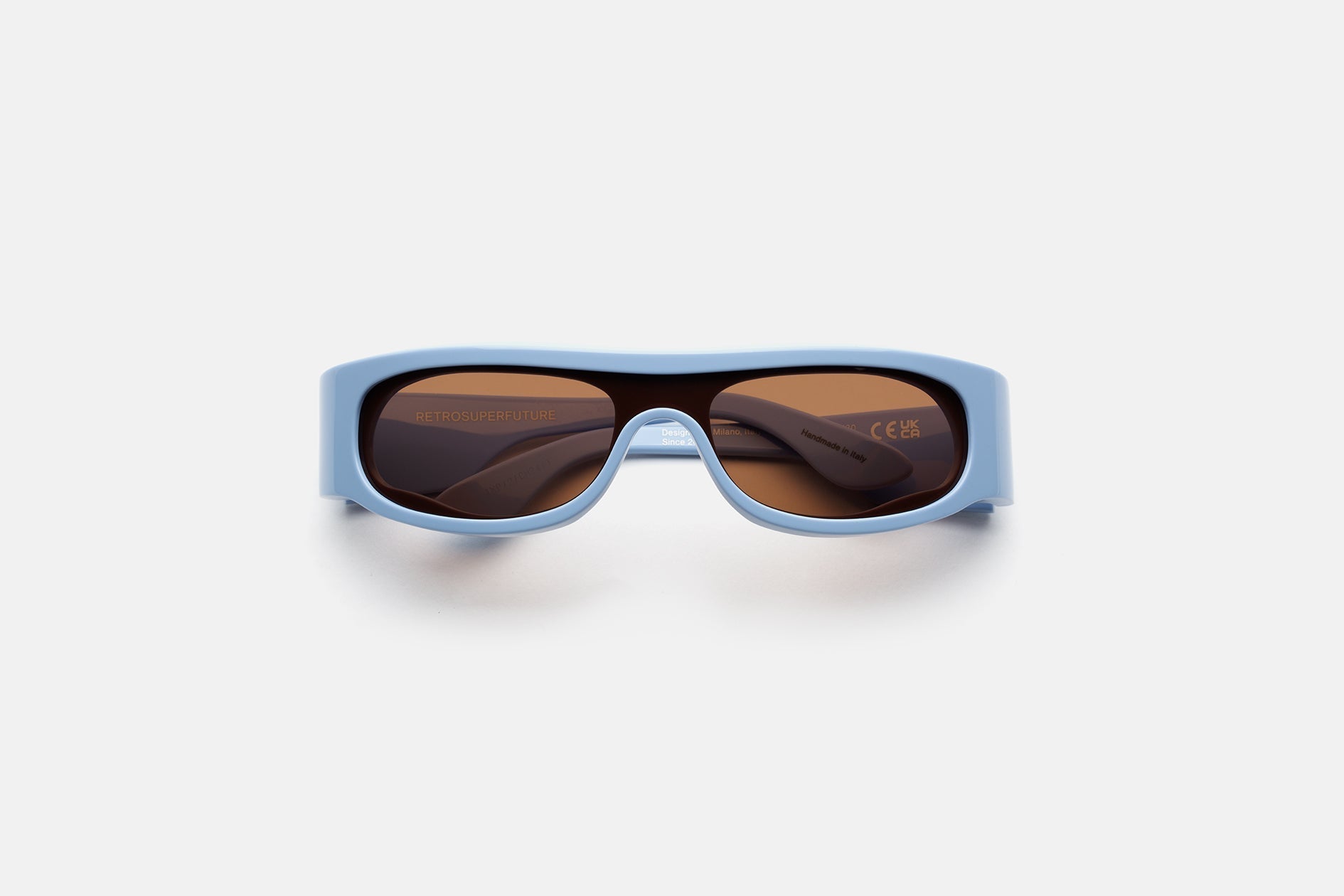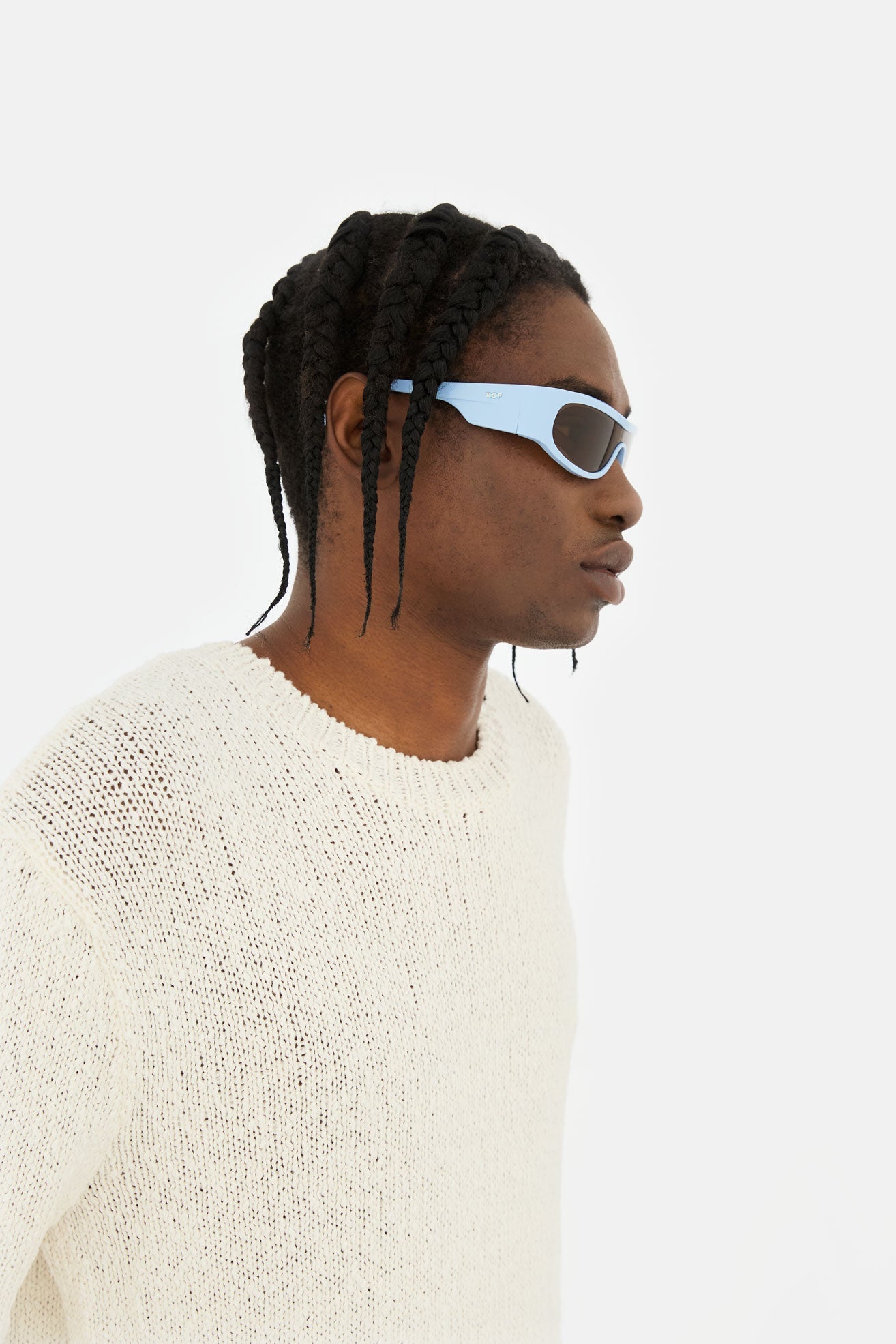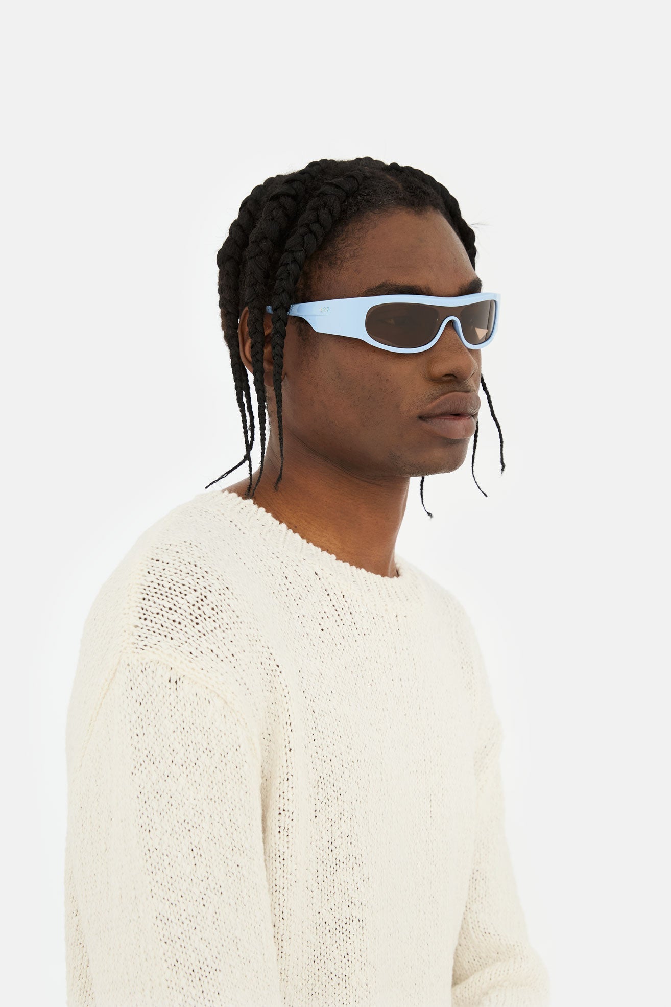 Acetato italiano de alta calidad en un suave acetato azul celeste. Montaje sobre escudo Zeiss azul en base 4. Gafas premium hechas a mano en Italia.