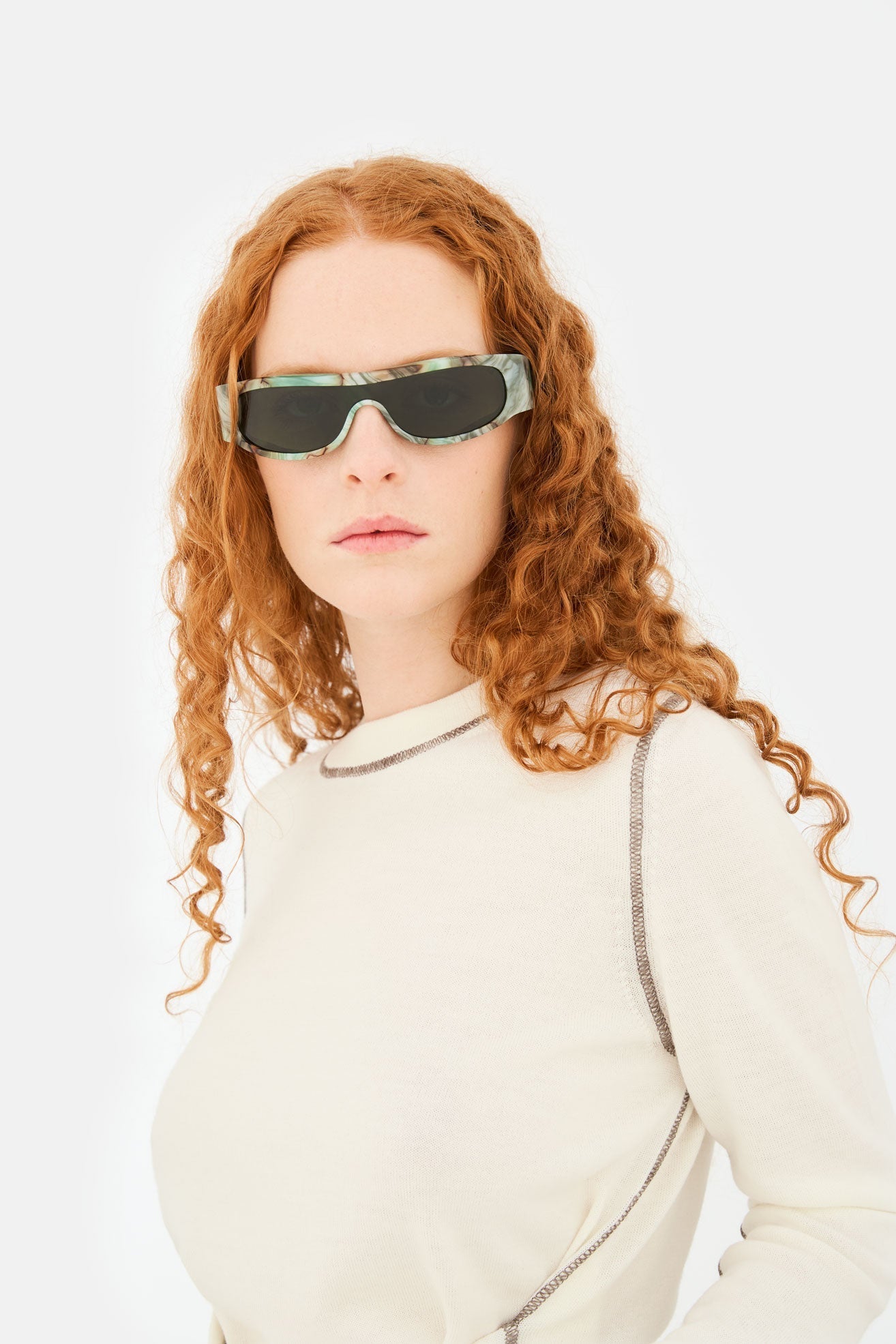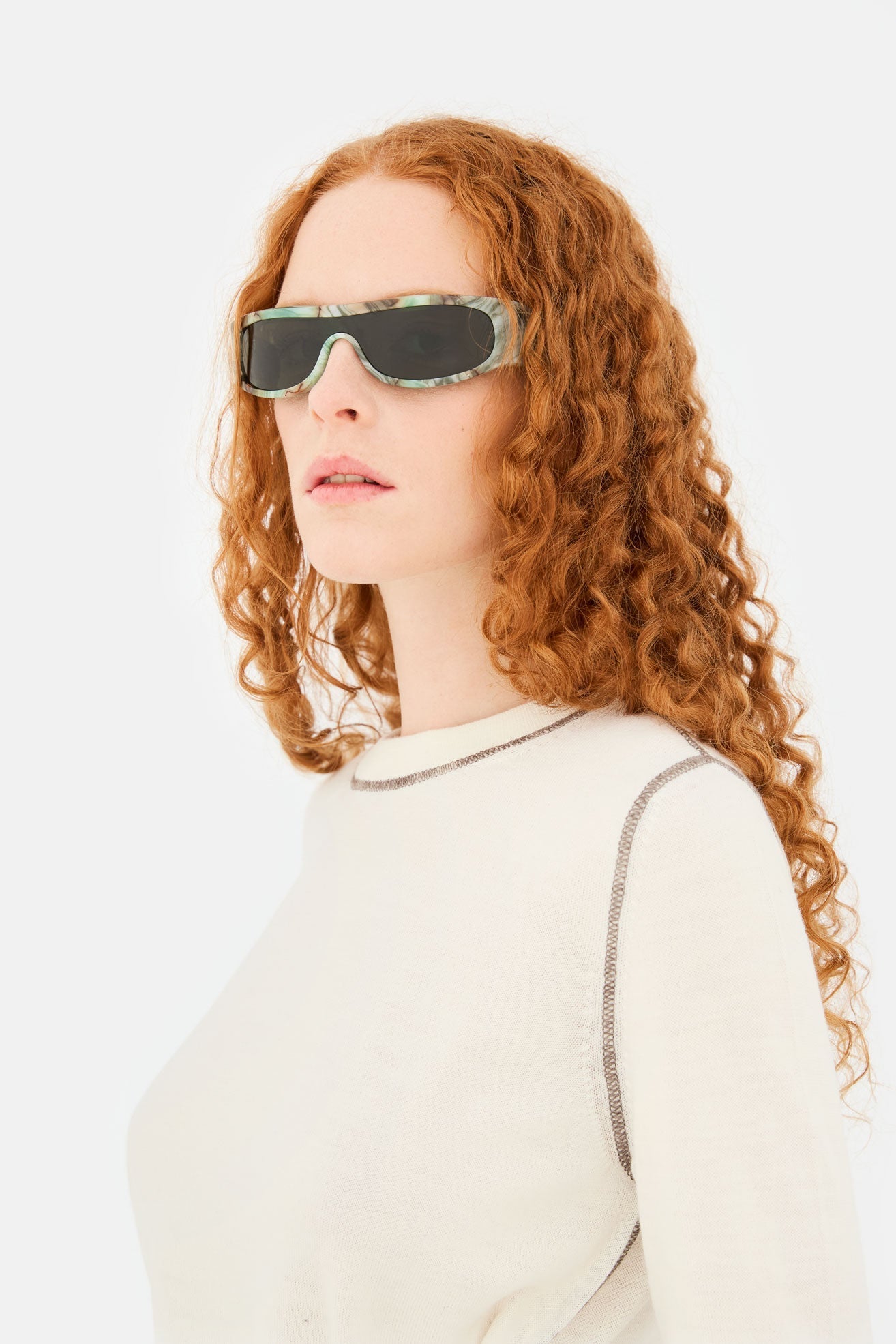 Acetato italiano de alta calidad en un acetato de ónix único y rico. Montaje sobre escudo verde Zeiss en base 4. Gafas premium hechas a mano en Italia.