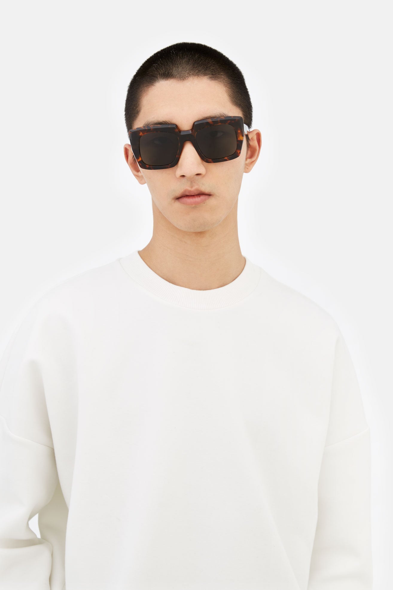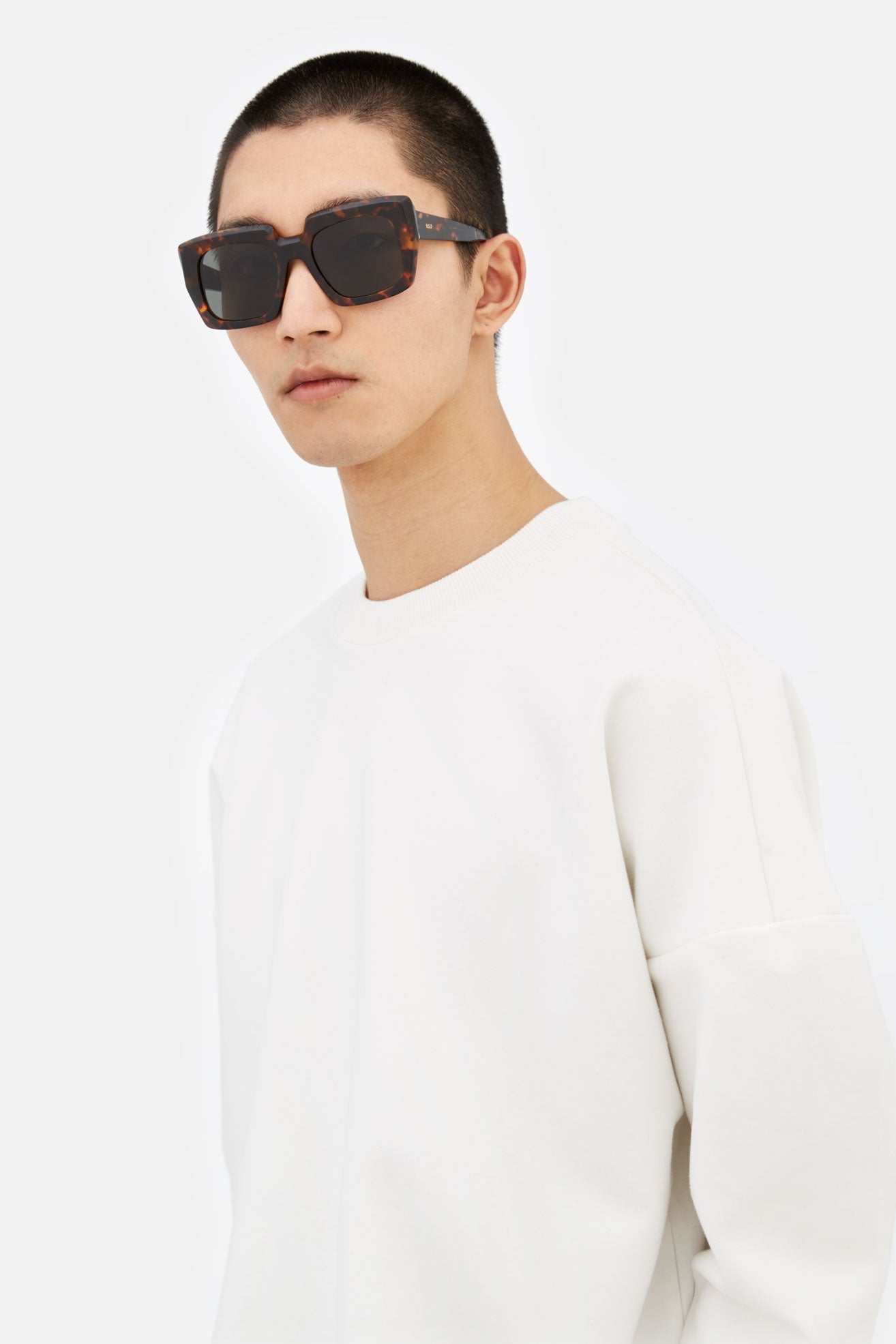Piscina es un modelo de gafas que se caracteriza por su exclusivo diseño geométrico, sus llamativas lentes de gran tamaño y sus gruesos bordes esculpidos. El modelo se inspira en la estética exagerada de finales de los 70, reinterpretada con una sensibilidad contemporánea más vanguardista. Piscina, un diseño unisex, presenta gruesos bordes en la línea superior, cincelados para formar un perfil inclinado y elegante. Unas patillas atrevidas y un grueso puente completan este modelo lleno de carácter. Esta versión se presenta en un acetato habana único y rico con lentes negras.