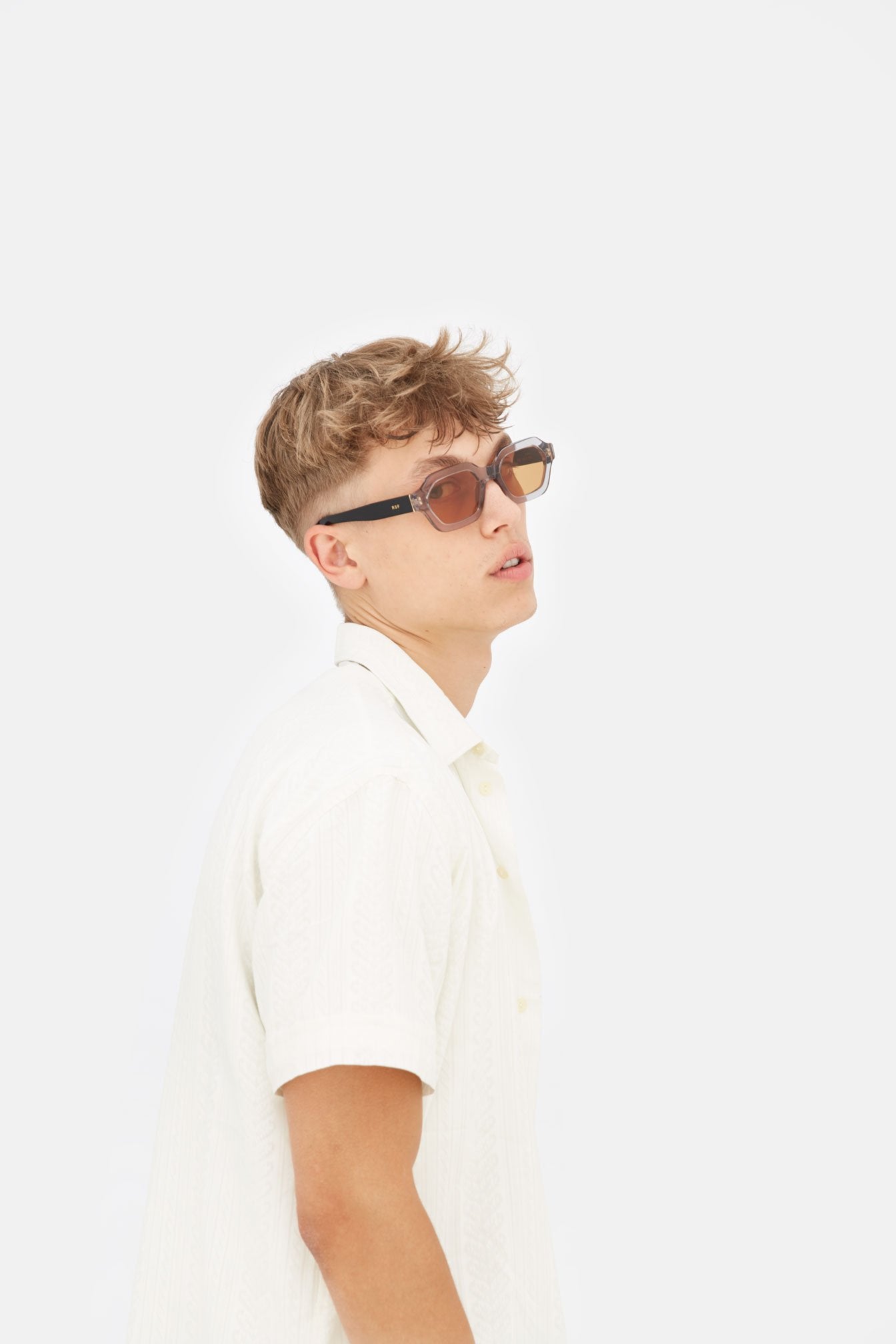 Un par de gafas de sol con una historia que contar: Pooch se inspira en el chico más guay del barrio, el que siempre rompe las normas y experimenta con el estilo. Pooch, un modelo destacado, es una silueta icónica con una forma hexagonal única y lentes anchas encerradas en su gruesa construcción de acetato. Una silueta con un marcado carácter callejero, con un puente nasal bajo y patillas angulosas. Este modelo se presenta en acetato translúcido cálido para la montura frontal con patillas negras y lentes tintadas en marrón.