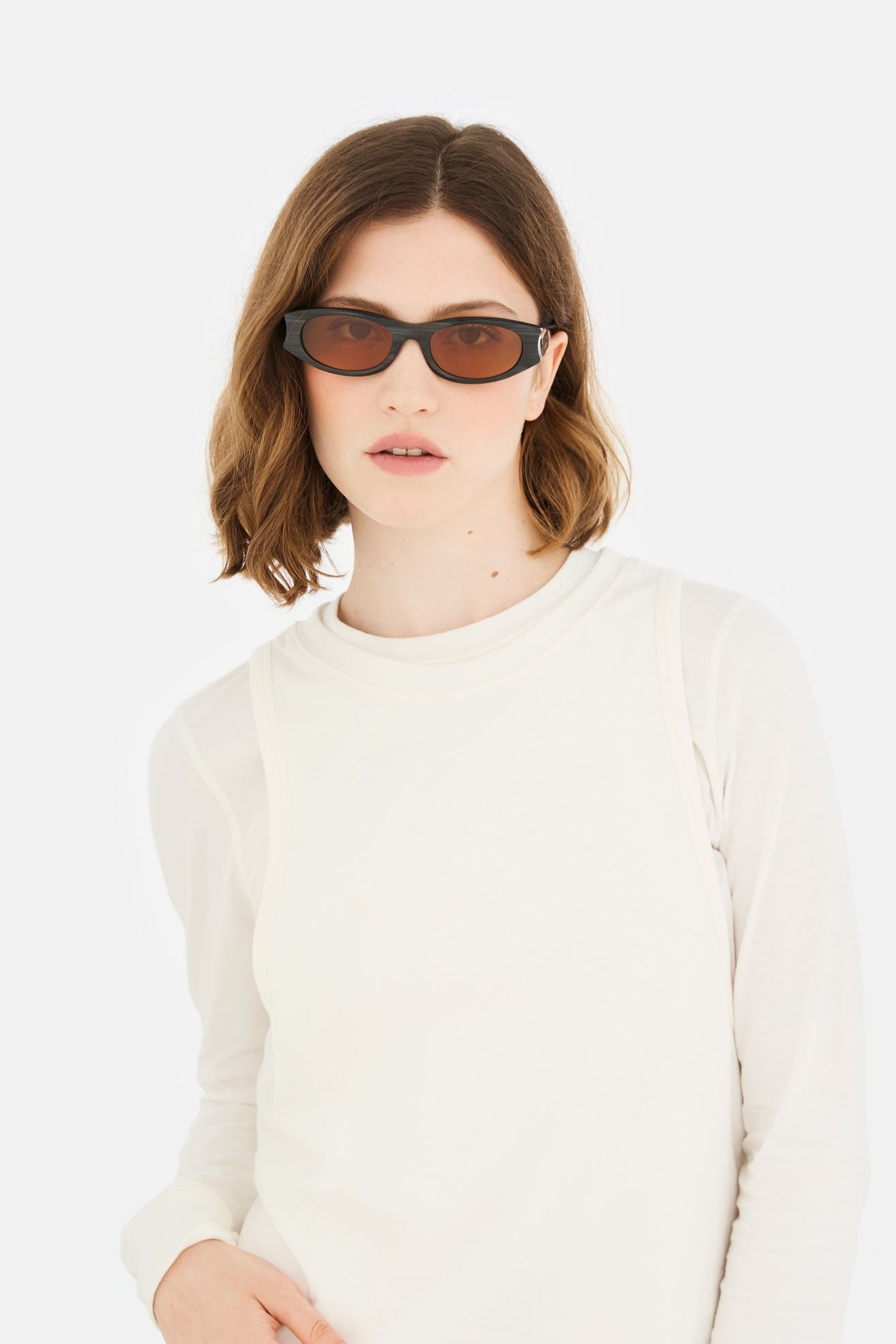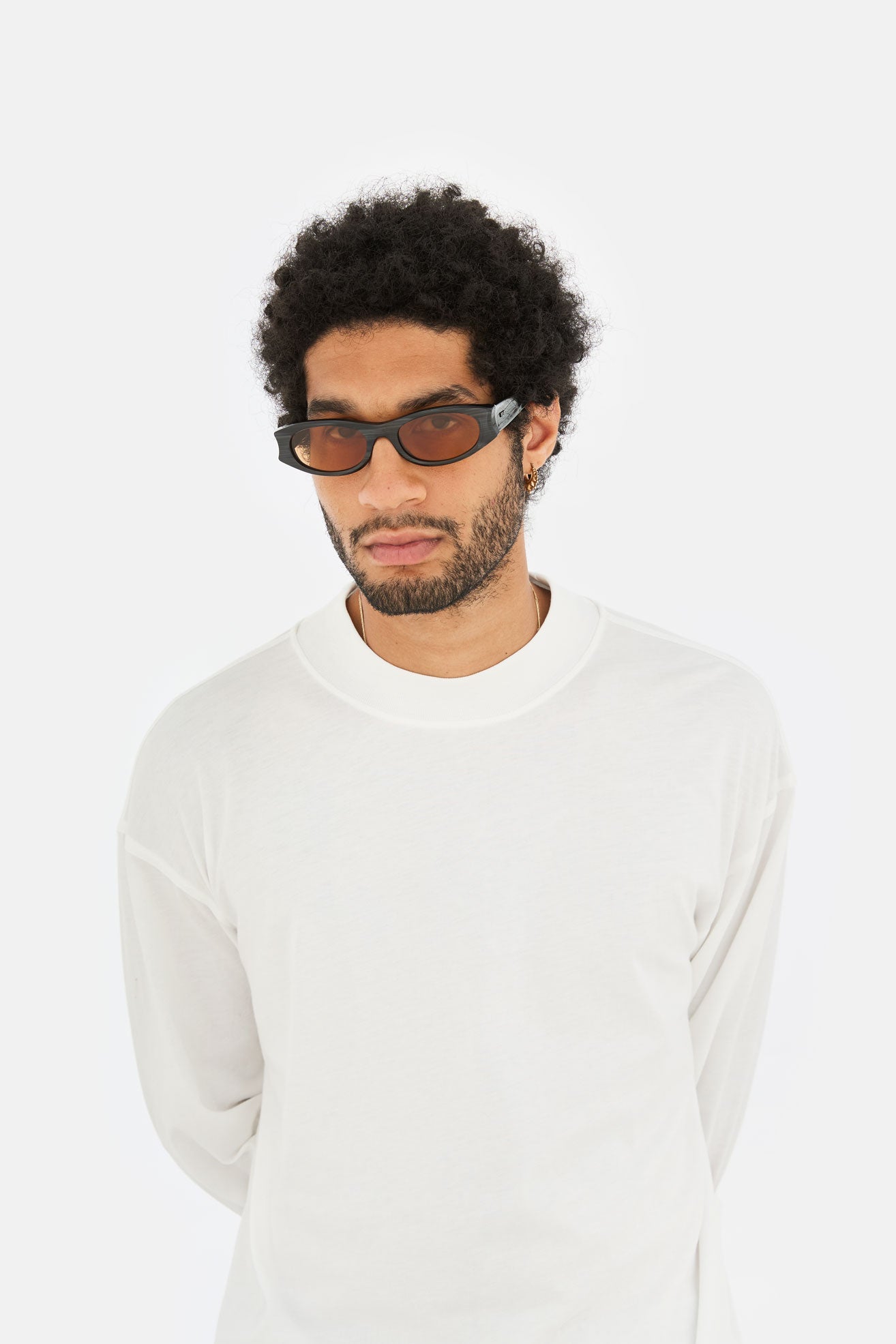 El cohete viaja rápido. Su exclusivo diseño bajo une la estética de la moda Y2K con las monturas cruzadas impregnadas de cultura deportiva. El diseño único de sus patillas se extiende hacia los lados para crear patillas excepcionales de acetato termoformado, lo que subraya su artesanía y su carácter distintivo y de ritmo rápido. Para esta versión de Razzo, un acetato negro a rayas único se combina con lentes cálidos característicos. Hecho a mano en Italia.
