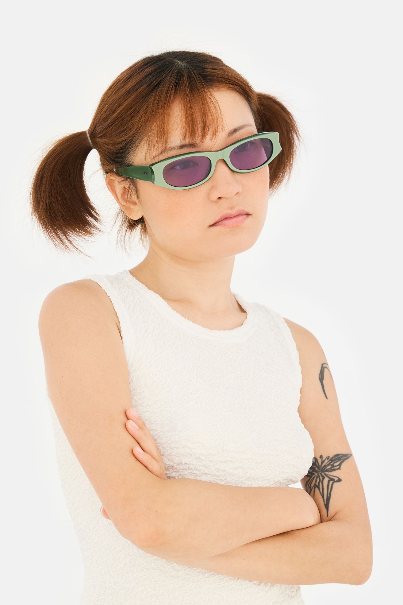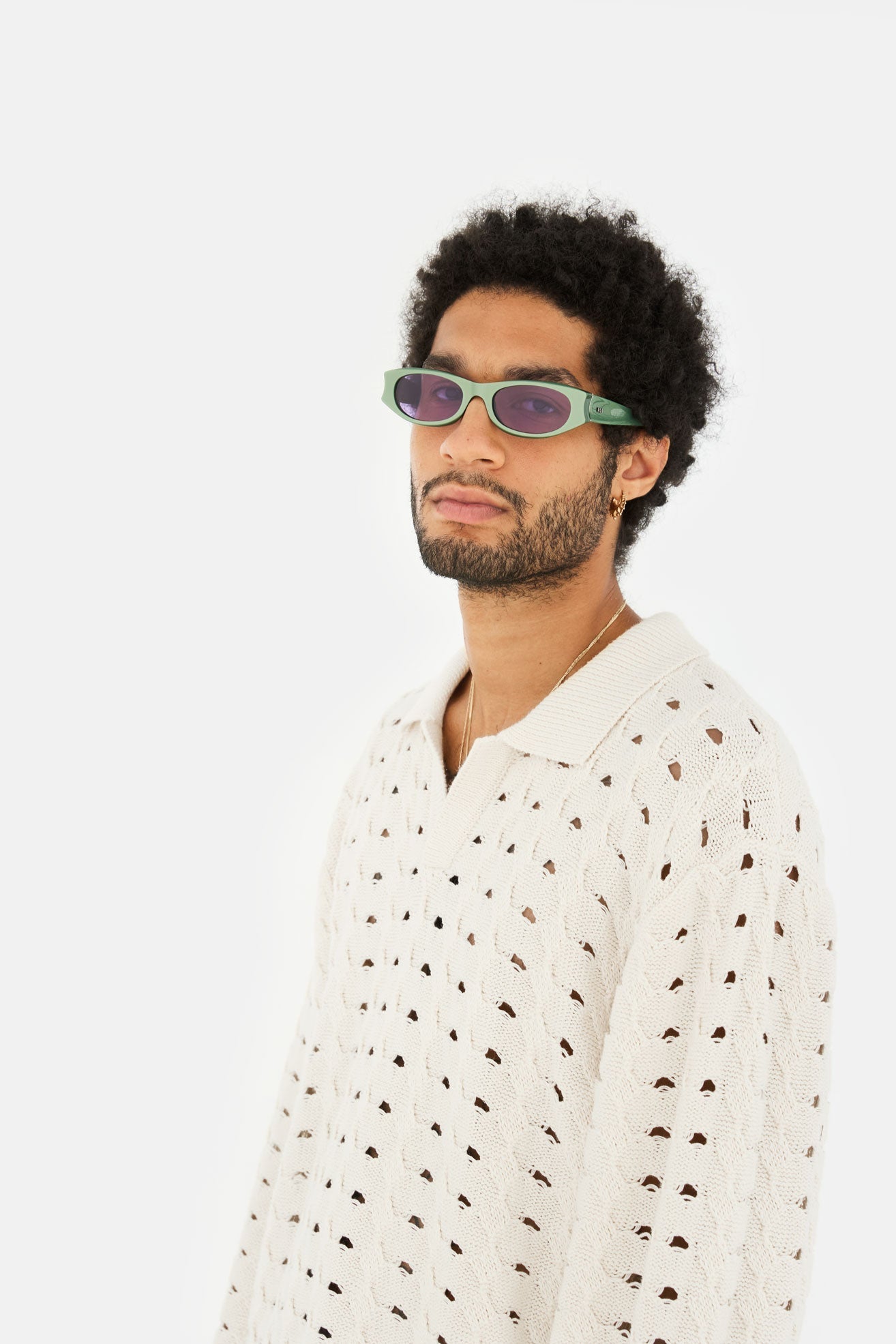 El cohete viaja rápido. Su exclusivo diseño bajo une la estética de la moda Y2K con las monturas cruzadas impregnadas de cultura deportiva. El diseño único de sus patillas se extiende hacia los lados para crear patillas excepcionales de acetato termoformado, lo que subraya su artesanía y su carácter distintivo y de ritmo rápido. Para esta versión de Razzo, un excepcional acetato de color salvia metálico se combina con lentes de color violeta intenso. Hecho a mano en Italia.