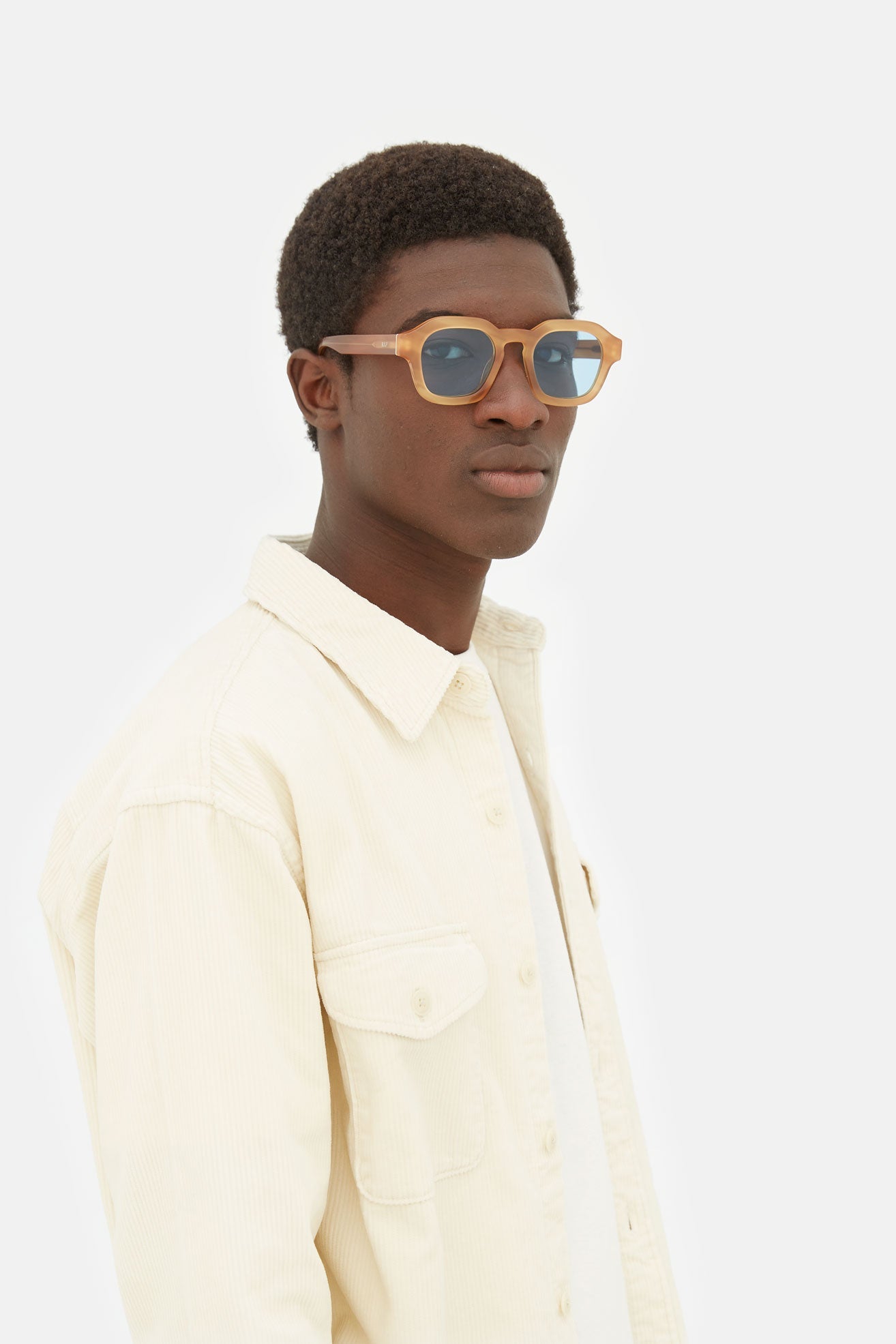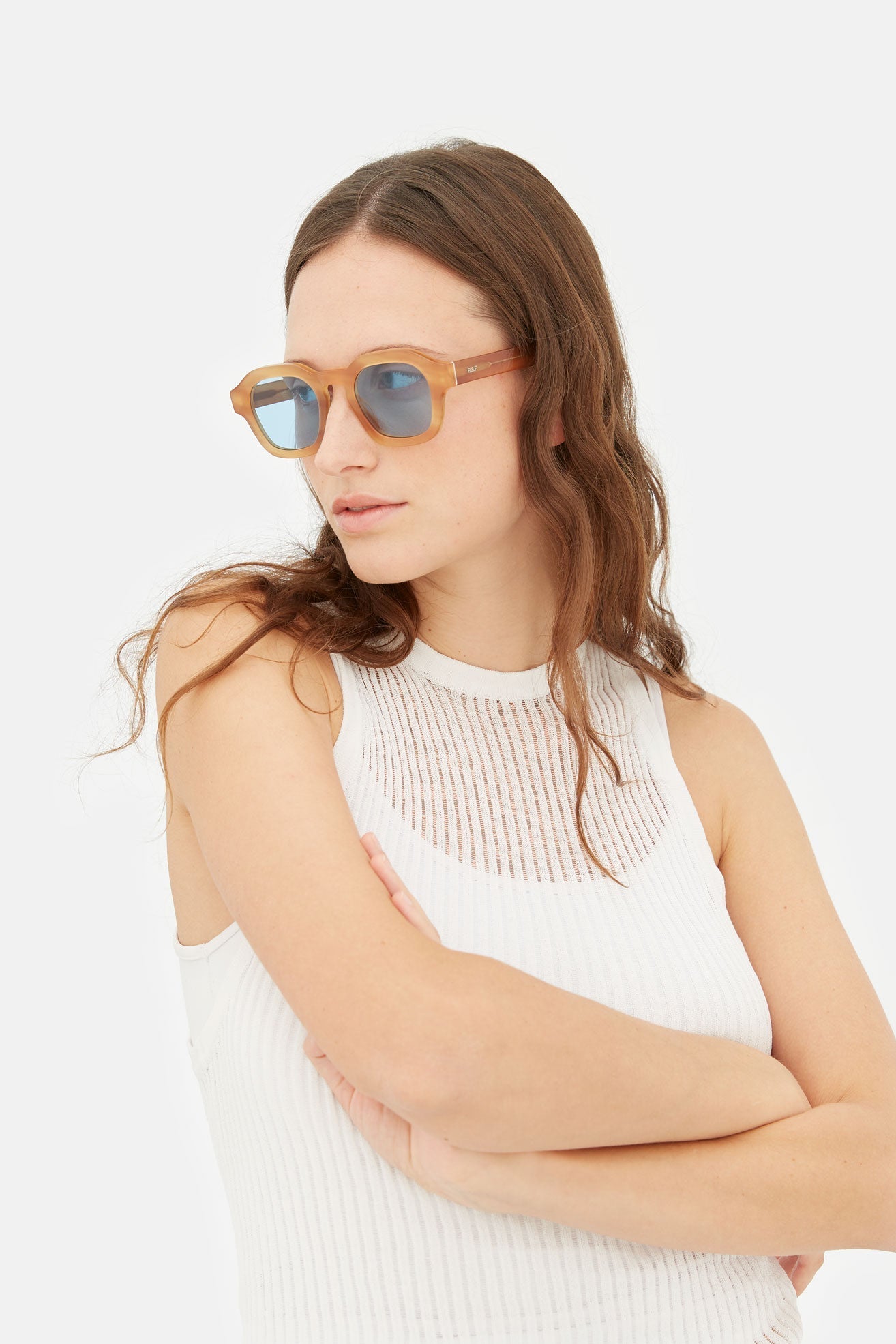 Saluto es una silueta elegante que subraya la comprensión del estilo atemporal: a la vez familiar y esencial, pero manteniendo la frescura y la contemporaneidad, este modelo está concebido como un verdadero clásico instantáneo. Una versión más sofisticada de las conocidas formas redondeadas y ajustadas, Saluto presenta un diseño hexagonal con una línea de cejas elevada para un ajuste ligeramente sobredimensionado. Un icono audaz pero discreto para el siglo XXI, Saluto se presenta en un acabado beige arena con lentes azules tintadas.