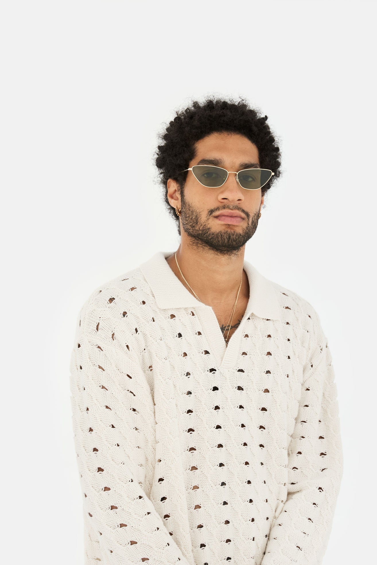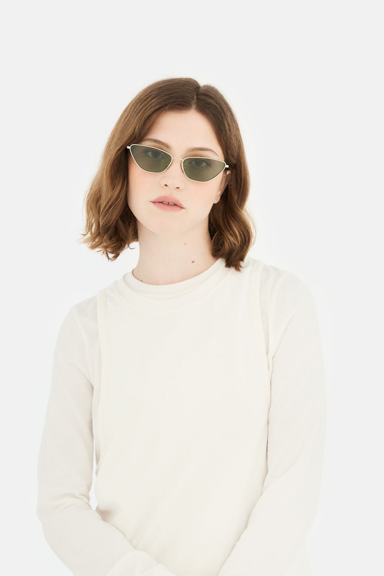 Spillo luce un diseño minimalista, realzado por líneas elegantes y estilizadas que ofrecen una estética refinada. Su montura metálica personalizada de corte limpio en dorado se combina con lentes de cristal mineral verde esencial de Barberini. Las plaquetas nasales ajustables de diseño personalizado y las elegantes patillas de acetato permiten un ajuste cómodo y personalizado. Hecho a mano en Italia.