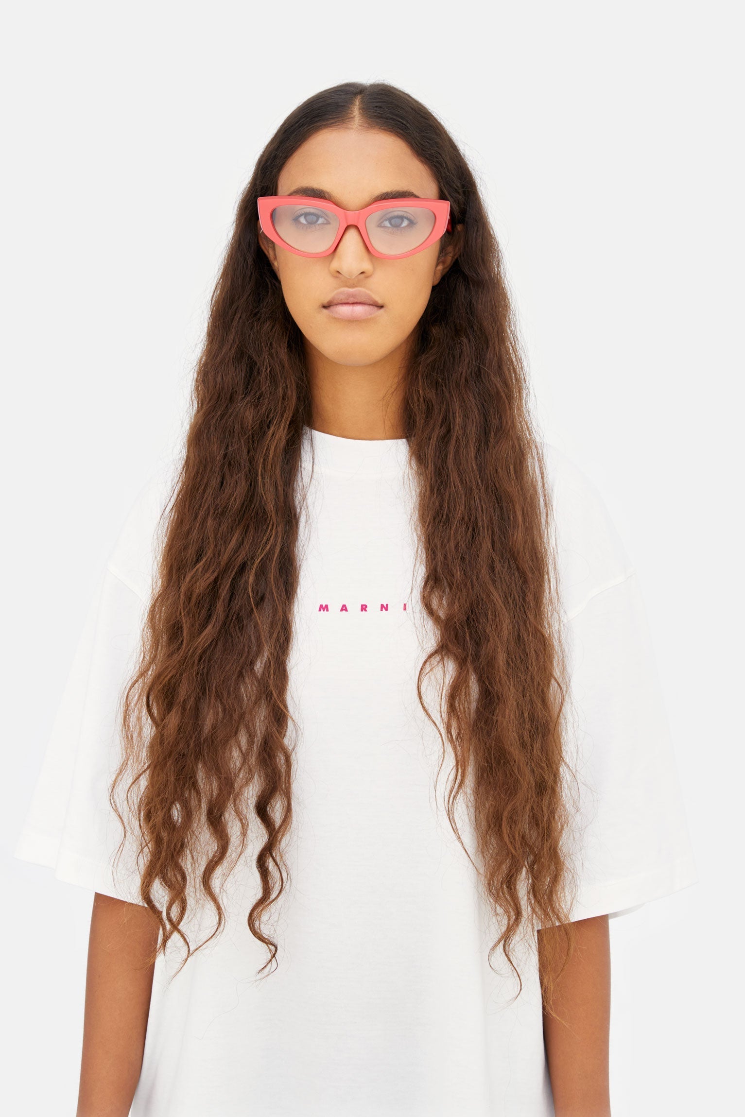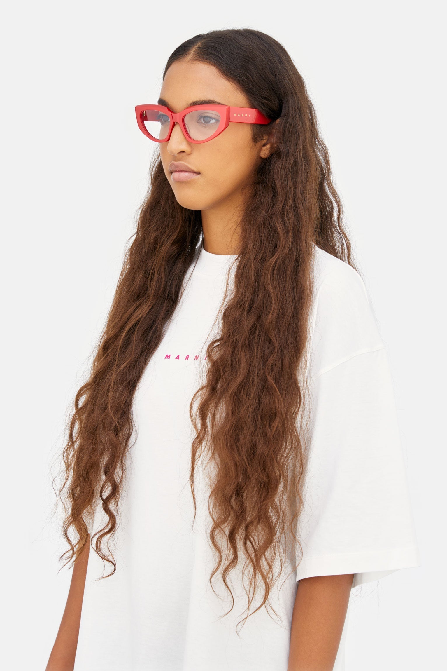 Diseñada en exclusiva para Marni, Tahat es una interpretación geométrica de las clásicas monturas de ojo de gato. El modelo presenta un perfil angular afilado, con gruesos bordes alrededor del puente de la nariz y las patillas. Los bordes se han cortado de perfil, acentuando así la geometría única de la montura. Las patillas gruesas completan esta silueta afilada para el día a día. Esta versión de Tahat se presenta en acetato rojo metalizado.