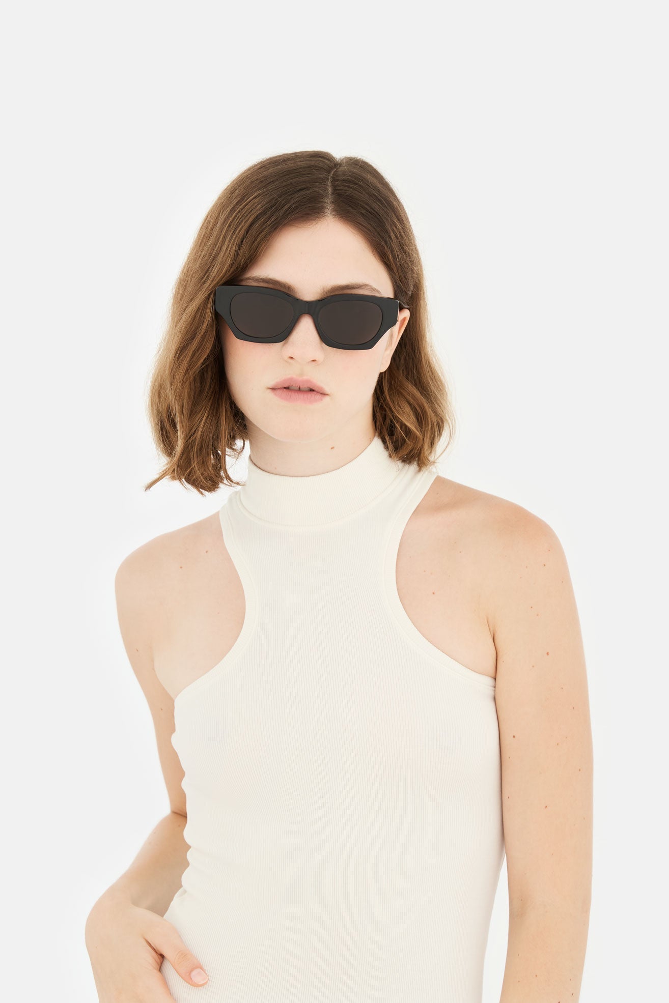 Tono definitivamente marca la pauta, con su forma robusta que resalta sus curvas y cortes únicos. La montura se basa en fuertes bases clásicas mientras coquetea con la moda, dando como resultado una silueta unisex única y decidida. Esta versión del Tono viene en un atemporal acetato negro brillante con lentes Zeiss extra negras a juego. Hecho a mano en Italia.