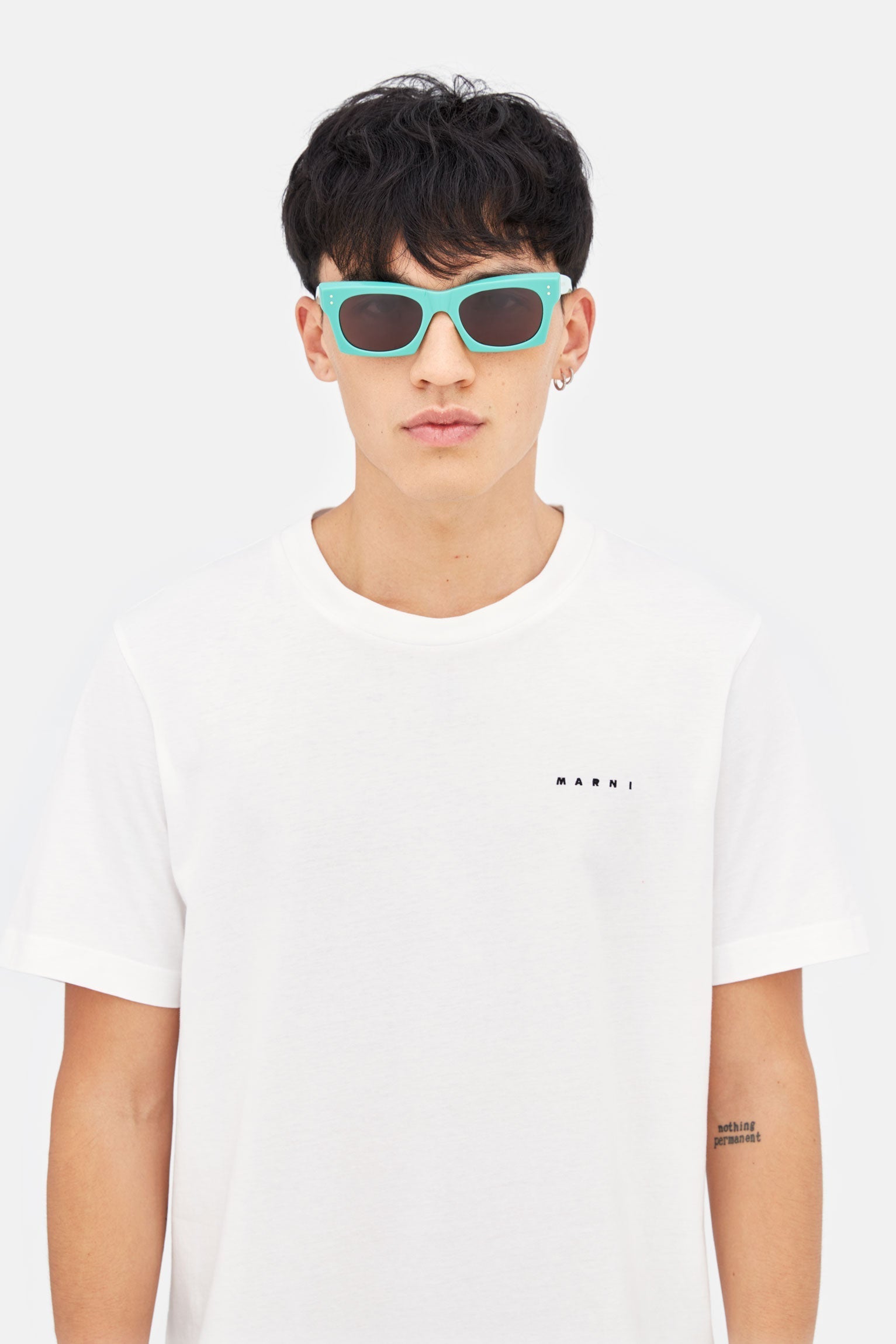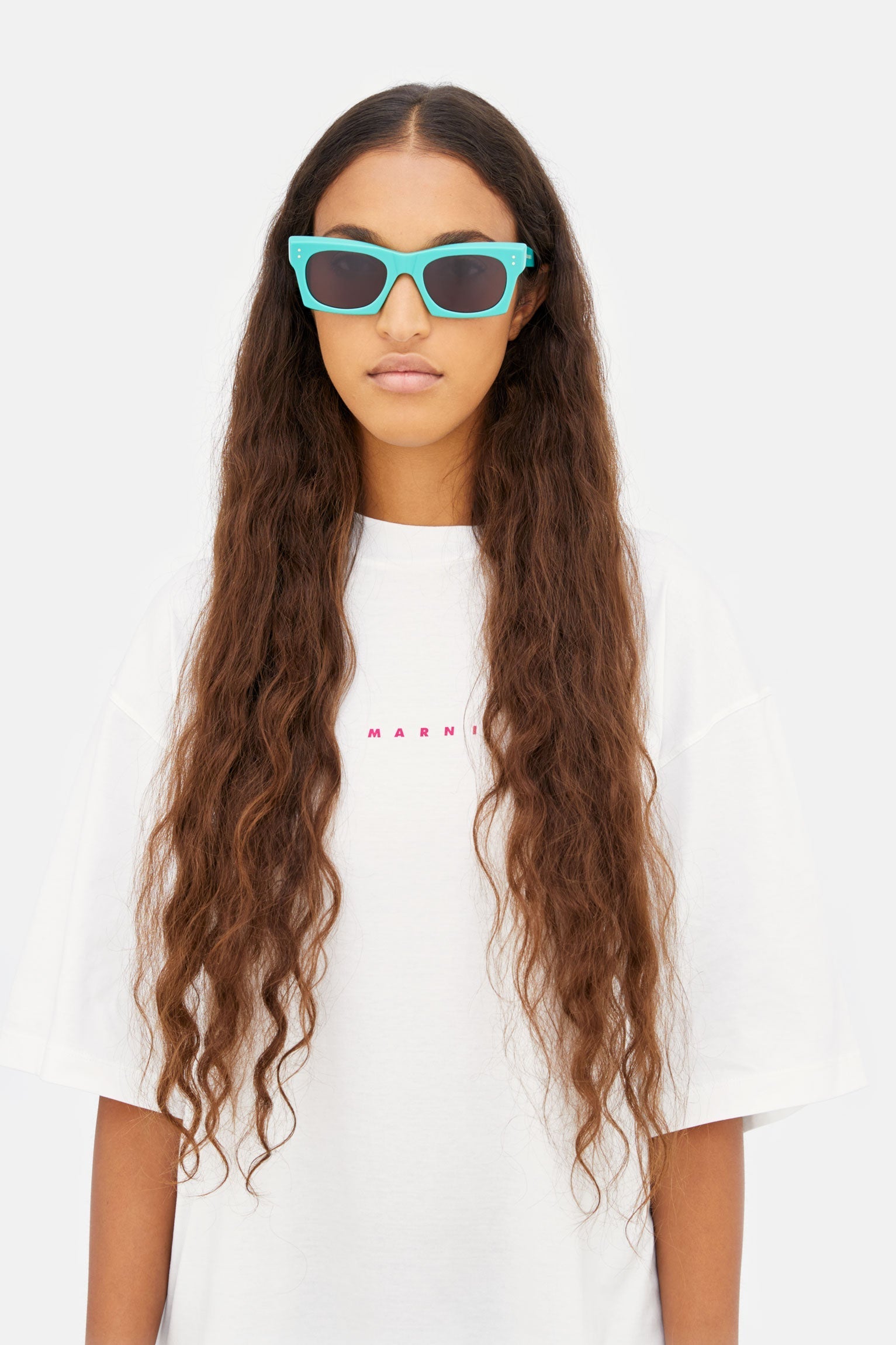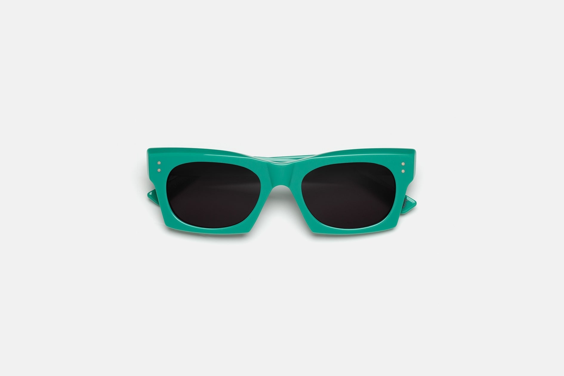 Diseñado exclusivamente para Marni, Edku es una silueta angular y precisa concebida como una interpretación elevada de la expresión de las gafas de uso diario. El modelo presenta una construcción de acetato grueso y resistente, con lentes ovaladas colocadas dentro de bordes geométricos afilados. Los bordes tallados e inclinados en la sección superior de las lentes resaltan la geometría determinada del modelo. Esta versión de Edku viene en un acabado verde metálico único y elegante con lentes negras ahumadas.